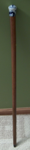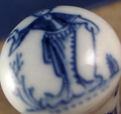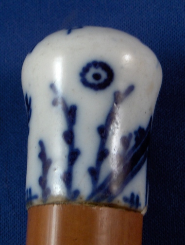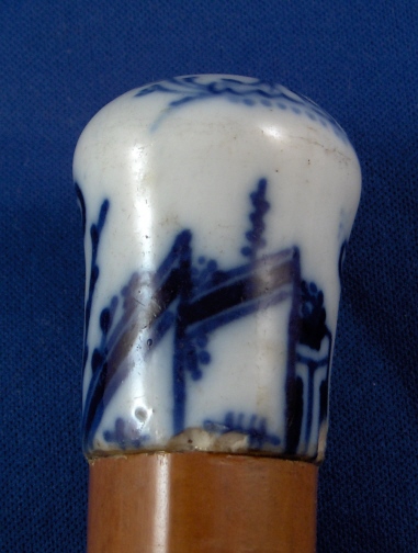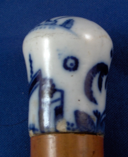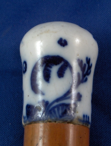 This is a cane handle made by St-Cloud during the first quarter of the 18th century. This one comes attached to a wooden cane that might be original but definitely has some good age to it. The handle is softpaste porcelain and nicely handpainted with the typical underglaze blue decoration but a rare Chinoiserie design of a person with a cane to the top which I have never seen before! An unusual pattern all around as well. This cane handle is in great condition with some small chips around the bottom edge where it touches the wooden cane. To be exact there are three chips but two are right next to each other. They don't really distract from the beauty of this fun piece. Some of the top clearcoat glaze is worn from use but it's fairly minor compared to other examples I have seen/owned. It is unmarked as far as I can see since it is attached but that is the norm anyway. The handle is 1.75 inches tall and 1.375 inches in diameter. A rare little item from one of the best makers from the 18th century! Please email me for more information or other pictures.