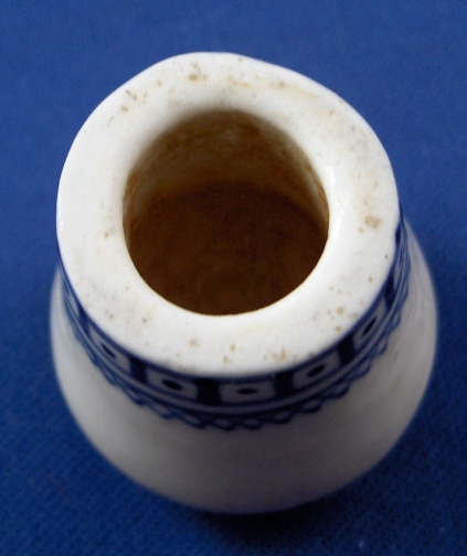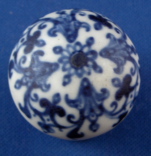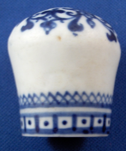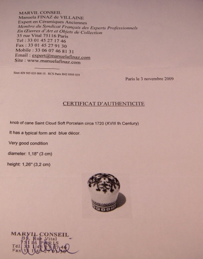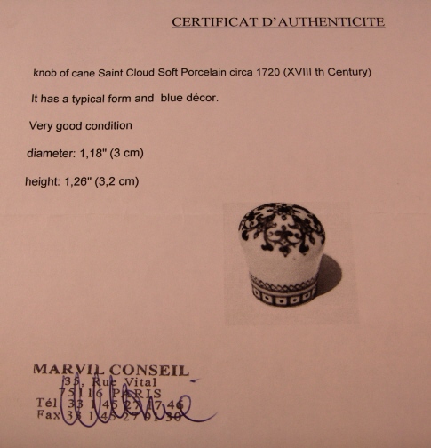 This is a cane handle made by St-Cloud during the first quarter of the 18th century. It is softpaste porcelain and nicely handpainted with the typical underglaze blue decoration and is in great condition with some small firing flaws common on the early wares and the glaze is worn from use but that is normal on these pieces since softpaste glaze wore very easily. It is unmarked which is common at St.Cloud but it was made by them for sure. Also have an expertise from the expert just in case you don't believe me :) The piece is 1.375 inches tall and 1.125 inches in diameter. The hole is about 0.5 inches in diameter but a bit oval and it is 0.875 inches deep in the center. A rare little item from one of the best makers from the 18th century! Please email me for more information or other pictures.