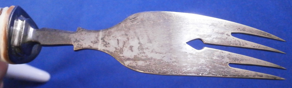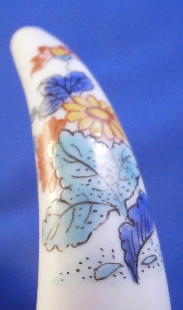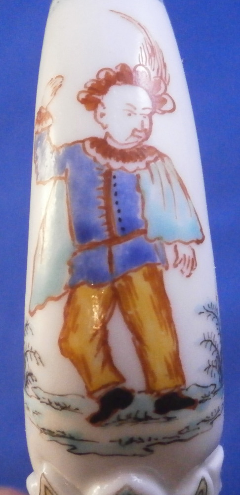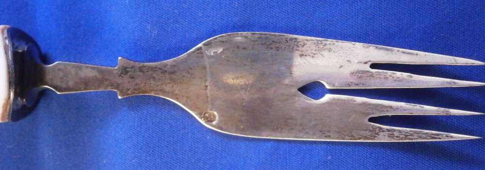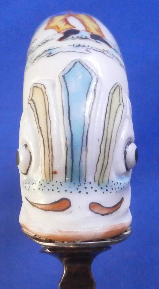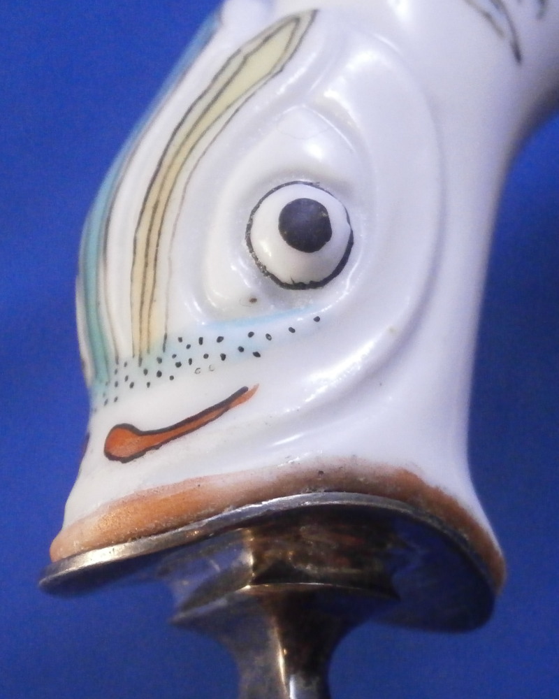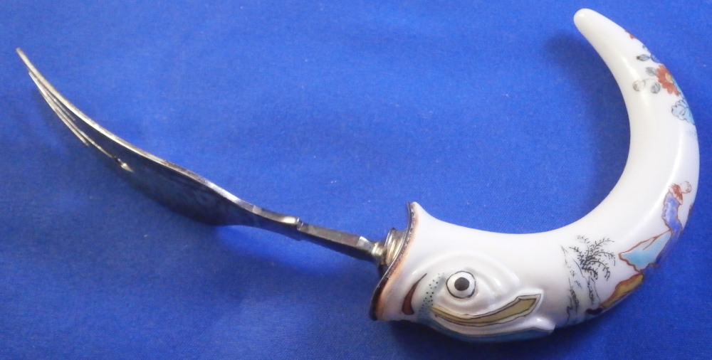 This is a cane handle made by St-Cloud around the first half of the 18th century. It is oddly enough attached to an 18th century (I think) fork and I thought this was a one time fluke but I also own a damaged version of this so there are now two known forks like this out there!? Maybe made for a person that difficulty holding normal forks due to some sort of sickness or damage to his hands? The silver fork has two hallmarks that I cannot quite make out. One is likely a version of the Minerva's head and the other has writing to it so some sort of maker's mark but even udner magnification I cannot figure it out as it is not crisp enough. I don't know anything about silver hallmarks so I'll leave it at that. The cane handle is made of soft paste porcelain and has a really fun fish shape to it plus is nicely hand painted with a superb polychrome enamel Chinoiserie figural scene as well as some flowers and the fish's head/ face with an open mouth. The colors are superb and it is very hard to find polychrome examples like this by this maker. The piece is in perfect condition with a bit of qxidation to the silver. The silver part was obviously hand made as it is not quite even in terms of the grove to either side of the center one. It is unmarked which is common on pieces like this by St.Cloud but it was made by them for sure during this period! The entire piece is 5.75 inches long not accounting for the bend, 3.25 inches deep (the handle part) and 0.875 inches wide. The fork is 3.5 inches long and the cane handle is about 3.25 inches long. A fun piece for sure! A rare little item from one of the best makers from the 18th century! Not sure if it possible to remove the fork part and use it as a cane handle again but this is a much more fun conversation piece as is! Please email me for more information or other pictures.