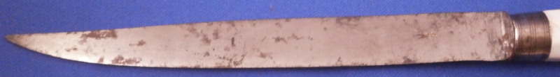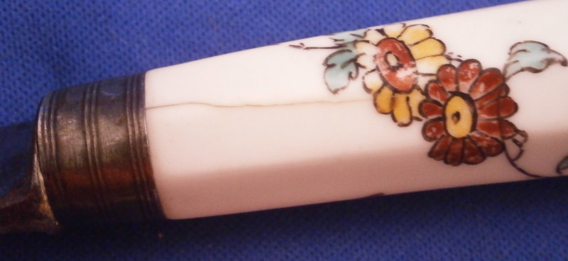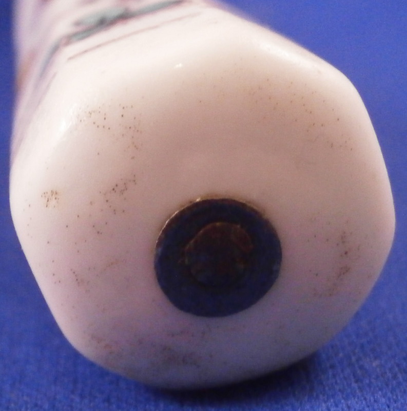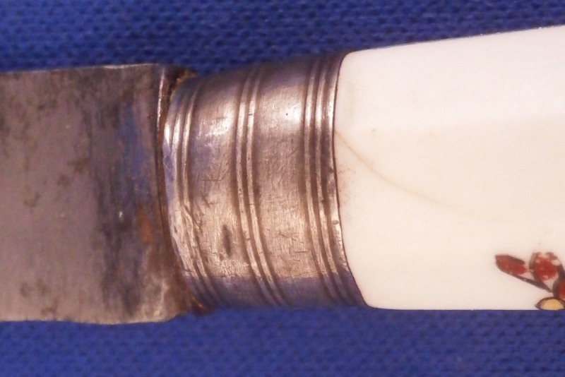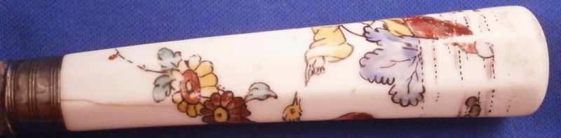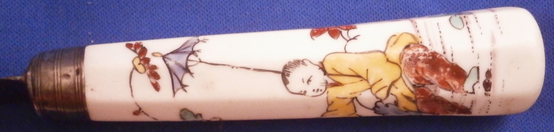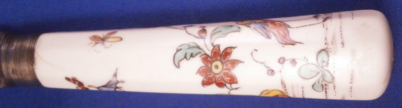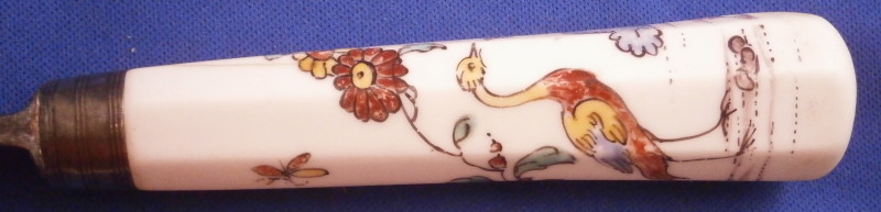 This is a fun knife with the porcelain handle made by Chantilly in the frist half of the 18th century. The handle has an octagonal shape to it and is made of soft paste porcelain which is hand painted with a Chinoiserie style design derived from earlier Japanese Kakiemon porcelain. The colors are strong and design is superb. The handle has a young boy on it holding an umbrella with a bird next to him and some flowers all around. There is even a little bug. The design is completely outlined in black which is important for them to be the real deal. The metal blade is made of iron and marked with an impressed tulip looking mark as shown for the blacksmith that made the metal parts. The ferrule looks to be silver. The knife is amazingly complete with the original blade which isn't that common. The handle has suffered some minor wear, a one inch long straight crack and another short one that is about 0.25 inches. A common issue on these early pieces by this maker. The metal parts have some oxidation to them. The blade goes through the center all the way through and thus you have the little silver piece at the end of the handle as shown. The knife is 9.75 inches long of which the visible part of the porcelain handle being about 3.5 inches long. Please email me for more information or other pictures.