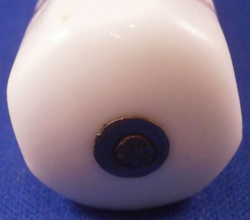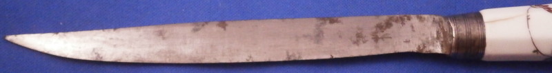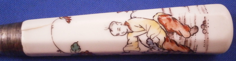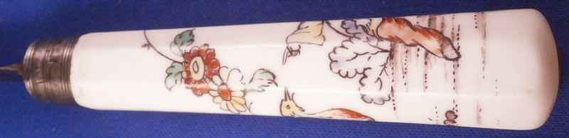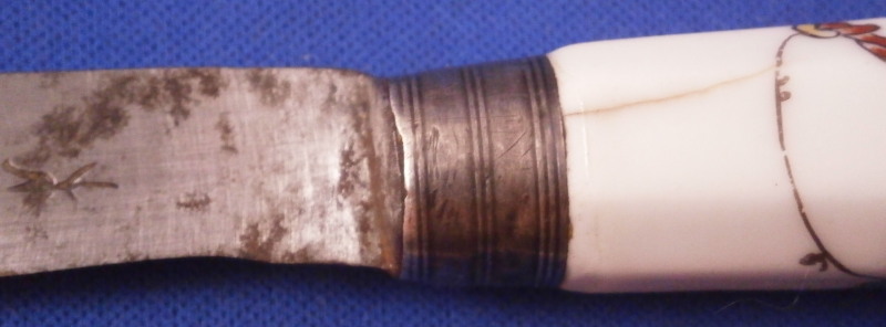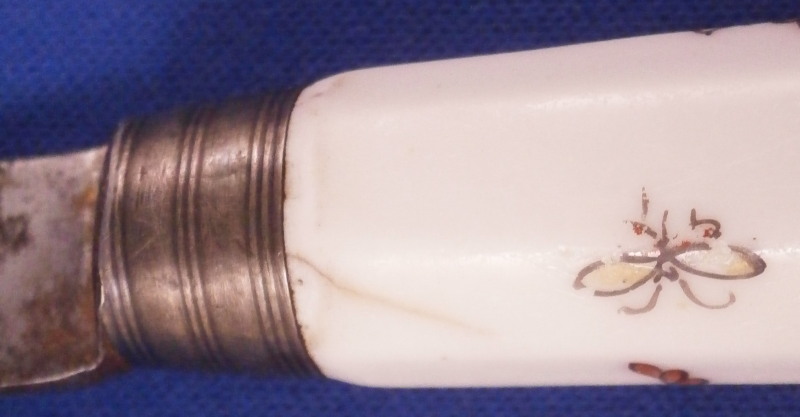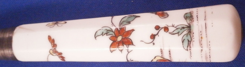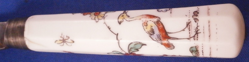 This is a fun knife with the porcelain handle made by Chantilly in the frist half of the 18th century. The handle has an octagonal shape to it and is made of soft paste porcelain which is hand painted with a Chinoiserie style design derived from earlier Japanese Kakiemon porcelain. The colors are strong and design is superb. The handle has a young boy on it holding an umbrella with a bird next to him and some flowers all around. There is even a little bug. The design is completely outlined in black which is important for them to be the real deal. The metal blade is made of iron and marked with an impressed tulip looking mark as shown for the blacksmith that made the metal parts. The ferrule looks to be silver. The knife is amazingly complete with the original blade which isn't that common. The handle has suffered some minimal wear as well as a one inch long straight crack and another shorter one that is about 0.5 inches as shown. A common issue on these early pieces by this maker. The metal parts have some oxidation to them. The blade goes through the center all the way through and thus you have the little silver piece at the end of the handle as shown. The knife is 9.625 inches long of which the visible part of the porcelain handle being about 3.625 inches long. Please email me for more information or other pictures.