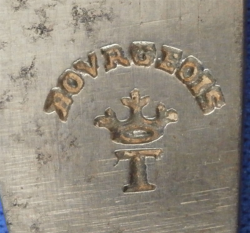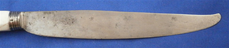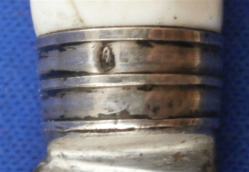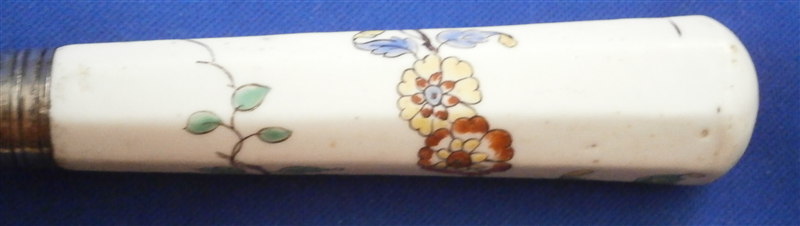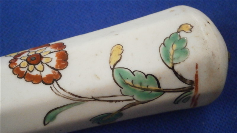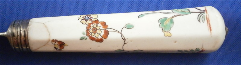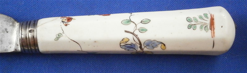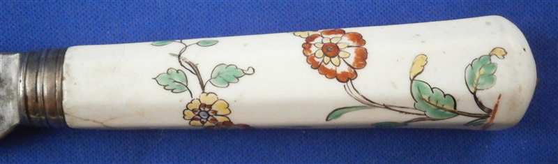 This is a superb knife with the handle made by Chantilly in the first half of the 18th century. It is made of soft paste porcelain and is hand painted in the Kakiemon style derived from earlier Japanese designs. This one has a nice floral design to it I have not seen before - the colors and design are superb! The colors are unlike any other ones I have ever seen on porcelain which is why they are so famous. The design is completely outlined in black which is important for them to be the real deal. The metal blade is marked with an impressed mark of a crown over the letter I ot T as well as a name above that though I am having a tough time making it out (likely the makers mark of the blacksmith) looks like ROVRGEOIS. The knife is amazingly complete with the bladeand the silver ferrule which isn't that common. Sadly the handle has suffered a bit of a crack to the part near the ferrule as shown and some of the usual wear of soft paste pieces but it still displays superbly. The blade is in great shape as is the ferrule which is marked but I cannot make much out of it. The knife is 10 inches long of which the visible part of the porcelain handle being about 3.375 inches long. Please email me for more information or other pictures.