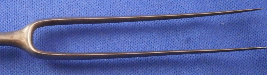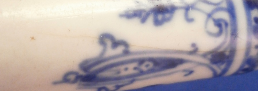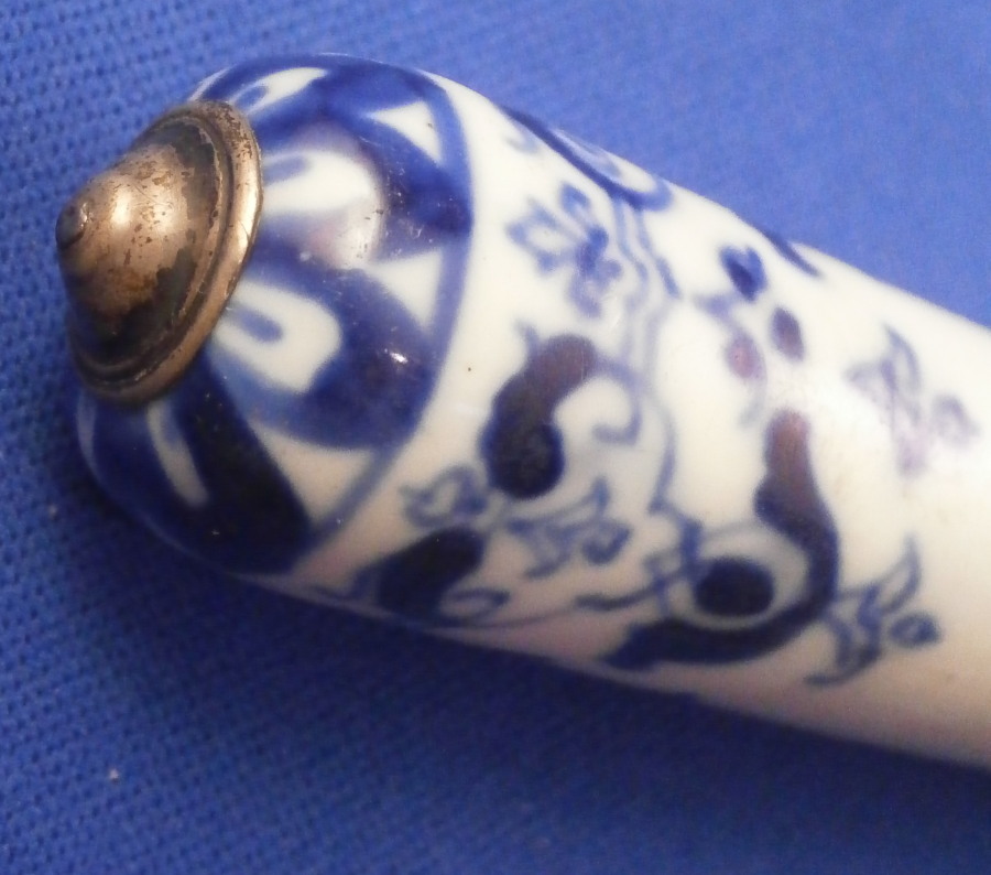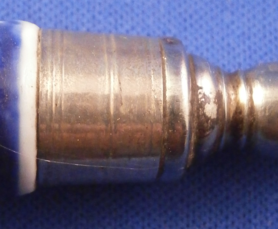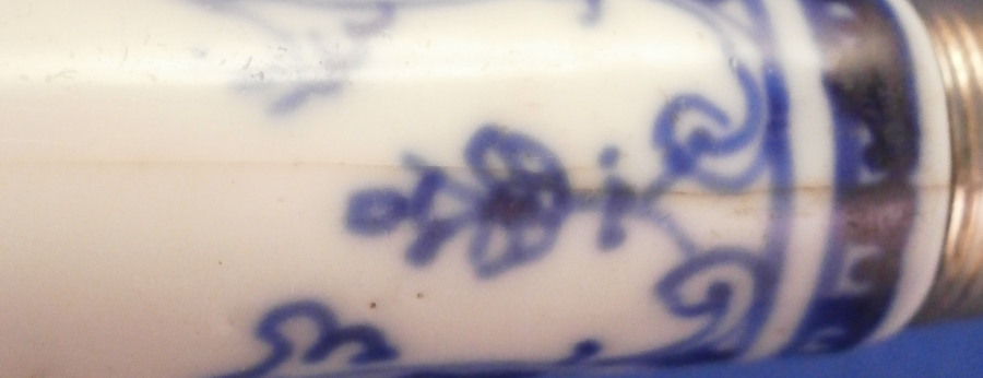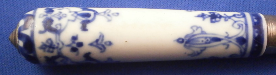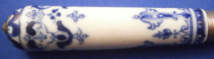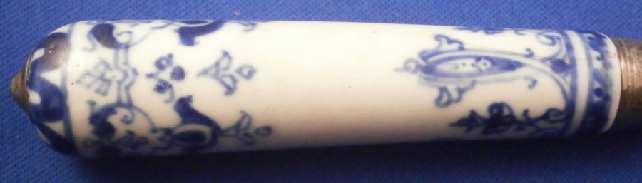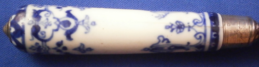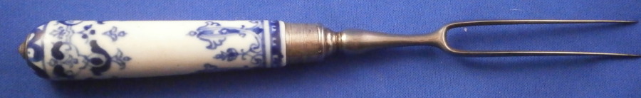 This is a rare early fork where the handle is made of Saint Cloud porcelain in the first half of the 18th century around 1725. The handle is made of a creamy colored soft paste with a nice under glaze blue decoration typical for them. The handle is an early cannon shape which is hand painted with Renaissance inspired lambrequin designs loosely derived from the broderie ornaments of the designer Jean Berain (1640-1711) and his followers. The end of the handle is painted with a stylised flower head. The fork has two tines on a baluster stem - a very early design as well. The metal parts are made of steel and the ferrule and decorative end cap made of silver. The metal parts are original to the piece which is not often the case. The set is in great condition with some minor oxidation to the metal parts which is normal but it is better looking than most. A tiny bit of wear to the glaze and some minor firing faults common to these early pieces especially since they are softpaste. Two fine hard to spot hairlines going from the ferrule end inwards as shown. A fairly common issue on these and it is still a superb example and displays perfectly! Unmarked which is always the case. The fork is 8.5 inches long of which the visible part of the handle is about 3.375 inches. Please email me for more information or other pictures.