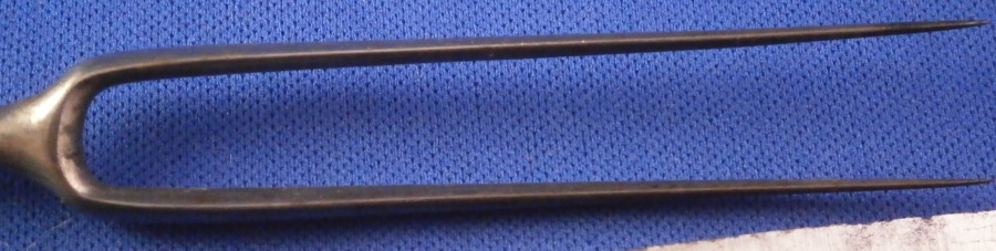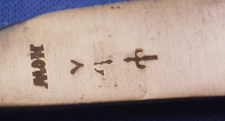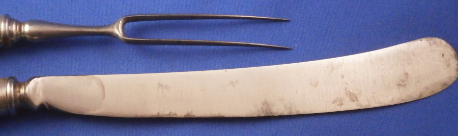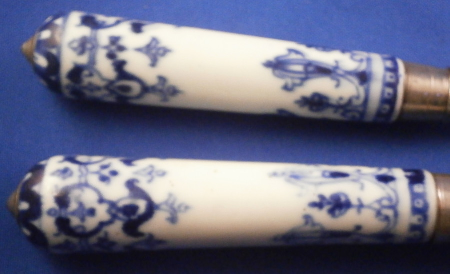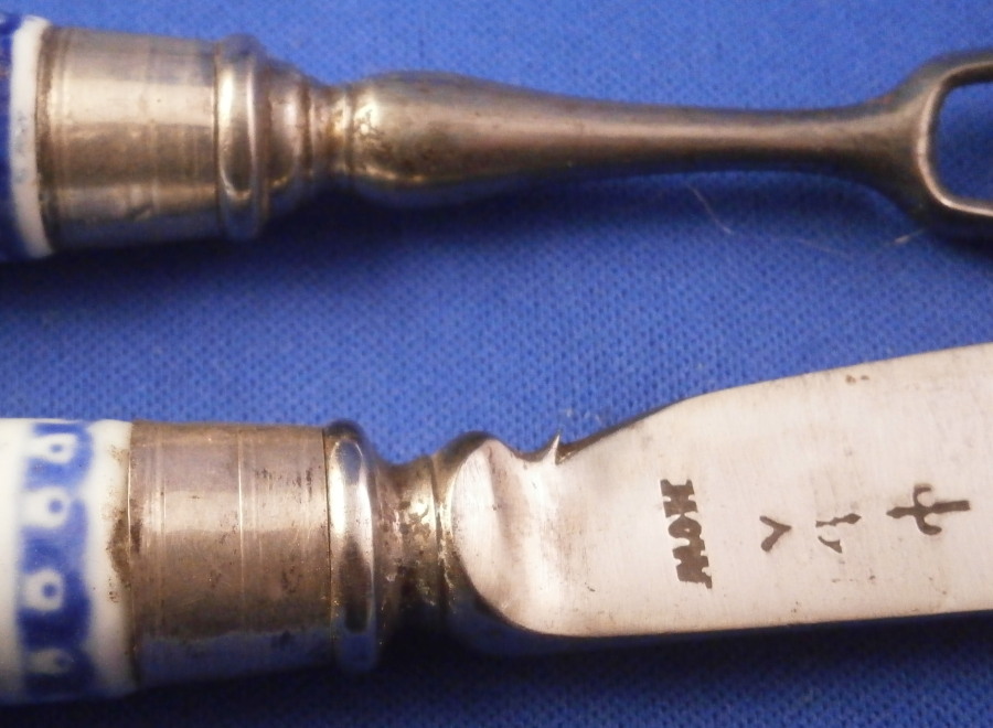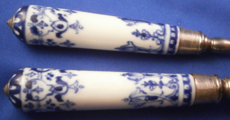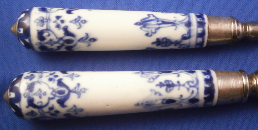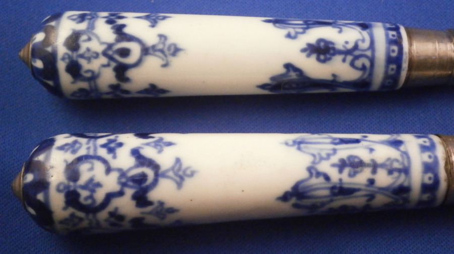 This is a rare early matching knife and fork set where the handle is made of Saint Cloud porcelain in the first half of the 18th century around 1725. The handle is made of a creamy colored soft paste with a nice under glaze blue decoration typical for them. The handles are an early cannon shape which are hand painted with Renaissance inspired lambrequin designs loosely derived from the broderie ornaments of the designer Jean Berain (1640-1711) and his followers. The ends of the handles are painted with a stylised flower head. The fork has two tines on a baluster stem - a very early design as well. The metal parts are made of steel and the ferrule and decorative end cap made of silver. The blade has a maker's mark impressed in it as shown. The metal parts are original to the piece which is not often the case. The two tine forks are very early. The set is in superb condition with some oxidation to the metal parts which is normal but someone cleaned them up so they are better looking than most. A tiny bit of wear to the glaze and some minor firing faults common to these early pieces especially since they are softpaste. Unmarked which is always the case. The fork is 8.5 inches long of which the visible part of the handle is about 3.375 inches. The knife is 11.25 inches long of which the visible part of the handle is about 3.5 inches. Please email me for more information or other pictures.