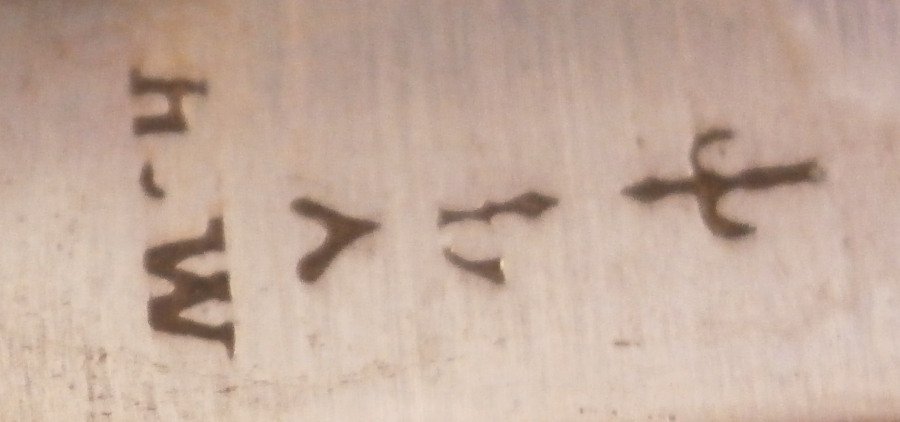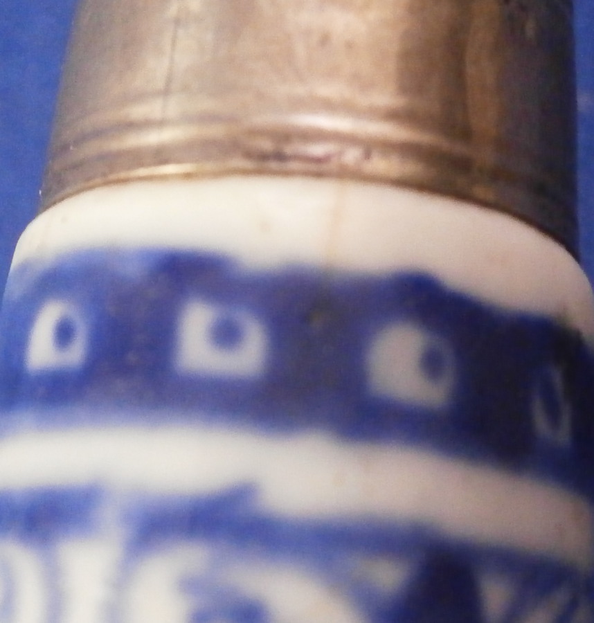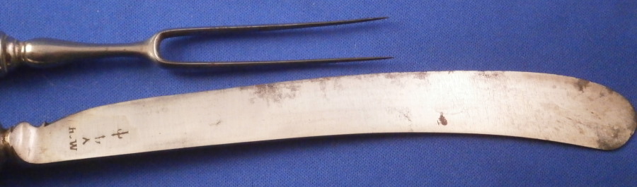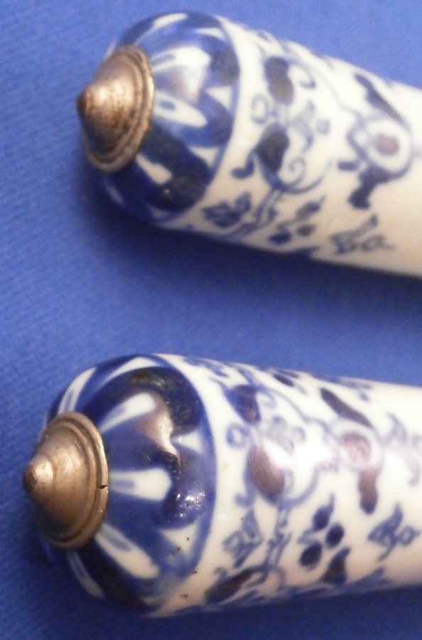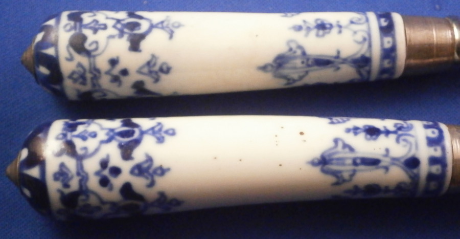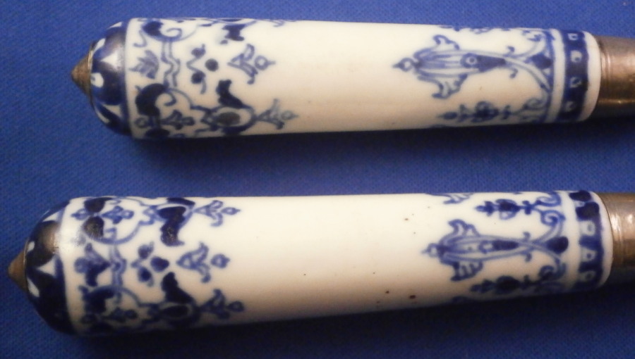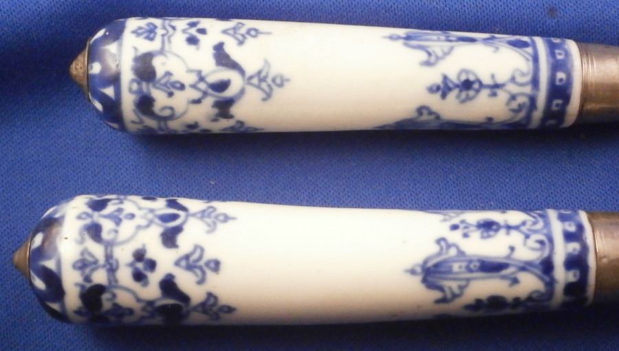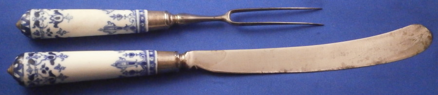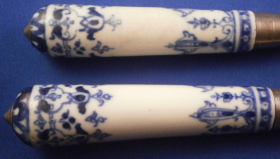 This is a rare early matching knife and fork set where the handle is made of Saint Cloud porcelain in the first half of the 18th century around 1725. The handle is made of a creamy colored soft paste with a nice under glaze blue decoration typical for them. The handles are an early cannon shape which are hand painted with Renaissance inspired lambrequin designs loosely derived from the broderie ornaments of the designer Jean Berain (1640-1711) and his followers. The ends of the handles are painted with a stylised flower head. The fork has two tines on a baluster stem - a very early design as well. The metal parts are made of steel and the ferrule and decorative end cap made of silver. The blade has a maker's mark impressed in it as shown. The metal parts are original to the piece which is not often the case. The set is in great condition with some oxidation to the metal parts which is normal but someone cleaned them up so they are better looking than most. A tiny bit of wear to the glaze and some minor firing faults common to these early pieces especially since they are softpaste. The fork has two short hairlines from the ferrule end about a quarter of an inch in. Thye display perfectly! Unmarked which is always the case. The fork is 8.5 inches long of which the visible part of the handle is about 3.375 inches. The knife is 11.25 inches long of which the visible part of the handle is about 3.5 inches. Please email me for more information or other pictures.