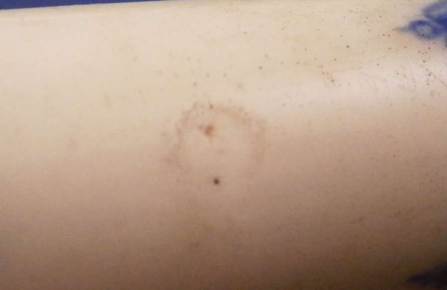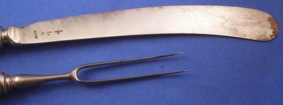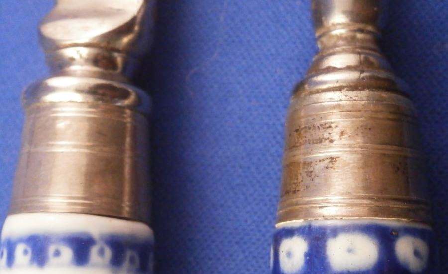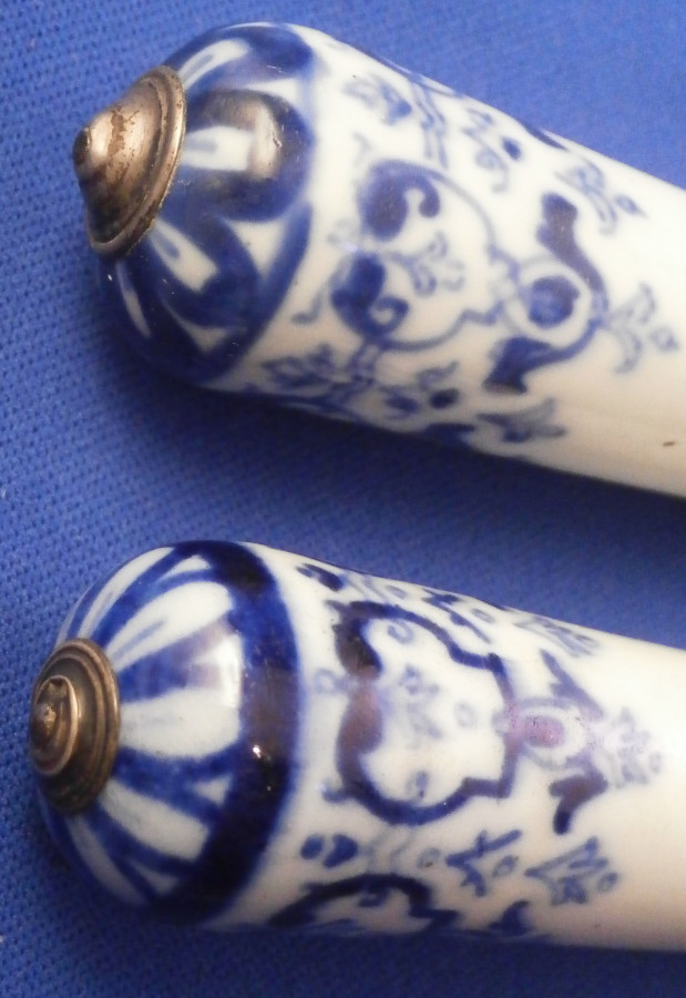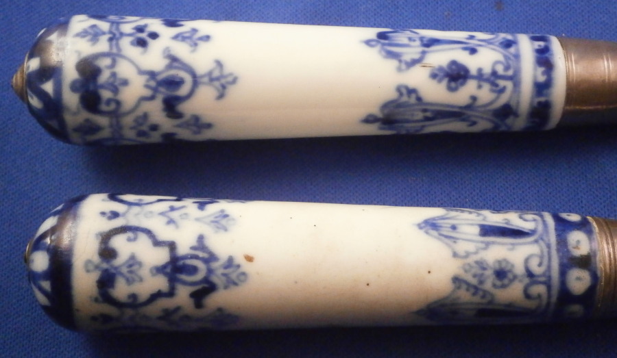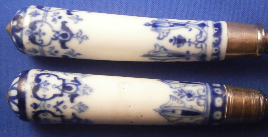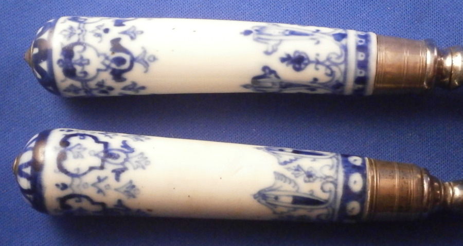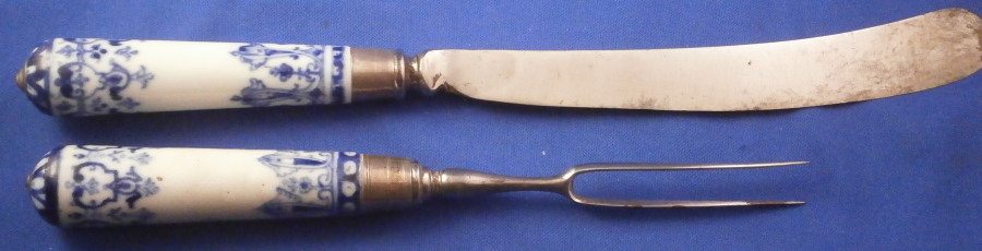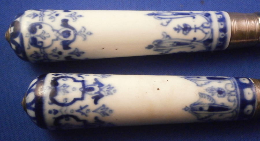 This is a rare early matching knife and fork set where the handle is made of Saint Cloud porcelain in the first half of the 18th century around 1725. The handle is made of a creamy colored soft paste with a nice under glaze blue decoration typical for them. The handles are an early cannon shape which are hand painted with Renaissance inspired lambrequin designs loosely derived from the broderie ornaments of the designer Jean Berain (1640-1711) and his followers. The ends of the handles are painted with a stylised flower head. The fork has two tines on a baluster stem - a very early design as well. The metal parts are made of steel and the ferrule and decorative end cap made of silver. The blade has a maker's mark impressed in it as shown. The metal parts are original to the piece which is not often the case. The set is in great condition with some oxidation to the metal parts which is normal but someone cleaned them up so they are better looking than most. A tiny bit of wear to the glaze and some minor firing faults common to these early pieces especially since they are softpaste. The fork has a small spot where the glaze was ground down likely to hide a larger firing spot. They display perfectly! Unmarked which is always the case. The fork is 8.5 inches long of which the visible part of the handle is about 3.375 inches. The knife is 11.25 inches long of which the visible part of the handle is about 3.5 inches. Please email me for more information or other pictures.