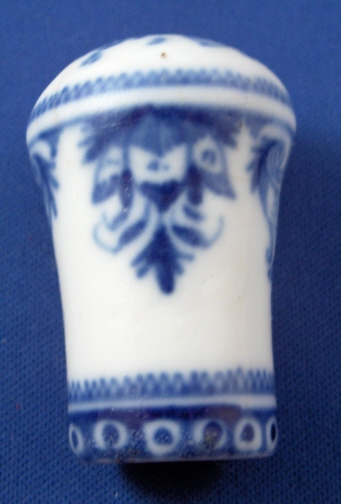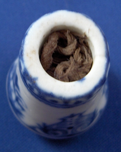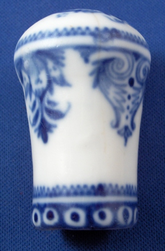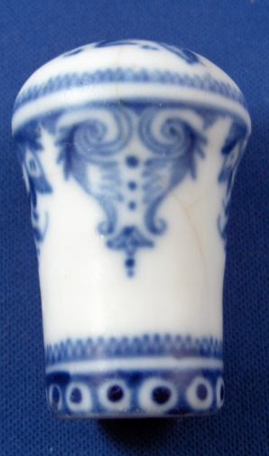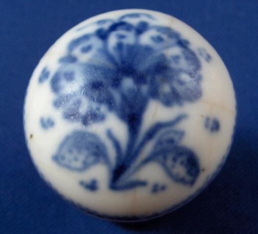 This is a cane handle made by St-Cloud during the first quarter of the 18th century. It is softpaste porcelain and nicely handpainted with the typical underglaze blue decoration with a nice flower on top and the more typical scroll work pattern all around. This cane handle is larger than the other one I own. It is in great condition with some small very tight hairlines going out from the top center likely it was dropped at some point. These are stable and do not distract from the beauty of this fun piece. Some of the glaze is worn from use mostly on the top which makes sense and is normal on these pieces since softpaste glaze wore very easily. It is unmarked which is common at St.Cloud but it was made by them for sure. The piece is 2 inches tall and 1.25 inches in diameter. The hole is about 0.5 inches in diameter but a bit oval. My favorite thing about this piece is that a long time ago some lady has stuffed a string soaked in perfume oil into it and it still smells quite nicely and strongly. Pure perfume oils can last forever basically unless they go ransid which did not happen in this case. A rare little item from one of the best makers from the 18th century! Please email me for more information or other pictures.