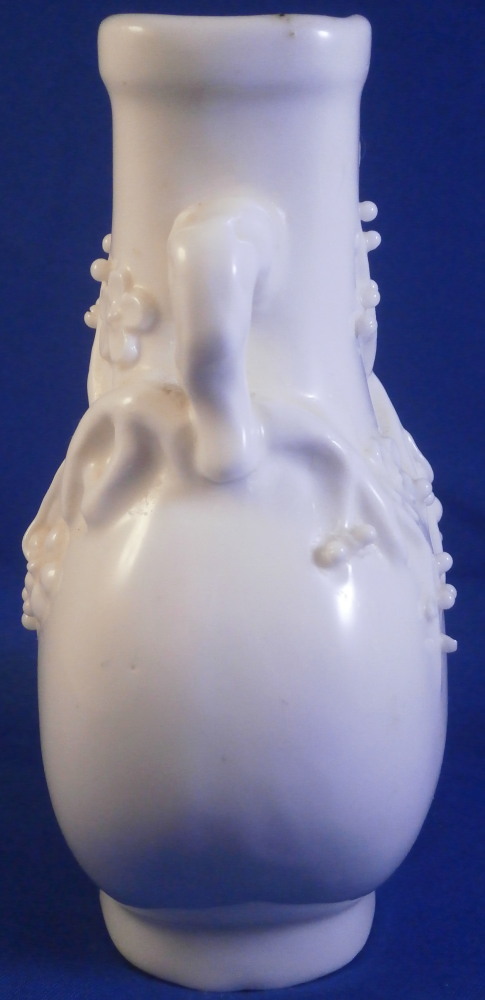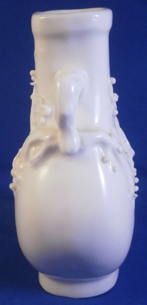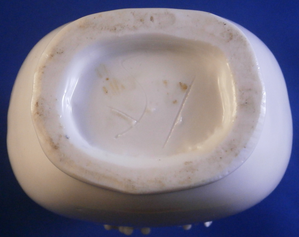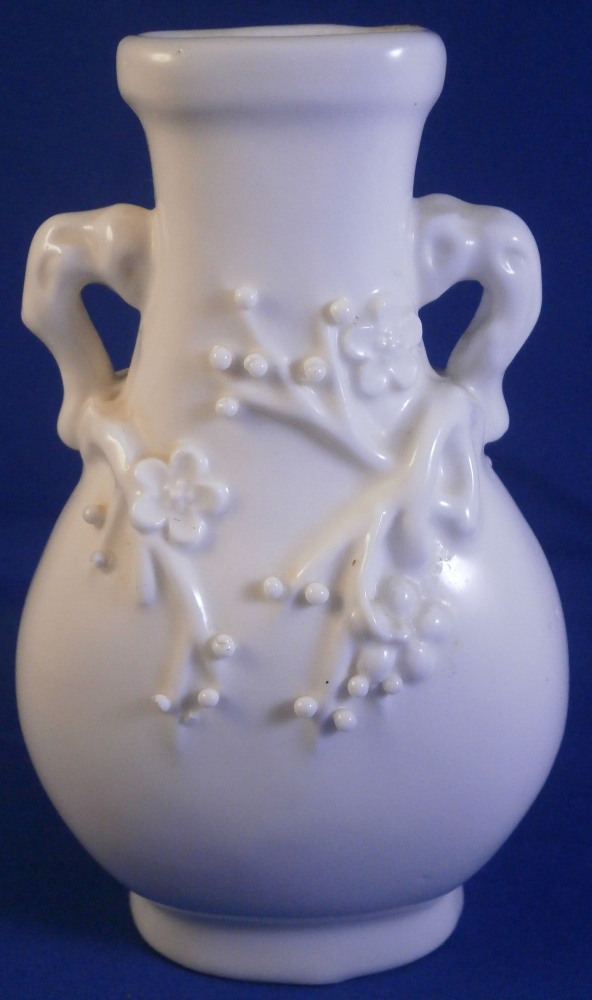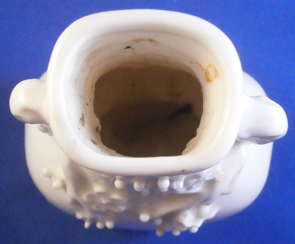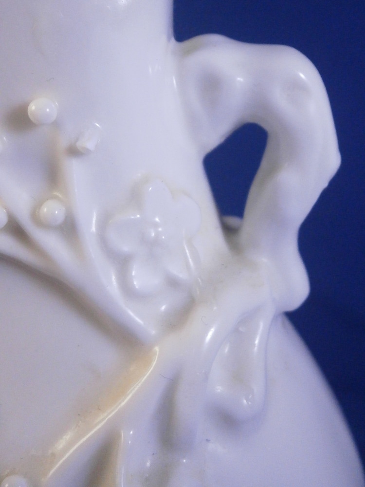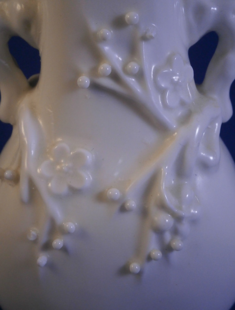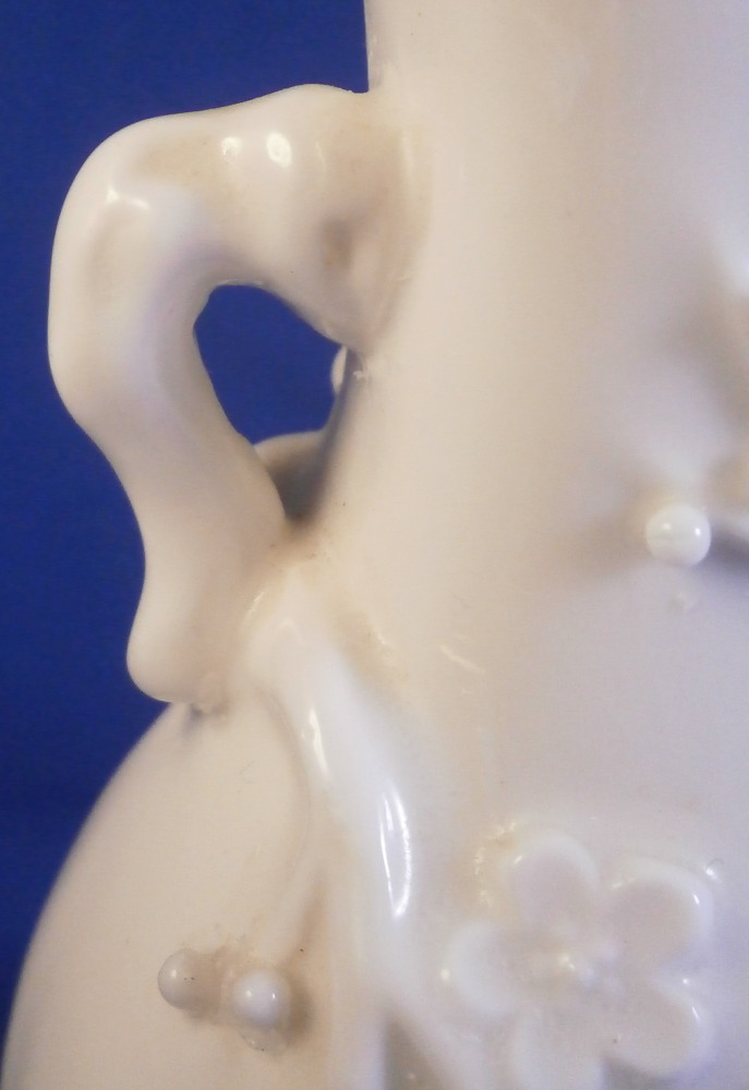 This is a really nice little vase made of soft paste porcelain by St. Cloud of France in the early to mid 18th century. It is rare to find pieces like this but they have been identified as having been made by them and they are always marked as seen. The vase is decorated with prunus branches with blossoms on both sides with the thickest part of the branch forming the handles. The softpaste is really white and looks amazing! The detail of the relief design is superb as well. Really does not get much better than this except maybe in size. The piece is marked underneath as shown. Never could figure out what it stands for but these little cuties are always marked the same not that you see them often at all. It is certainly a superb piece and in perfect condition except for two of the little round balls / flower buds have been chipped. The inside of the vase is unglazed except around the top. Someone used it as a candleholder years ago and there is some wax on the inside and residue of a candle. The vase is 4.625 inches tall, 2 inches deep and 2.755 inches wide. Please email me for more information or other pictures.