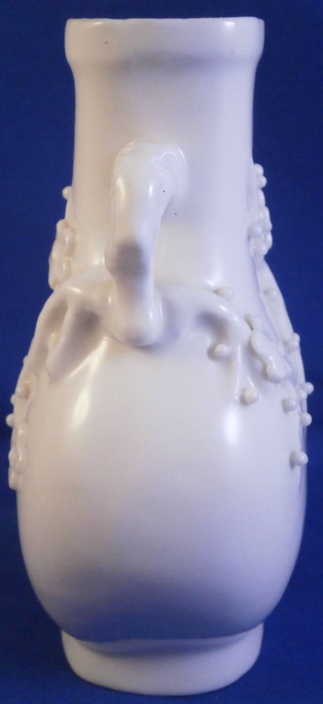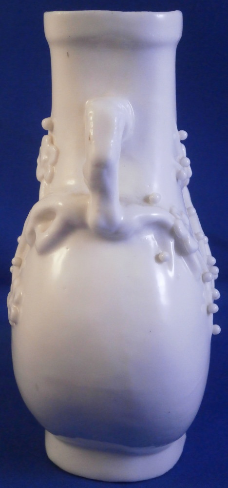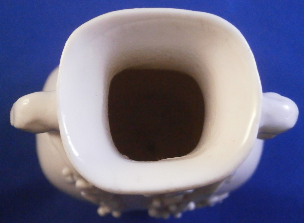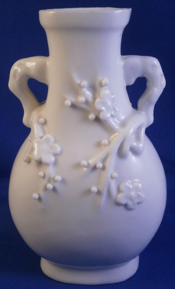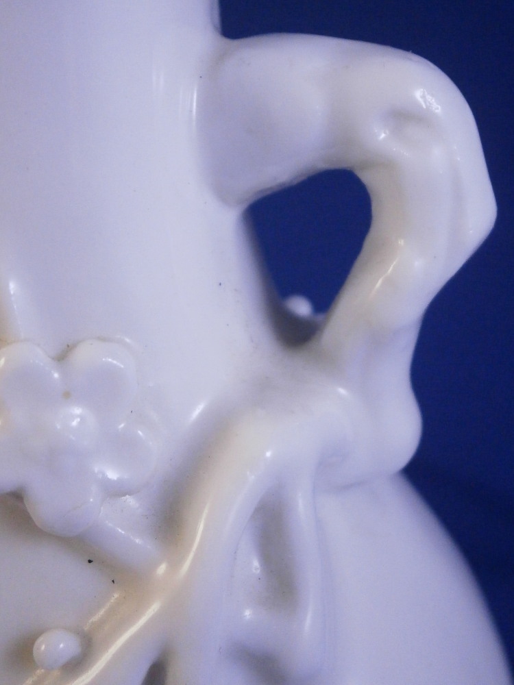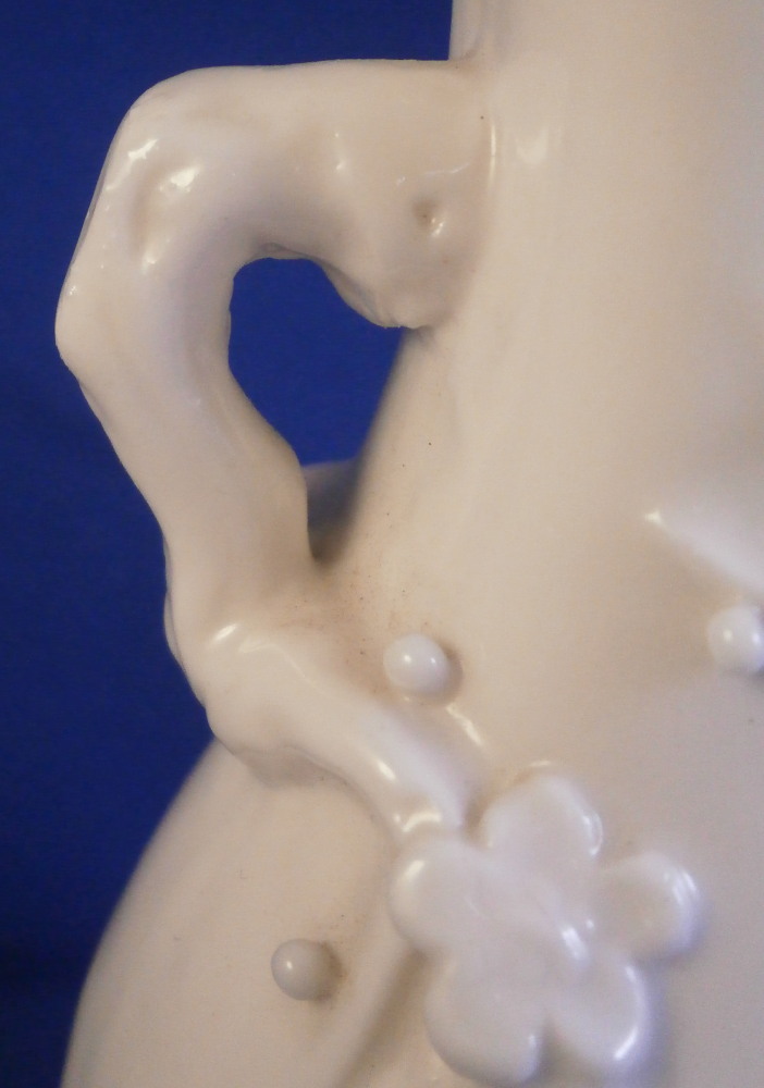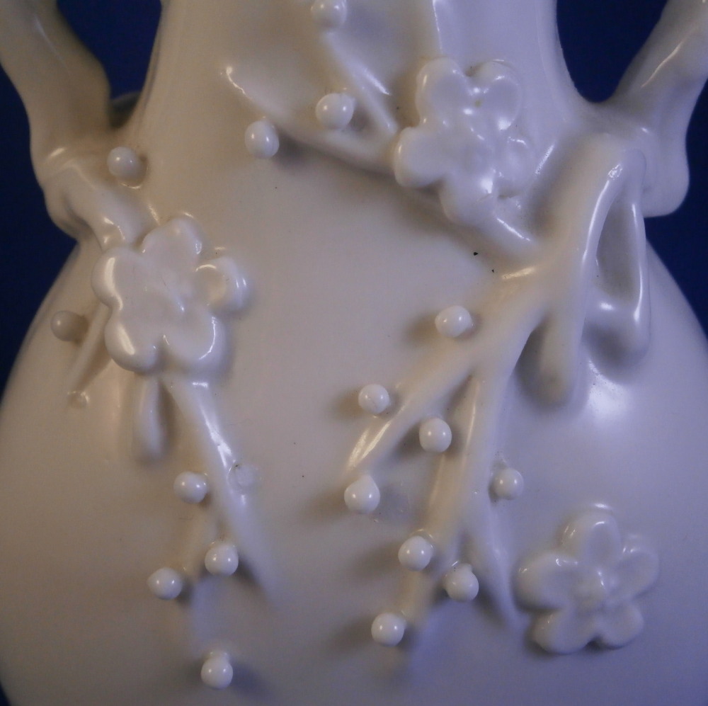 This is a really superb little vase made of soft paste porcelain made by St. Cloud of France in the mid to early 18th century. It is rare to find pieces like this but they ahve been ID as having been made by them and they are always marked as seen. The vase is decorated with prunus branches with blossoms on both sides with the thickest part of the branch forming the handles. The softpaste is really white and looks amazing! The detail of the relief design is superb as well. Really does not get much better than this except maybe in size. The piece is marked underneath as shown. Never could figure out what it stands for but these little cuties are always marked the same not that you see them often at all. I did have one other example years ago. It is certainly a superb piece and in perfect condition except I think one of the little round balls / flower buds has chipped off. The inside of the vase is unglazed except around the top. The vase is 4.5 inches tall, 2 inches deep and 2.625 inches wide. Please email me for more information or other pictures.