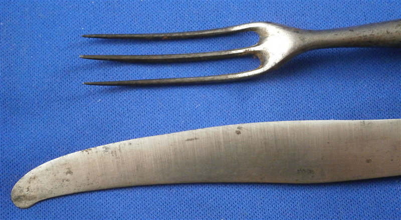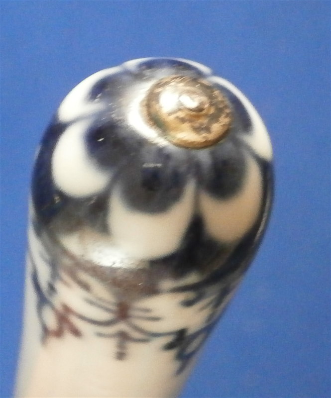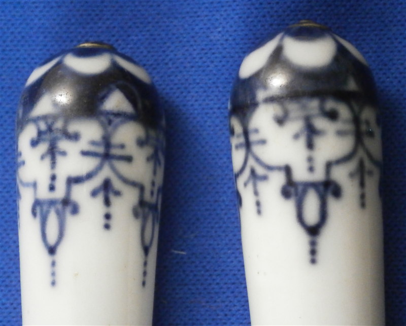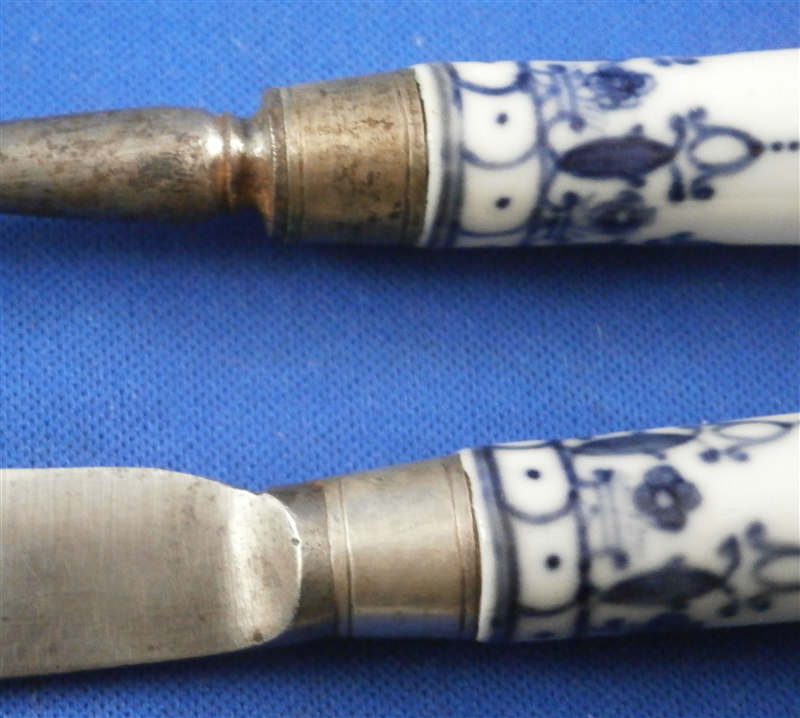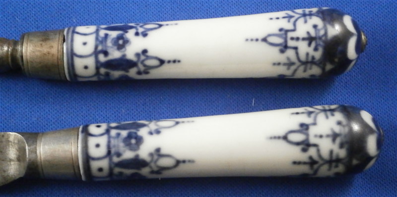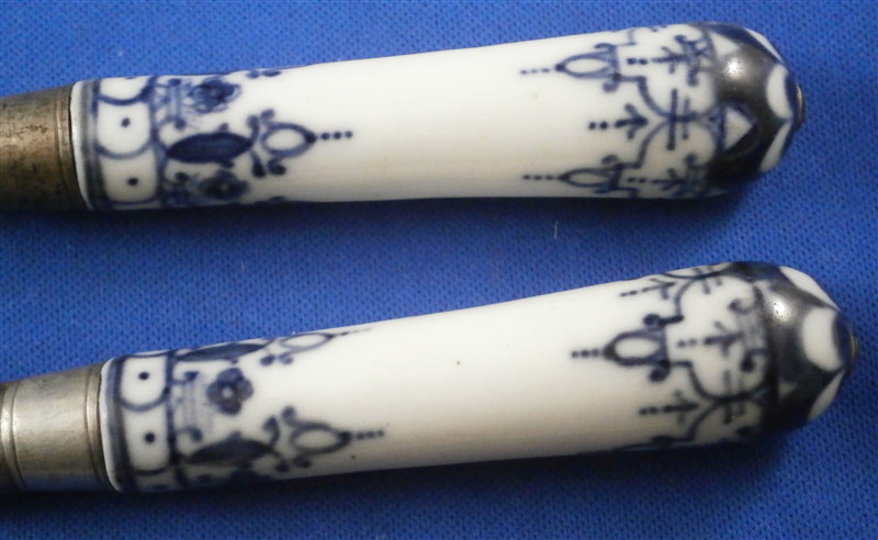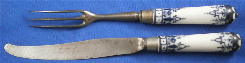 This is a knife and a fork set each with a porcelain handle likely made in France and definitely in the early to mid 18th century. Each handle is hand painted with an underglaze blue design reminiscent of St. Cloud but the paste is different from all my other knives and forks as is the color of the blue so I am unsure of the exact maker. The metal parts are original to the piece and date around 1740. The shape is French or early German but then only Meissen would be a possibility and I highly doubt that. Maybe someone out there knows this design and can help :) The collar between the handle and the tines looks to be Silver which is the norm. The two pieces are in great condition with oxidation to the metal parts as shown. The fork has a tiny flake off the porcelain end by the collar but that looks to be original to the making. The blade / tines are steel. The metal goes all the way through the porcelain handle as shown. The fork is 7 inches long and the porcelain part of that is 2.75 inches long and about 0.75 inches in diameter. The knife is 7.875 inches long and the porcelain part of that is 2.75 inches long and about 0.75 inches in diameter. Neither piece has any markings on it. Please email me for more information or other pictures.