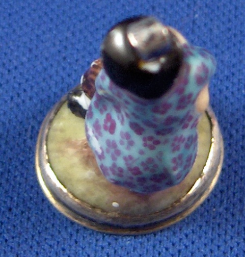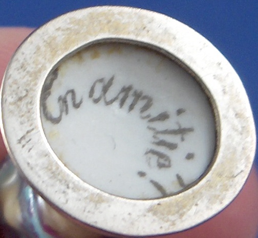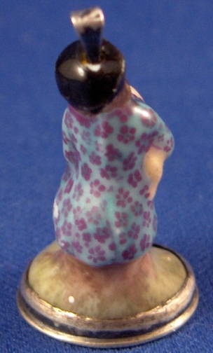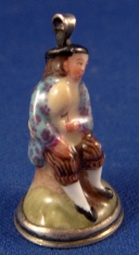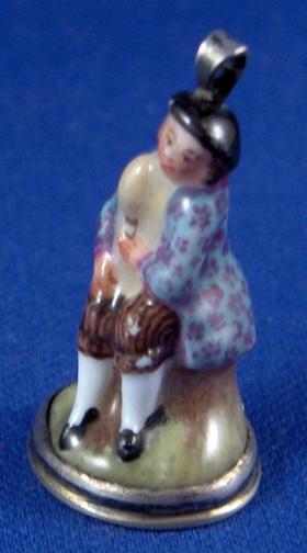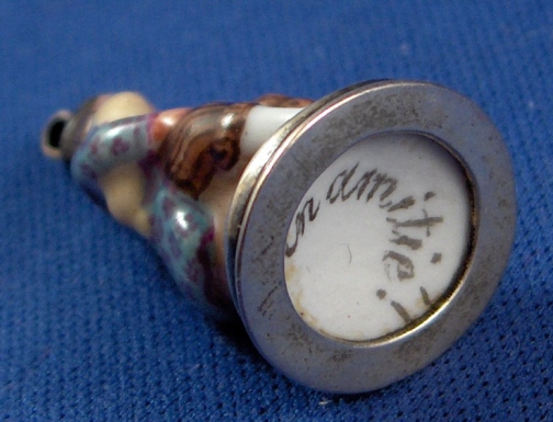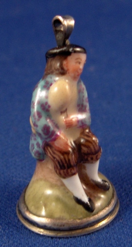 This is a superb little porcelain pendant made by the famous Girl in a Swing factory at St James by the Huguenot Charles Gouyn who formerly was a founder along with Nicholas Sprimont of the famous Chelsea factory. St. James is famous for their toys - miniature items like snuff boxes, perfumes, seals, etc. and was around from about 1749-1759 so not long at all! This piece here is a pendant in the form of a scotsman with his bagpipe. These were often also made into seals but this one is just a pendant! Great detail and painting plus the silver mounts. A ring to the bottom in silver and the piece to attach the chain on top. The piece is in superb condition with a bit of paint wear on his left knee and the left side of his jacket. A bit of white showing on top of his hat where the silver is attached. And some expected oxidation of the silver which is an easy fix if that is what you want :) There are minute spots of gilding left on the silver so it was at some point gilded over. The pendant is not marked which is the norm but it does say En amitie! underneath. French for in friendship I believe. The piece is 1.125 inches tall including the silver ring on top and the bottom has a diameter of 0.625 inches or so. Remember the pictures are very enlarged thus I added two that are a bit closer to the real size. The two small pictures are still double in size but you can get an idea of it this way. Please email me for more information or other pictures.