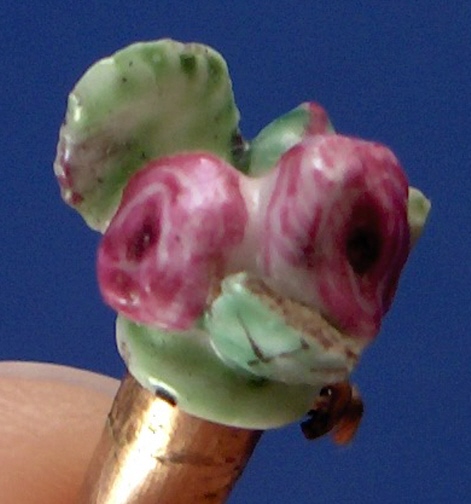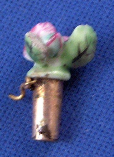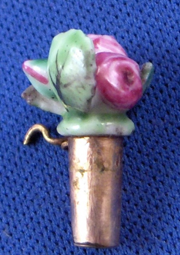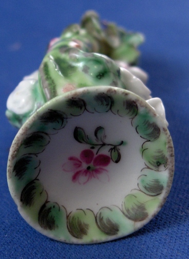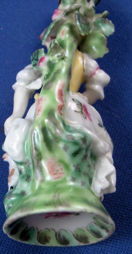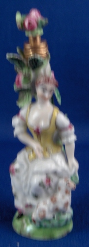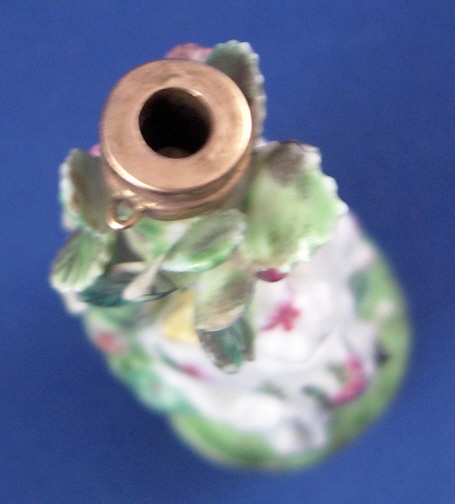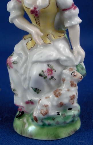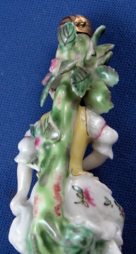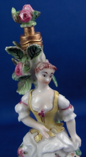 This is a very rare treat - a figural perfume bottle in the shape of a lady with a sheep. I think it was made by Charles Gouyn's factory at St. James while my friend thinks it was made by Chelsea. Since he knows more about English porcelain I listed it under the Chelsea category of my site but in the end it matters very little since either way it is a rare and superb piece :) Made of softpaste and modeled as a tiny shepherdess with her sheep leaning against a flowering rose bush. Lots of amazing detail with even a small rose and a ring of leaves on the underside! The stopper is gold mounted which was reserved for only the best. The piece is not marked which is normal. It is about 3.25 inches tall and in superb condition with the small gold chain missing that would hold the stopper on the main body and an amazingly little amount of chipping to the leaves. The stopper has two chipped leaves and the main body has 4 but 3 of these are on the one flower behind her and all are in the back. Please email me for more information or other pictures.