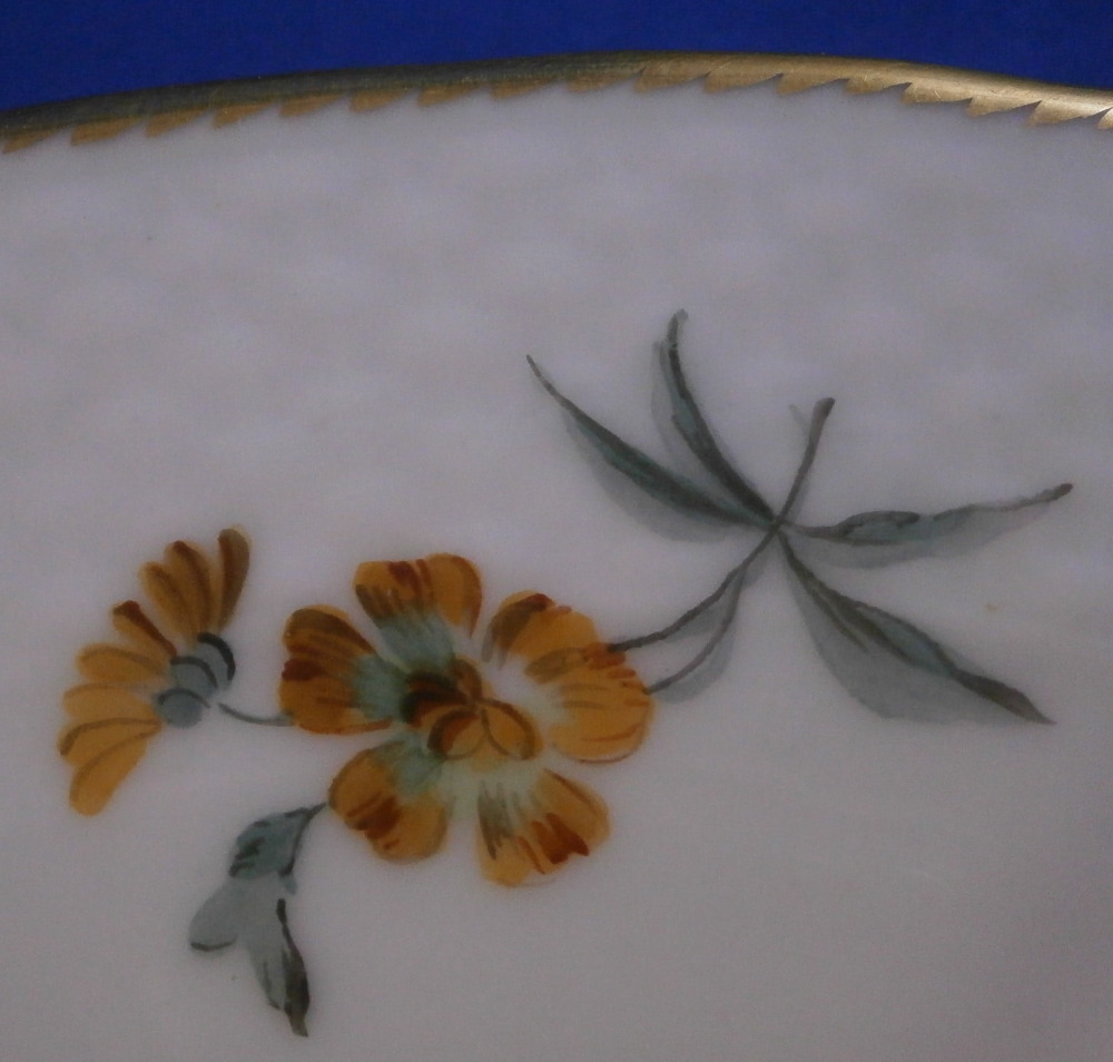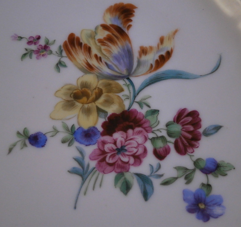 This is a porcelain plate made by the famous St. Petersburg factory during the reign of Czar Alexander II as Emperor of Russia who ruled from 1855 until 1881. Very reminiscent of the Royal Copenhagen Saxon Flowers design porcelain plates but here made by the Imperial factory and a little nicer if I may say so. The plate has a relief design to the rim with a nice gold trim to the edge. There are five single flowers hand painted along the rim with a superb large floral arrangement to the right side of the well and three more single flowers and a leaf design filling in the rest of the space. A really nice looking plate fit for royalty! The plate is in great condition with a touch of stacking wear to the small pansy flower and the blue flower of the main arrangement in the well. It is marked with the green A II mark under the crown with the Roman numeral VI under it as well as the typical green dots along the foot rim no one seems to really know what their meaning is and an impressed number 2 as shown. The plate is 1.375 inches tall and 9.875 inches in diameter. Please email me for more information or other pictures.