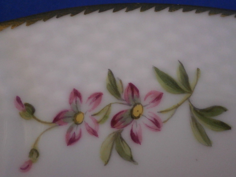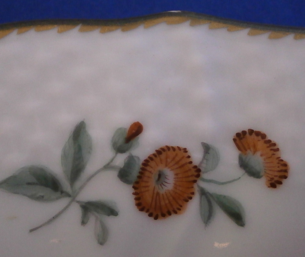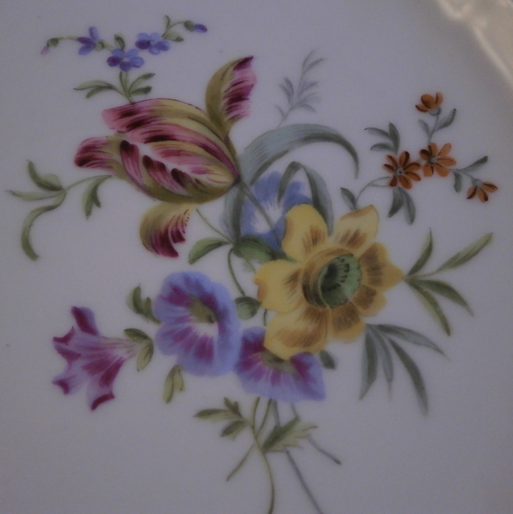 This is a porcelain plate made by the famous St. Petersburg factory during the reign of Czar Alexander II as Emperor of Russia who ruled from 1855 until 1881. Very reminiscent of the Royal Copenhagen Saxon Flowers design porcelain plates but here made by the Imperial factory and a little nicer if I may say so. The plate has a relief design to the rim with a nice gold trim to the edge. There are five single flowers hand painted along the rim with a superb large floral arrangement to the right side of the well and three more single flowers and a leaf design filling in the rest of the space. A really nice looking plate fit for royalty! The plate is in great condition with some wear to the gilding along the edge in two areas. There is what looks like dirt in the pictures on the elft side of the well but it is actually a small leaf design painted to hide a small flaw. Another tiny black firing mark to the rim. It is marked with the green A II mark under the crown with the Roman numeral VI under it as well as the typical green dots along the foot rim no one seems to really know what their meaning is and an impressed number 2 as shown. The plate is 1.375 inches tall and 10 inches in diameter. Please email me for more information or other pictures.