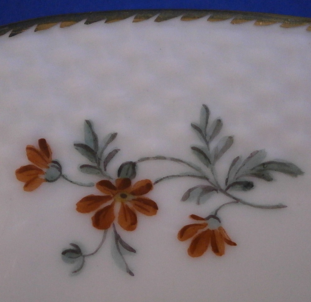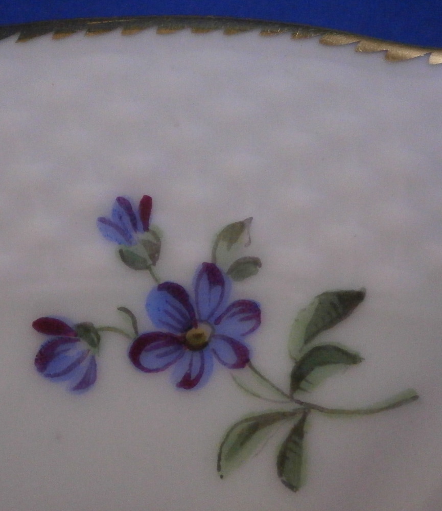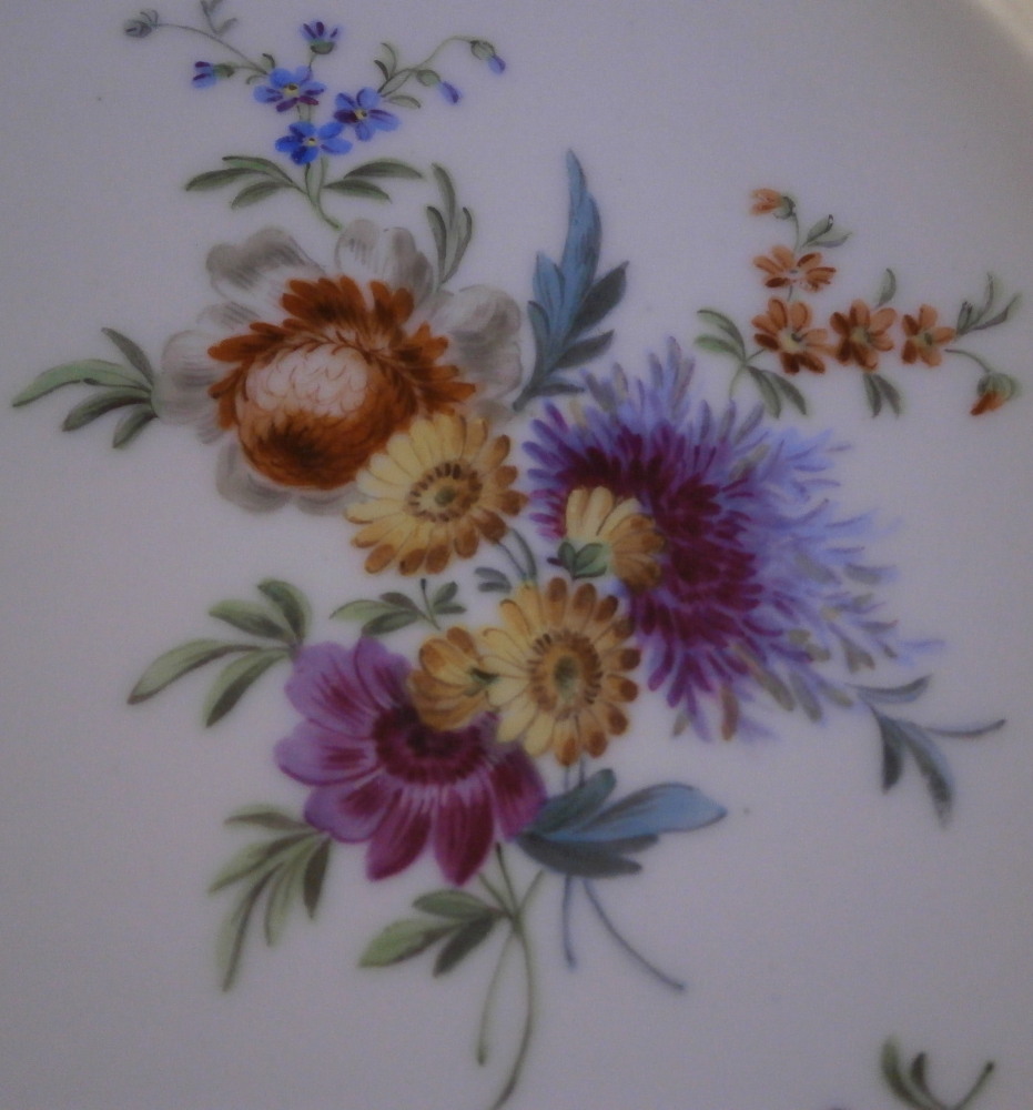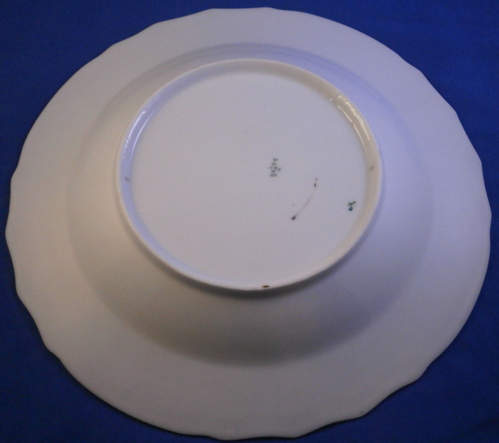 This is a porcelain plate made by the famous St. Petersburg factory during the reign of Czar Alexander II as Emperor of Russia who ruled from 1855 until 1881. Very reminiscent of the Royal Copenhagen Saxon Flowers design porcelain plates but here made by the Imperial factory and a little nicer if I may say so. The plate has a relief design to the rim with a nice gold trim to the edge. There are five single flowers hand painted along the rim with a superb large floral arrangement to the right side of the well and three more single flowers and a leaf design filling in the rest of the space. A really ncie looking plate fit for royalty! The plate is in perfect condition with a tiny black firing spot to the rim from when it was made. It is marked with the green A II mark under the crown with the roman numeral VI under it as well as the typical green dots along the foot rim no one seems to really know what their meaning is and even has a tiny leaf design covering a flaw underneath as shown. The plate is 1.375 inches tall and 9.75 inches in diameter. Please email me for more information or other pictures.