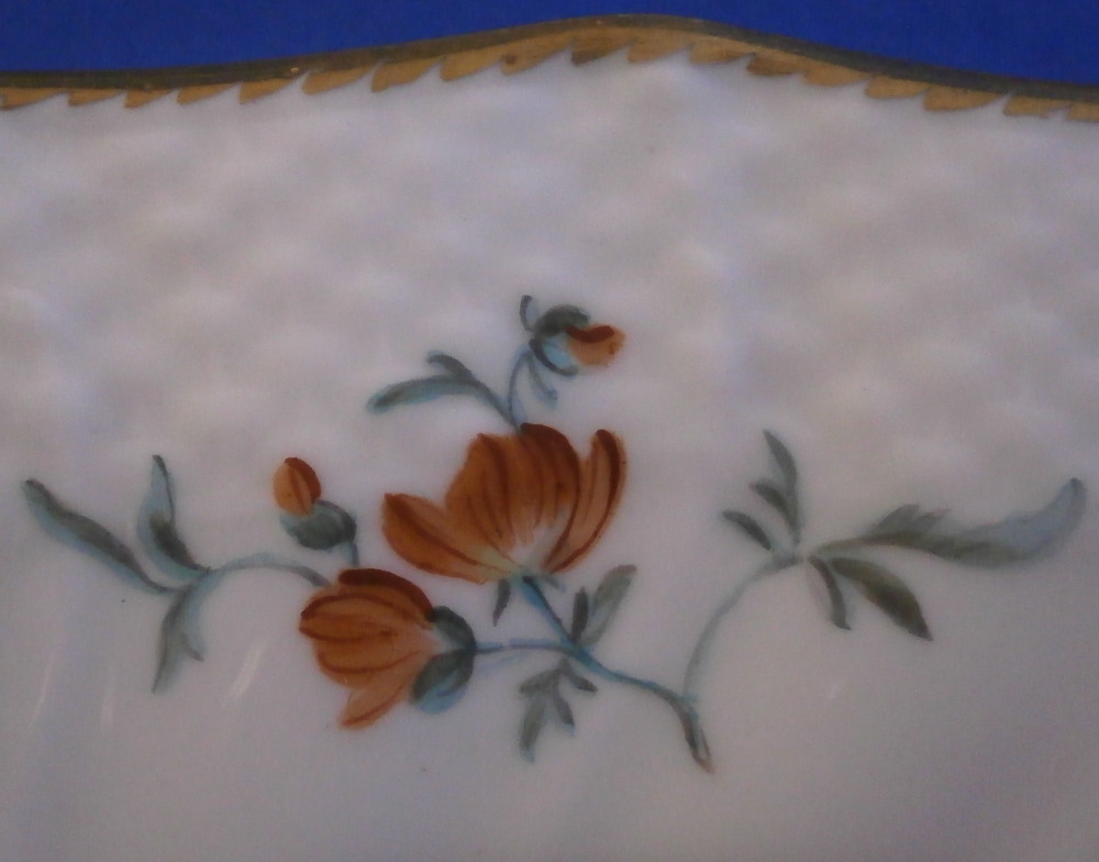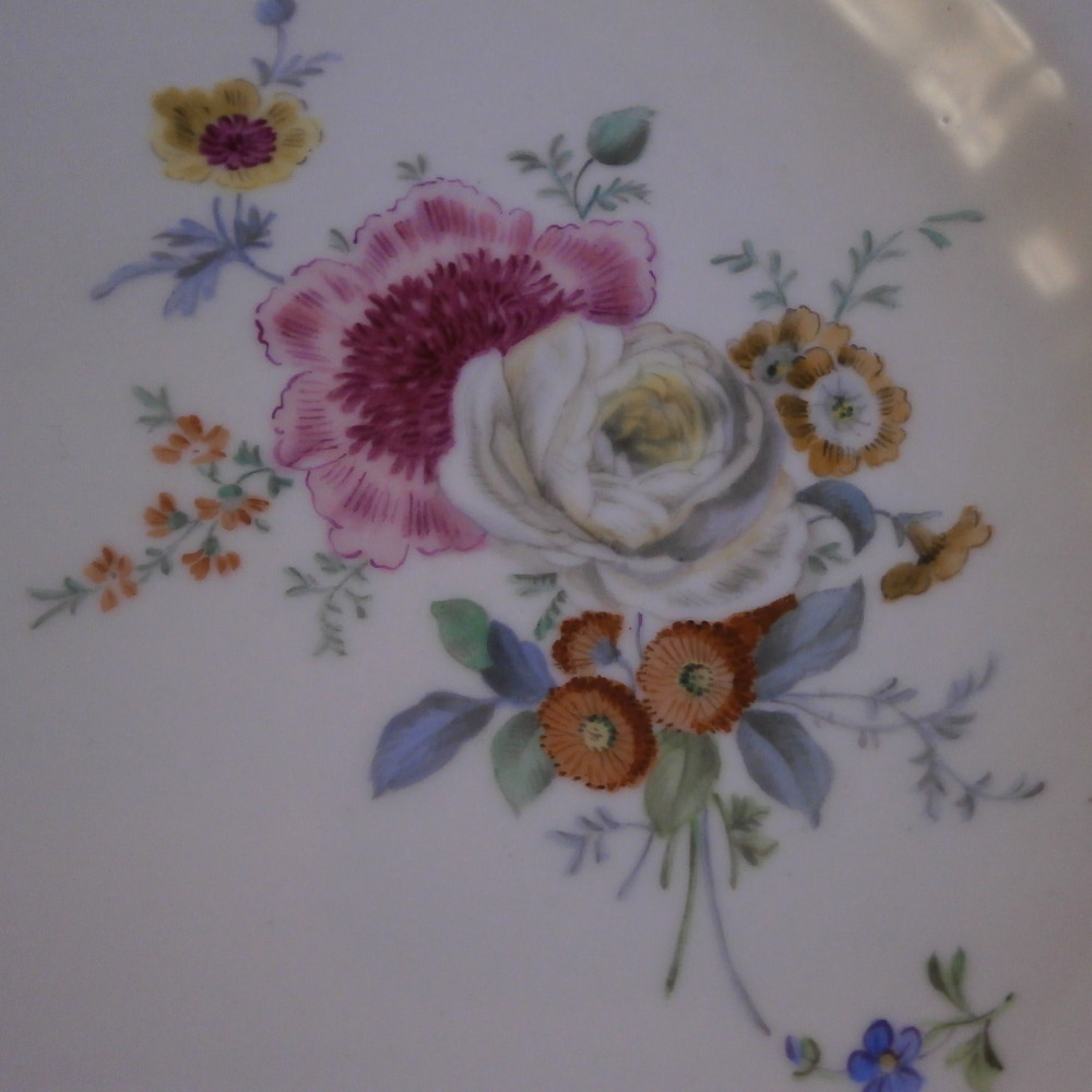 This is a porcelain plate made by the famous St. Petersburg factory during the reign of Czar Alexander II as Emperor of Russia who ruled from 1855 until 1881. Very reminiscent of the Royal Copenhagen Saxon Flowers design porcelain plates but here made by the Imperial factory and a little nicer if I may say so. The plate has a relief design to the rim with a nice gold trim to the edge. There are five single flwoers hand painted along the rim with a superb large floral arrangement to the right side of the well and three more single flowers and a leaf design filling in the rest of the space. A really ncie looking plate fit for royalty! The plate is in perfect condition. It is marked with the green A II mark under the crown with the roman numeral VI under it as well as the typical green dots along the foot rim no one seems to really know what their meaning is and an impressed number as shown. The plate is 1.625 inches tall and 9.75 inches in diameter. Please email me for more information or other pictures.