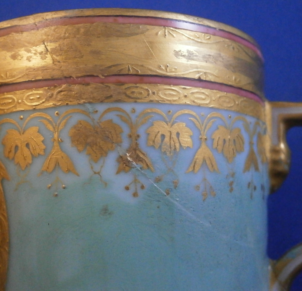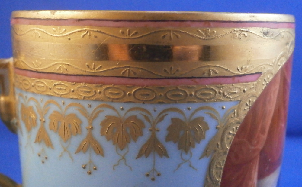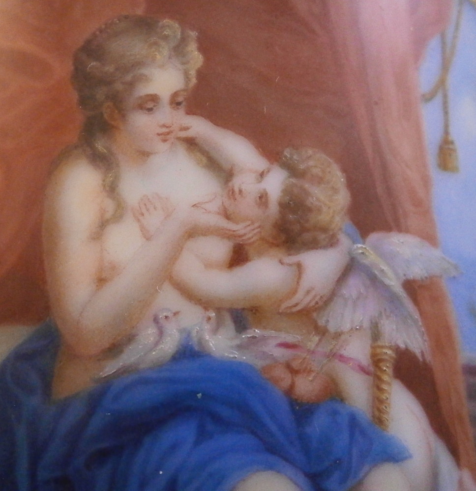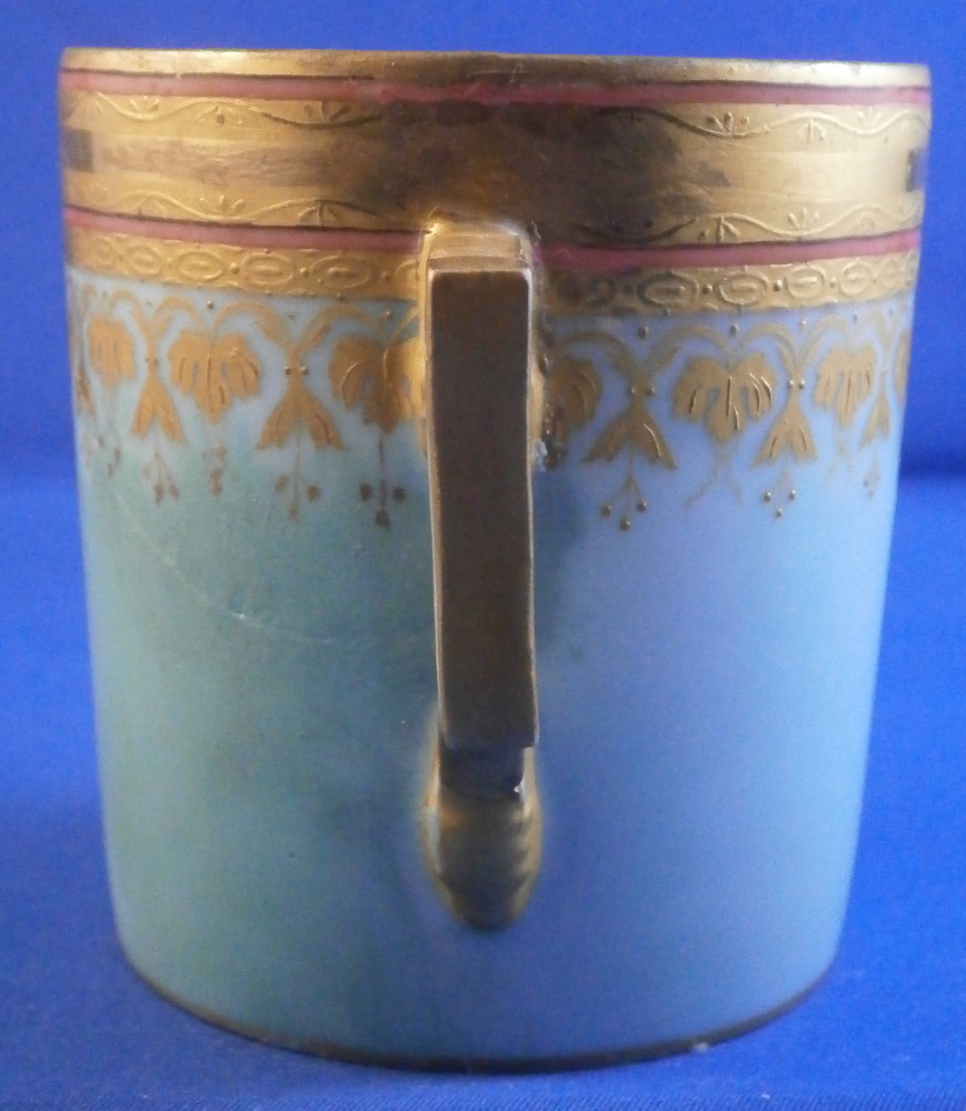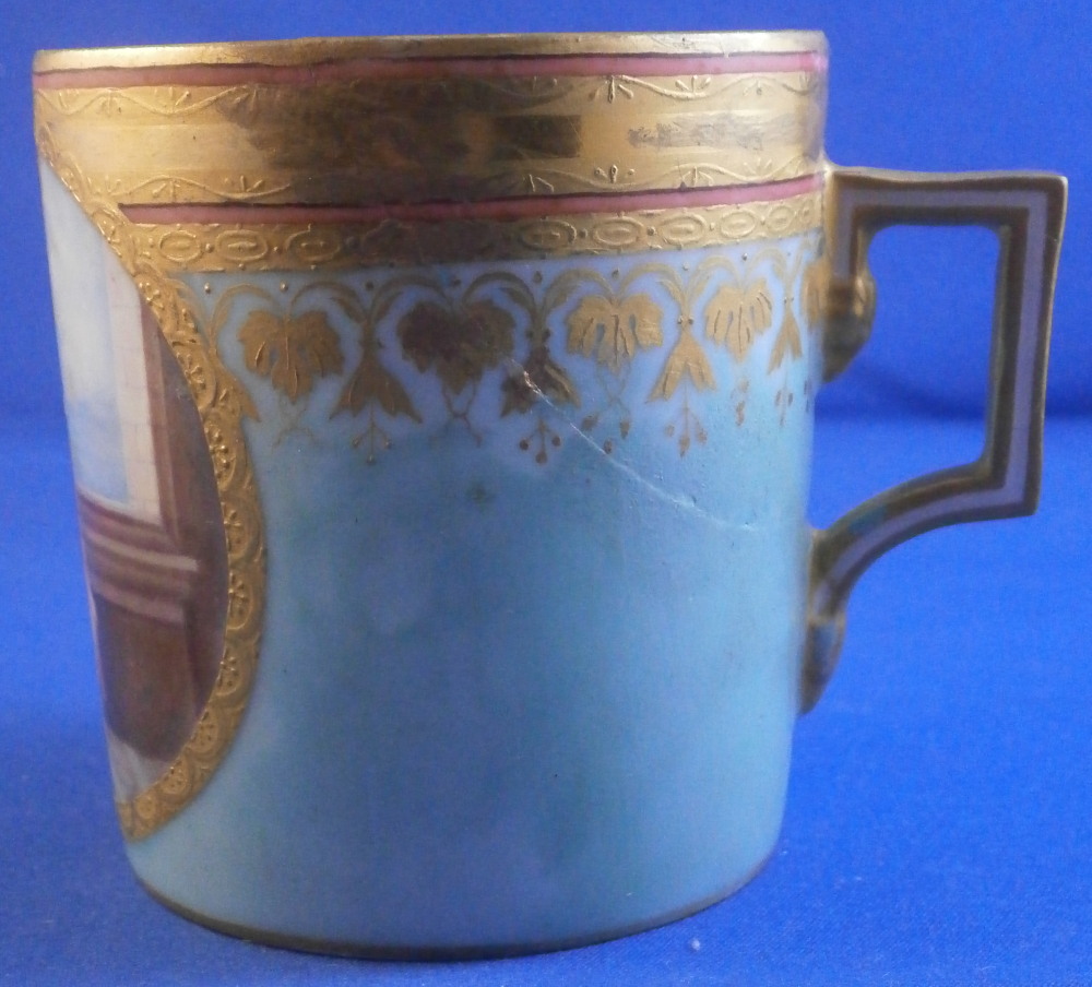 This is a rare porcelain cup / mug made by the famous St. Petersburg Imperial factory during the reign of Tsar Alexander III as Emperor of Russia in 1892. This is probably the best decorated piece I ahve owned by them! The cup is very much in teh style of Royal Vienna pieces. It is large enough that it might be a small mug in which case it never would have had a saucer but I am unsure. he piece is hand painted with a superb scene to the front of what is probably Venus and Cupid. She is sitting with her breasts exposed, two white doves in her lap with Cupid looking as if he wants to climb in her lap for a hug. Nice drapes in the background and cupid's bow on the tile floor. The scene is surrounded by a partially raised gold trim. The rest of the cup has a turquoise ground color to it with some nice gold trim to the top rim with pink and black lines to break it up. A gold design coming down from the rim into the turquoise ground. Some of the gilding has raised elements to it. Typical handle shape for the classicism period highlighted with gilding. The cup is marked with the Saint Petersburg , Russia , under glaze green mark Czar Alexander III 92 for 1892 as well as a green dot near the edge as shown typical for authentic pieces but not sure what they represent. Now for the not so great news. The piece has a large chunk broken out of the one side including the handle which is broken through the bottom terminal. It is one large piece so it should not be hard for a good restorer to get it back to perfection since the current restoration isn't exaclty great. It's functional but could be done better for sure. The cup is just under 3 inches tall with a diameter of 2.75 inches. Please email me for more information or other pictures.