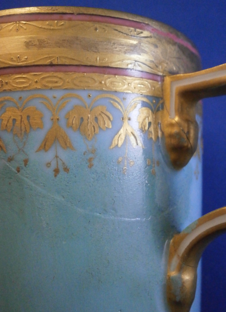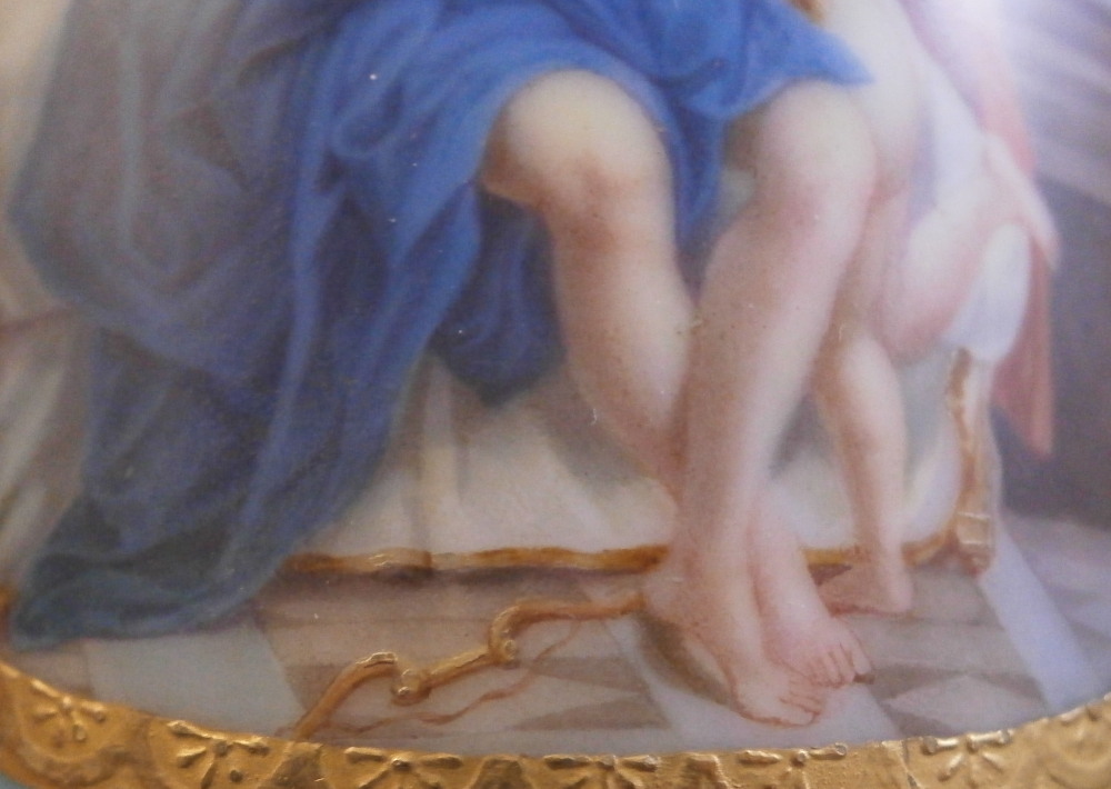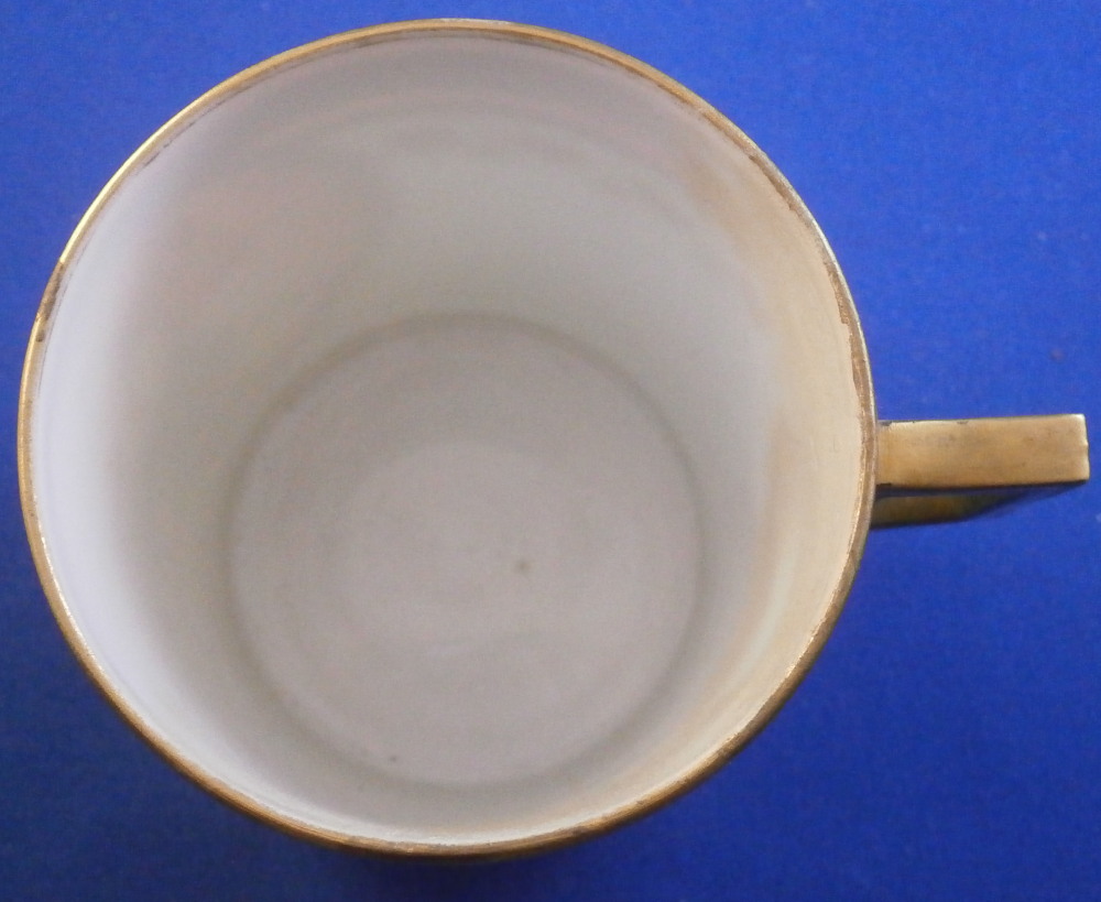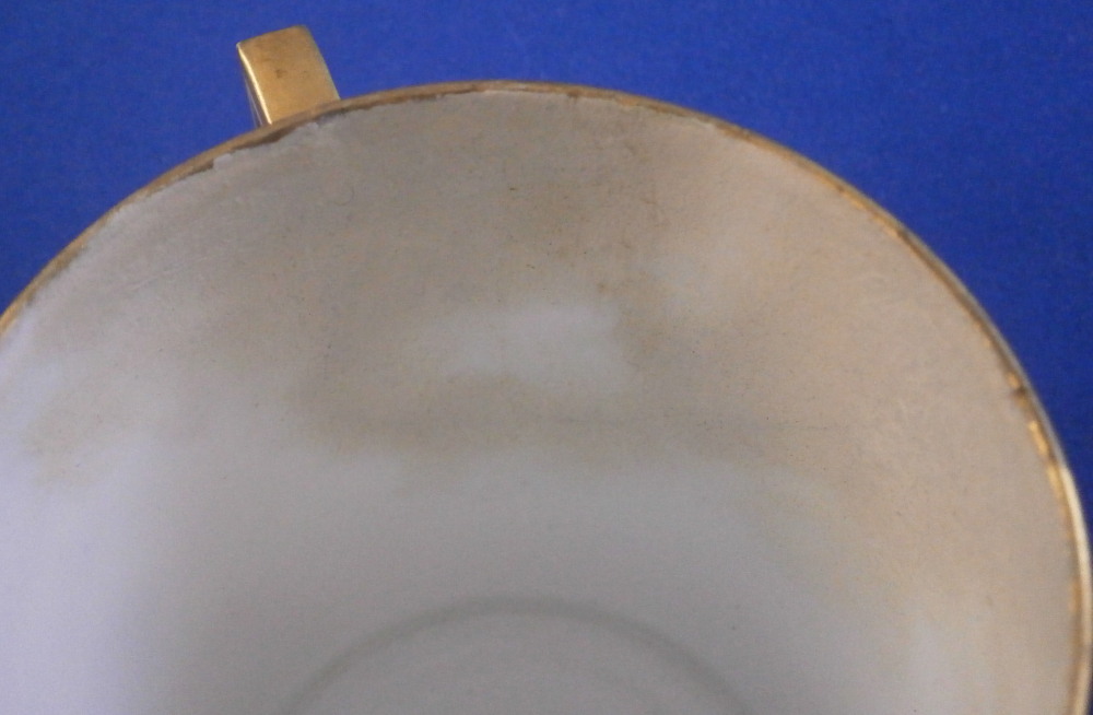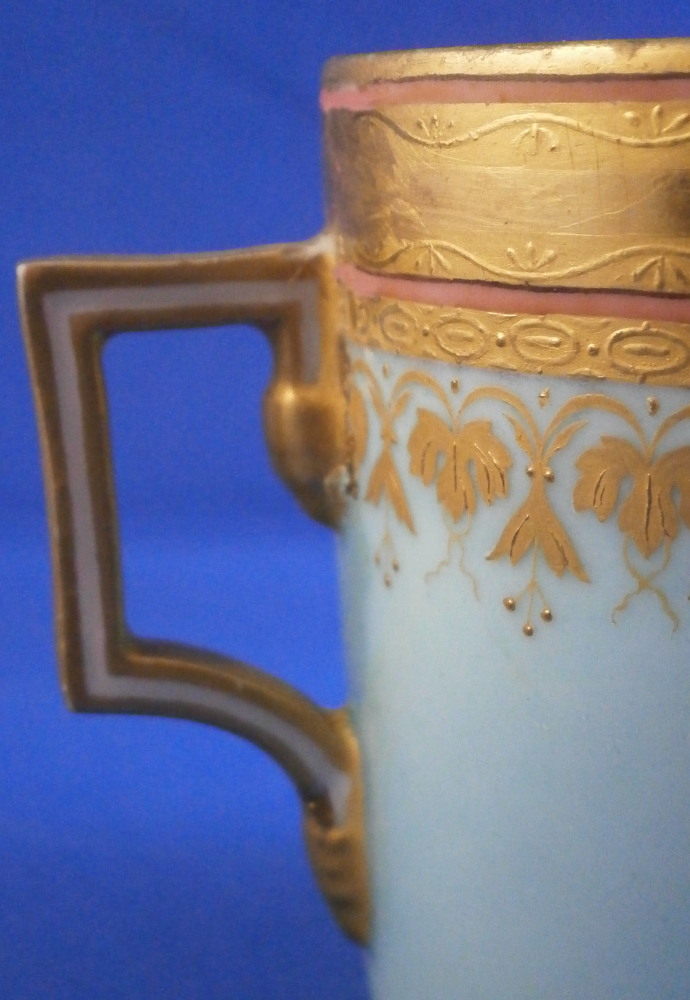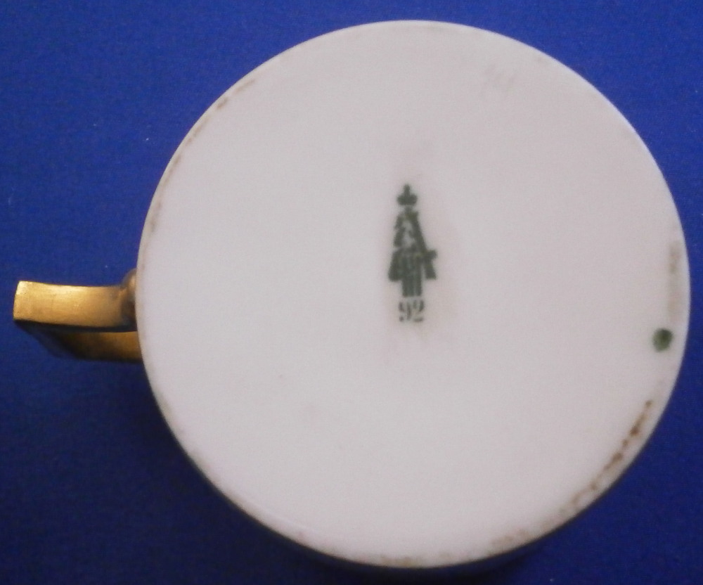 This is a rare porcelain cup / mug made by the famous St. Petersburg Imperial factory during the reign of Tsar Alexander III as Emperor of Russia in 1892. This is probably the best decorated piece I ahve owned by them! The cup is very much in teh style of Royal Vienna pieces. It is large enough that it might be a small mug in which case it never would have had a saucer but I am unsure. he piece is hand painted with a superb scene to the front of what is probably Venus and Cupid. She is sitting with her breasts exposed, two white doves in her lap with Cupid looking as if he wants to climb in her lap for a hug. Nice drapes in the background and cupid's bow on the tile floor. The scene is surrounded by a partially raised gold trim. The rest of the cup has a turquoise ground color to it with some nice gold trim to the top rim with pink and black lines to break it up. A gold design coming down from the rim into the turquoise ground. Some of the gilding has raised elements to it. Typical handle shape for the classicism period highlighted with gilding. The cup is marked with the Saint Petersburg , Russia , under glaze green mark Czar Alexander III 92 for 1892 as well as a green dot near the edge as shown typical for authentic pieces but not sure what they represent. Now for the not so great news. The piece has a large chunk broken out of the one side including the handle which is broken through the bottom terminal. It is one large piece so it should not be hard for a good restorer to get it back to perfection since the current restoration isn't exaclty great. It's functional but could be done better for sure. The cup is just under 3 inches tall with a diameter of 2.75 inches. Please email me for more information or other pictures.