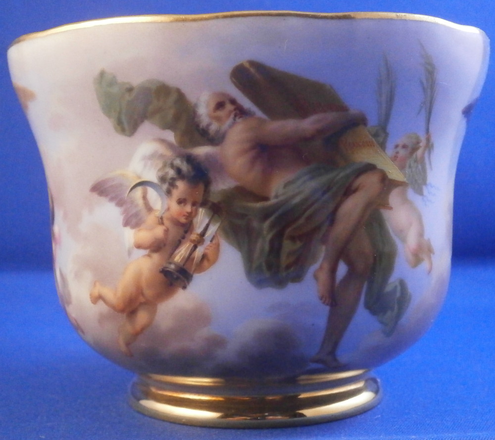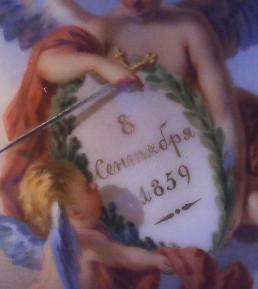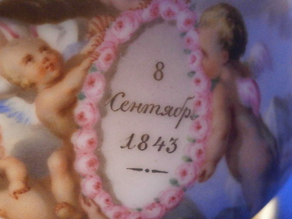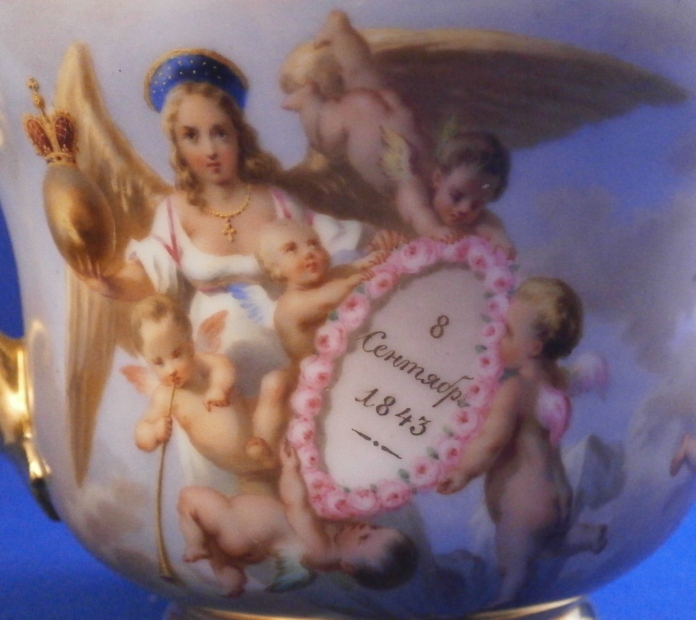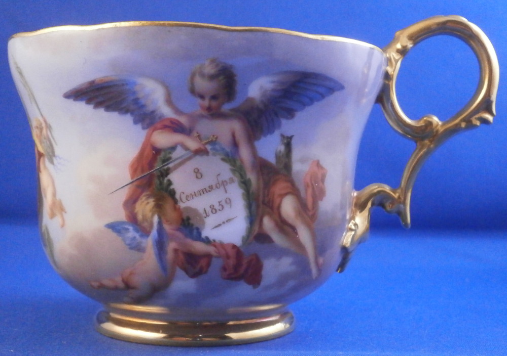 This is a rare and truly superb porcelain cup made by the famous St. Petersburg Imperial factory during the reign of Tsar Alexander II as Emperor of Russia who reigned from 1855 until 1881. This is the best decorated piece I have owned by this maker. The cup is quite large and is hand painted all around the outside with winged gods and cherubs in clouds with some written things on tablets. It has a nice handle that is fully gilded and the inside of the cup is fully gilded except the bottom part. Th e left side of the cup has a large winged cherub as well as a smaller one that are both holding a plaque with September 8, 1859 on it. The larger cherub has a sword in his hand and an owl on his leg. The front of the cup has an older genetleman holding a large book with a cherub to either side. One cherub is holding some scrolls and a sickle with the other holding some sort of greenery. The book has some writing on it as well that state the Chronicles of Russia . The right side of the cup has a winged lady holding an orb with a crown on top and there are five small cherubs holding a plaque with September 8, 1843 on it. Not sure what these dates mean as the only thing I could find is possibly the birthday of Nicholas Alexandrovich depending on which calendar they followed. That might make it his 16th birthday which would be a big enough day for a present like this!? It's an amazing cup just wish I had the saucer! The cup is marked with the Saint Petersburg , Russia , under glaze green mark Czar Alexander II of an A with Roman numerals II under a crown as well as an incised number 25. The piece is in superb condition with a few use marks to the gilding inside but it is as nice as they come! The cup is 3.25 inches tall with a diameter of 3.875 inches - so rather large. Please email me for more information or other pictures.