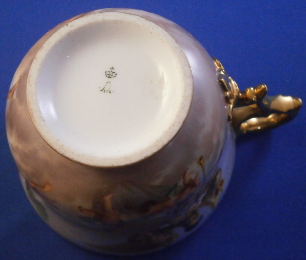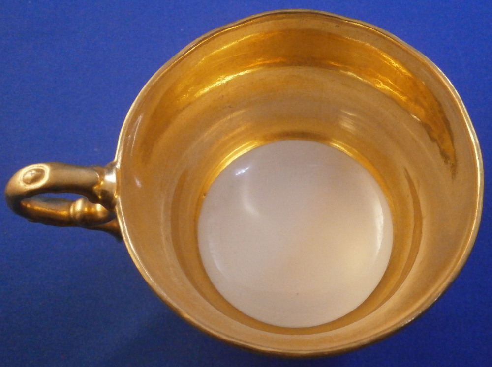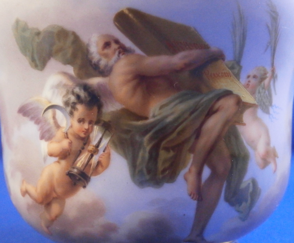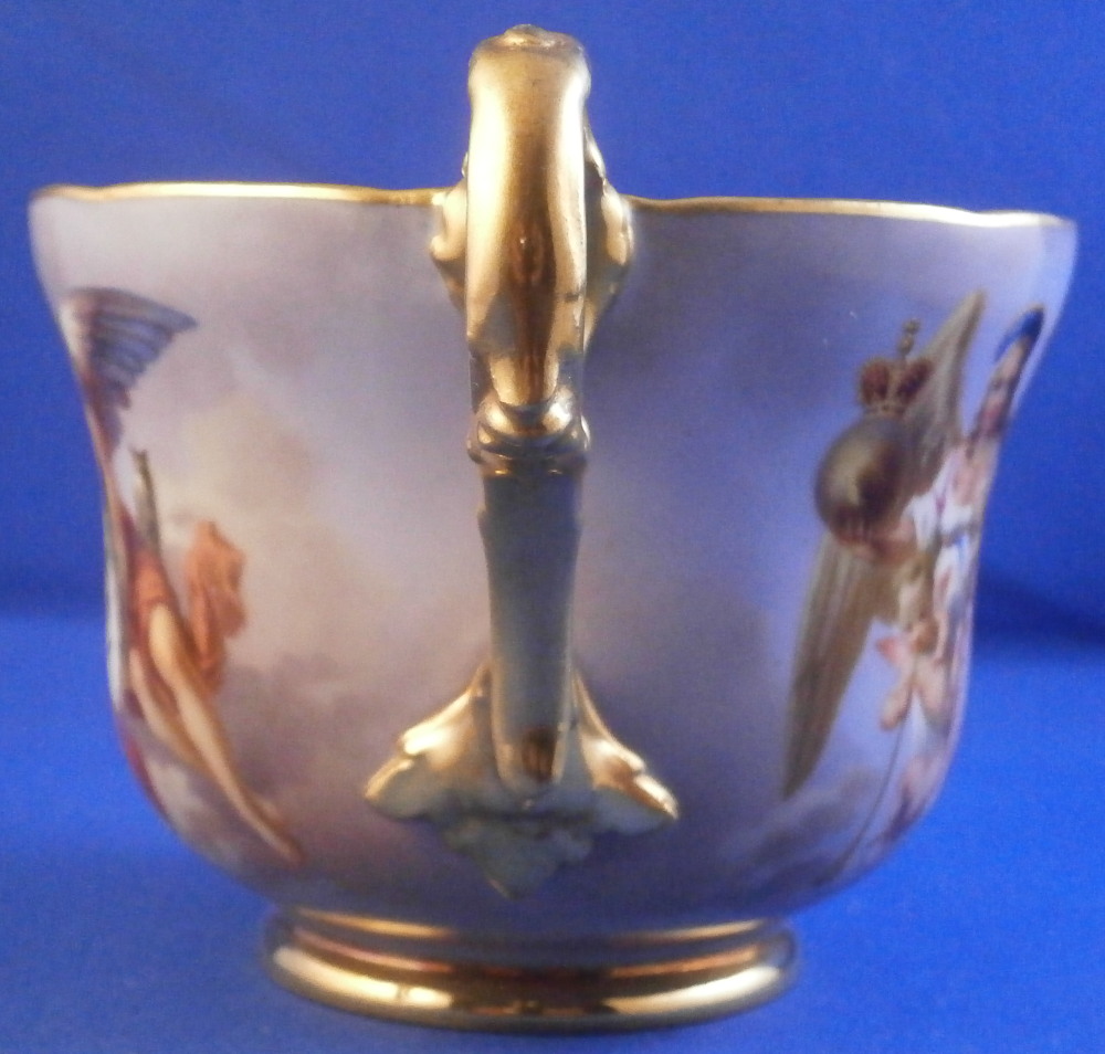 This is a rare and truly superb porcelain cup made by the famous St. Petersburg Imperial factory during the reign of Tsar Alexander II as Emperor of Russia who reigned from 1855 until 1881. This is the best decorated piece I have owned by this maker. The cup is quite large and is hand painted all around the outside with winged gods and cherubs in clouds with some written things on tablets. It has a nice handle that is fully gilded and the inside of the cup is fully gilded except the bottom part. Th e left side of the cup has a large winged cherub as well as a smaller one that are both holding a plaque with September 8, 1859 on it. The larger cherub has a sword in his hand and an owl on his leg. The front of the cup has an older genetleman holding a large book with a cherub to either side. One cherub is holding some scrolls and a sickle with the other holding some sort of greenery. The book has some writing on it as well that state the Chronicles of Russia . The right side of the cup has a winged lady holding an orb with a crown on top and there are five small cherubs holding a plaque with September 8, 1843 on it. Not sure what these dates mean as the only thing I could find is possibly the birthday of Nicholas Alexandrovich depending on which calendar they followed. That might make it his 16th birthday which would be a big enough day for a present like this!? It's an amazing cup just wish I had the saucer! The cup is marked with the Saint Petersburg , Russia , under glaze green mark Czar Alexander II of an A with Roman numerals II under a crown as well as an incised number 25. The piece is in superb condition with a few use marks to the gilding inside but it is as nice as they come! The cup is 3.25 inches tall with a diameter of 3.875 inches - so rather large. Please email me for more information or other pictures.