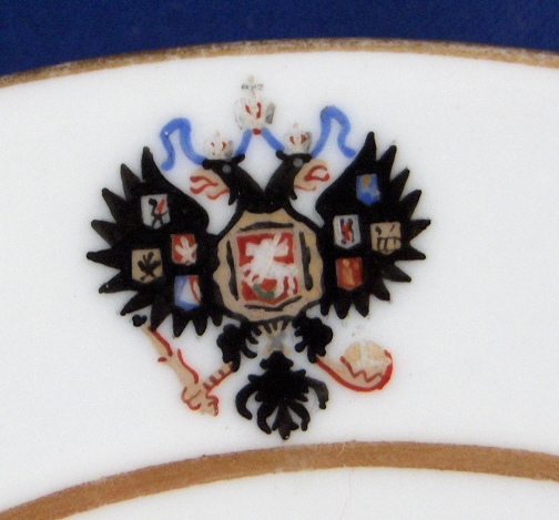 This is a porcelain plate from the Coronation service made by the famous St. Petersburg factory during the reign of Nickolas II in 1903. This service was originally ordered for the coronation of Tsar Alexander III in 1882 and again for the coronation of Csar Nicholas II. It is fairly simple compared to some of the other services I have seen but still very nice. Handpainted with two gold rings around the rim with a nice handpainted armorial of the Imperial Eagle at the top. The plate is in perfect condition with the tiniest amount of wear. It is marked with the green N II mark under the crown with the year mark of 1903 underneath as well as the typical green dots on the rim no one seems to really know what their meaning is and two red letters K or something along those lines. The plate is 0.875 inch tall and 7.125 inches in diameter. Please email me for more information or other pictures.