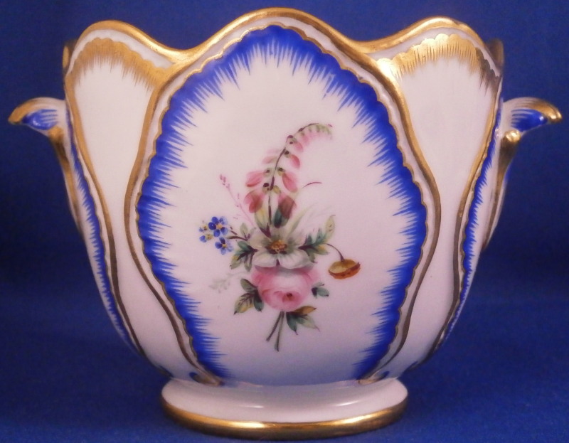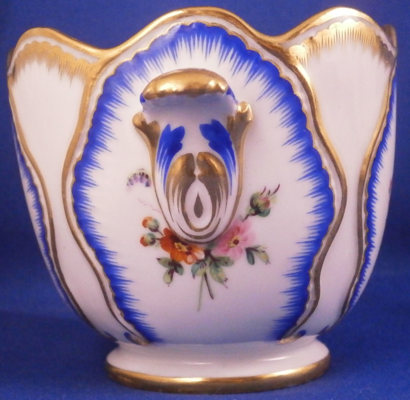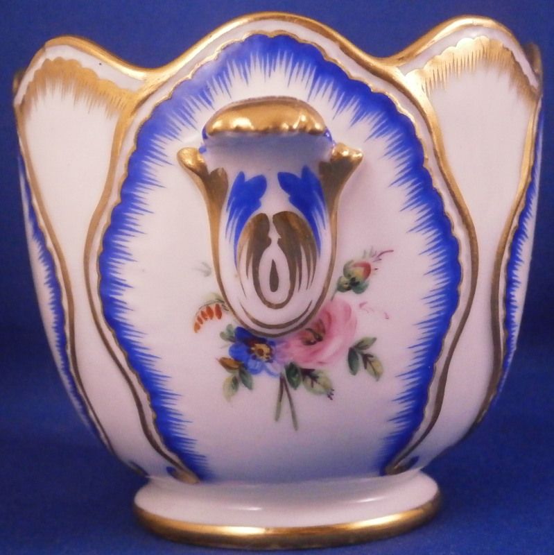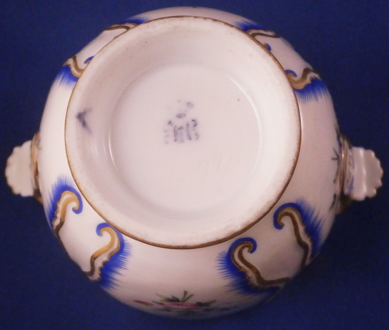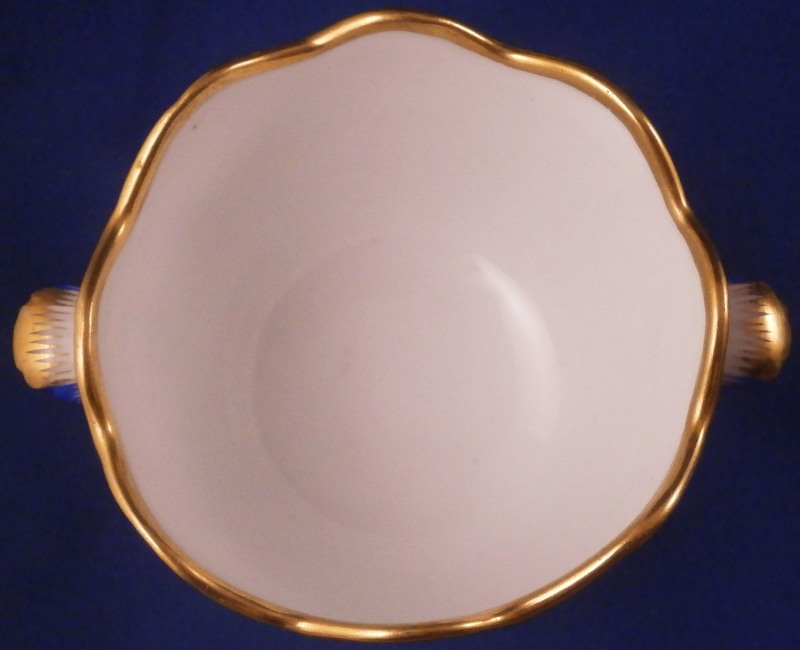 This is a rare porcelain custard cup from the Imperial Peterhof Banquet Porcelain Service made for the Grand Peterhof Palace by the famous St. Petersburg Imperial factory during the reign of Tsar Nikolai the 1st . Nicholas I reigned as Emperor of Russia from 1825 until 1855. The piece is in the shape of a tulip blossom with wild flower floral arrangements to each side as well as the front and back within a blue and gold edged cabbage leaf design. A small handle to either side. The design is based on the original 18th century Sevres Feuille de Choux pattern. The piece is in perfect condition ith almost no signs of wear. It is always nice to have a fun piece like this from an important service and one from the original period from when it was first made instead of a later replacement piece. The piece is marked with the blue N I mark under the crown as shown as well as an incised number and a letter A (I think) along the inner foot ring as shown. The cup is 2.625 inches tall with a top diameter of 3 inches with the handles sticking out about 0.375 inches from that. Please email me for more information or other pictures.