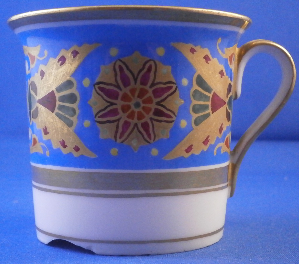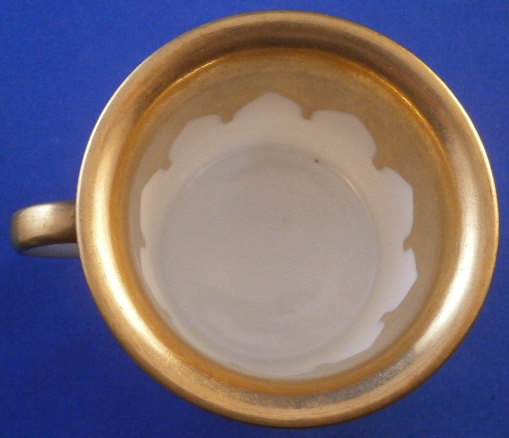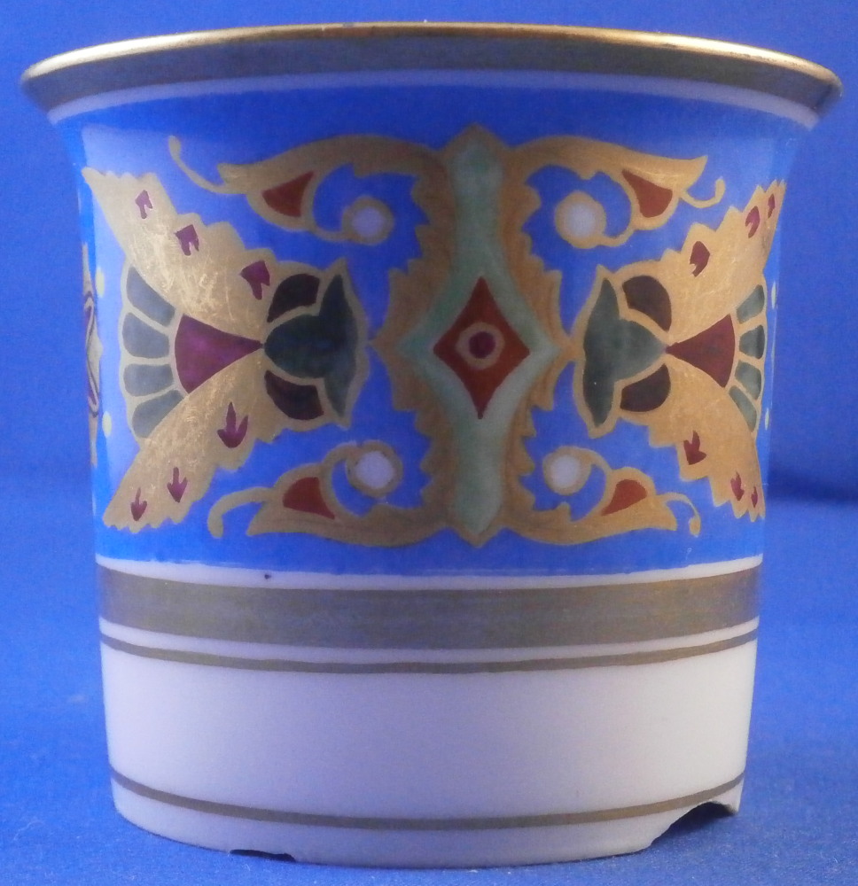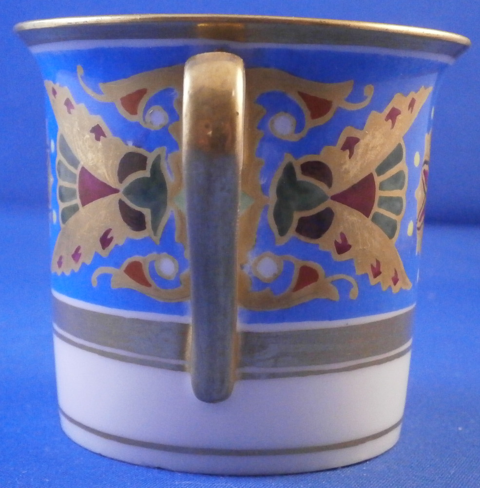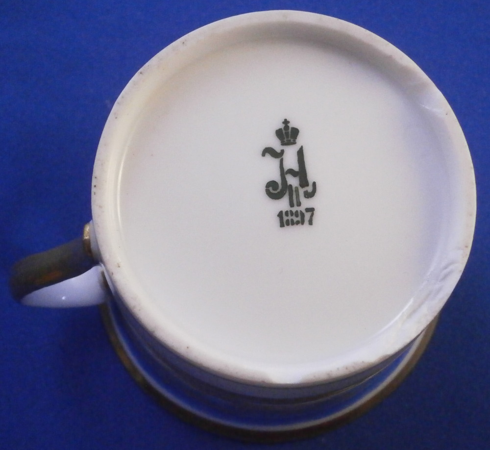 This is a rare porcelain cup from the Gothic service made by the famous St. Petersburg Imperial factory during the reign of Czar Nikolai II or Nicholas the 2nd who ruled from 1894 until his death in 1917. This cup is from 1897. The Gothic service was a Christmas present for Tsar Nicholas I in 1833 and was used for banquets in the Winter Palace for a long time. New pieces were added by the later Tsars until the end of their rule. The piece is hand painted with a superb and colorful design to the top two thirds of the outside which reminds me of stained glass including flowers and what looks like bugs. Very stylized! The design is quite colorful and looks amazing against the blue ground. Some gold trim to the rest of the piece which is especially nice on the inside as shonw. The cup displays nice but has damage to the foot rim as shown. There are four chips to it. This would be a very easy fix for a restorer especially since it does not involve gold trim or color. No saucer. The piece is marked with the green N II mark under a crown with 97 as the year mark underneath. An incised number to the paste. The cup is just under 2.625 inches tall and 2.875 inches in diameter. Please email me for more information or other pictures.