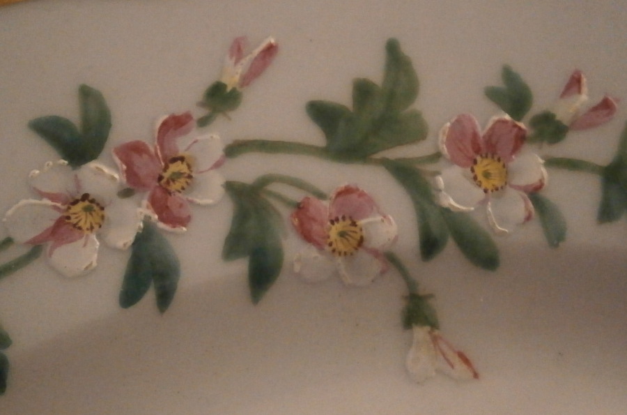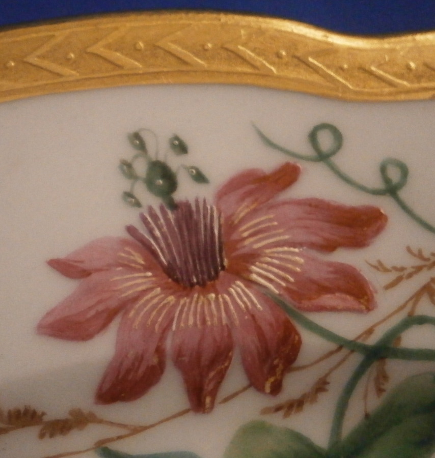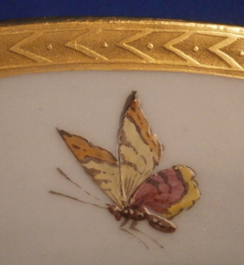 This is a superb porcelain plate made by the famous St. Petersburg factory during the reign of Alexander II in 1893. Not from a service I am familiar with but that makes it even more special. Not something you will find again anytime soon. The plate is hand painted with a superb bird scene on a light blue ground with a white center. The bird (not sure what kind it is) is sitting on a branch which has leaves and pink & white flowers to it spreading around half the plate and there is another branch with its leaves and superb large pink flower going the other way. A butterfly opposite to the bird, gold trim around the center and a superb gold trim that is partially raised around the edge finish off this superb piece. The flowers and bird have white raised details to them that makes them look even nicer. Gold trim to the outside of the foot ring that is always a sure sign of quality! One of the nicest and most unusual pieces by them I have come across in a while. The plate is in great condition with just a minor touch of stacking wear around the edge of the well and a little wear to the bird. It displays superbly! It is marked with the under glaze green A II mark under the crown with the year mark of 93 underneath as shown. It also has two green dots and a single green dot along the foot ring one often finds on authentic pieces by this maker though no one seems to know what they represent. The plate is 1 inch tall and 8.75 inches in diameter. I have another matching plate with a different bird scene also on the site if anyone wants a pair. Please email me for more information or other pictures.