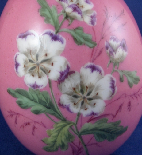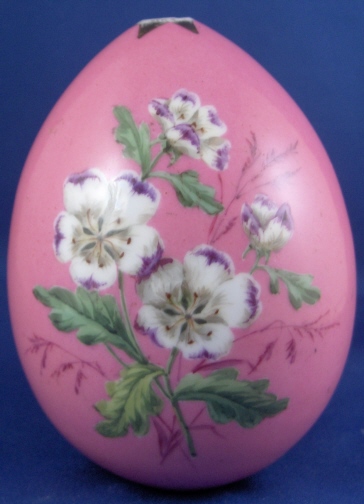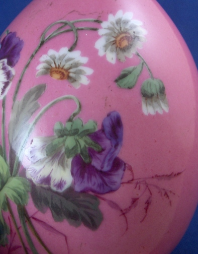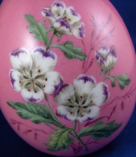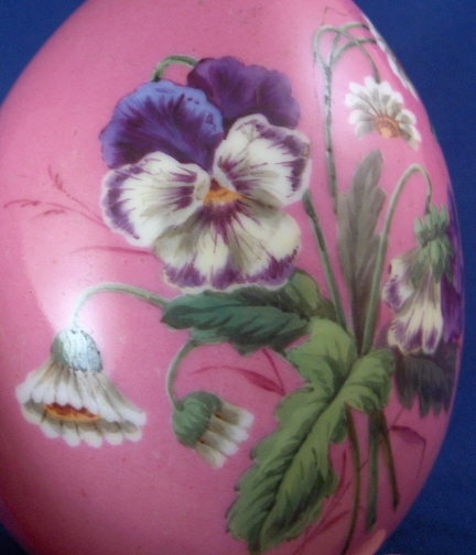 This is a rare large imperial Easter egg made in Russia in the early 20th century or a bit earlier. I am sure it is not one of those lousy copies floating around but I do not know if this is an imperial piece or by one of the other factories. Maybe someone has a better idea and can let me know! It is however a stunning and rather large egg - handpainted with a pink ground color with a floral arrangement on two sides with a gold star around the top and bottom hole. The flowers are of very good quality! The egg is about 4.5 inches tall and about 3.375 inches in diameter. It is not marked but these were never marked. Please email me for more information or other pictures.