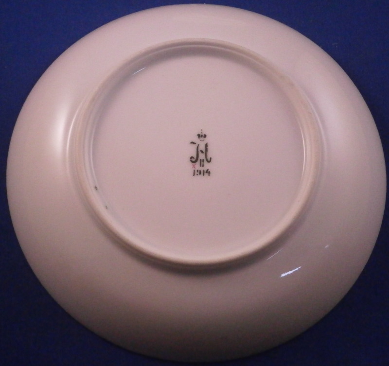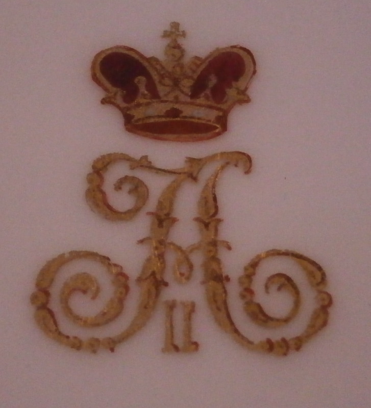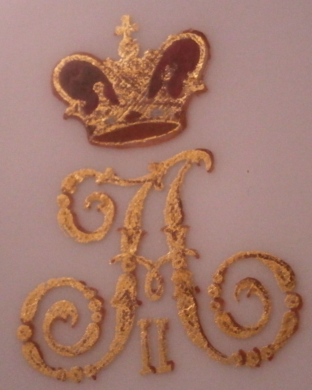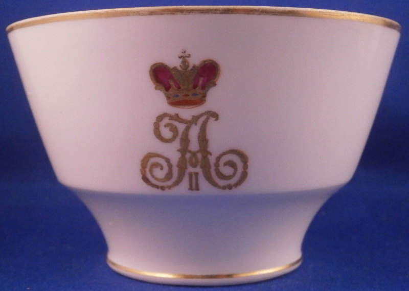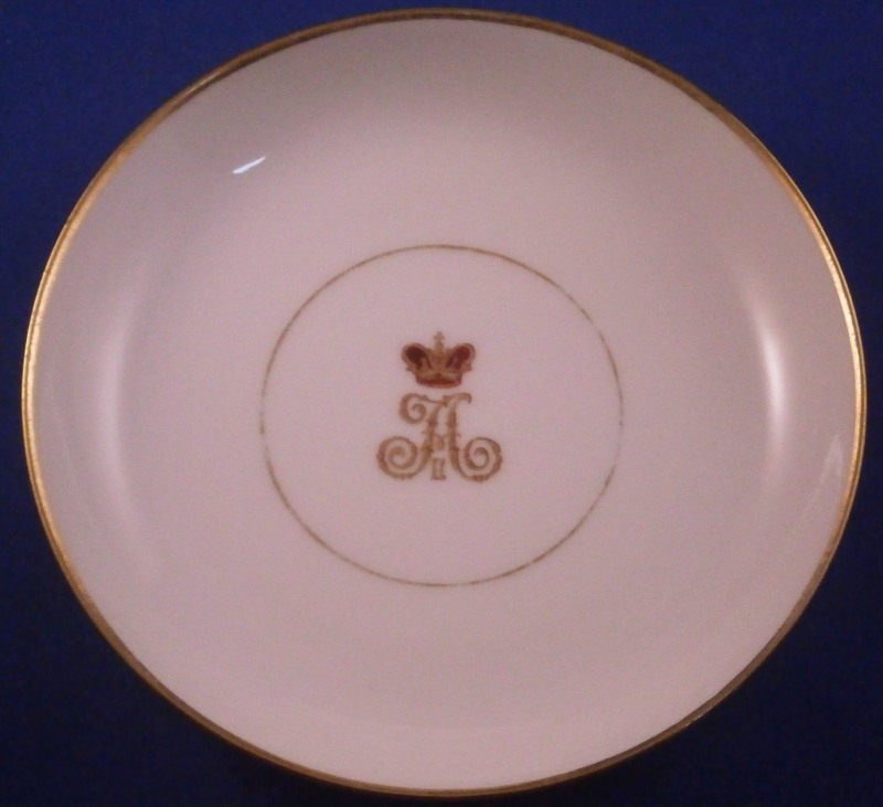 This is a nice porcelain cup and saucer from the Farm Palace Service at Alexandria Park in Peterhof made by the famous St. Petersburg Imperial factory during the reign of Tsar Nikolai the 2nd. Both peices are hand painted with the monogram / cypher of Tsar Alexander II . Originally the service was made during the reign of Nicholas I and decorated with the monogram of the heir to the throne, Grand Duke Alexander ( Alexander Nikolaevich ) but the set here was one of the additions which were made until the revolution and the end of the Czars. The cup has a nice shape to it and with the monogram to the front and a gilded handle to the opposite side. Gold trim to the top and bottom edge. The saucer has the same design in the center and a gold ring around the well and the edge. The cup & saucer are in greatt condition with just a touch of wear to the gilding. No chips, etc. They are marked with the green mark for Nickolas II under a crown with the year mark 1914 under it, a pink X (on the saucer only) and two dots near the footring as shown. These are important to show they are authentic pieces but no one quite knows what they mean. The cup is 2.375 inches tall with a top diameter of just under 4 0.75 inches. The saucer is 1.125 inches tall with a diameter of 5.75 inches. A nice set with some real history attached to it. Please email me for more information or other pictures.