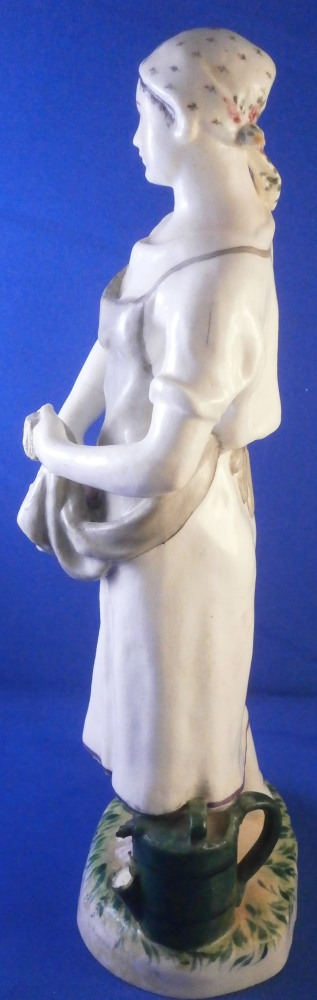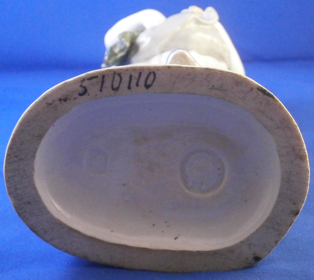 This is a rare original period figurine called the Gardener made by the State Porcelain Factory in Leningrad ( Used to be St. Petersburg Imperial factory ) in Soviet Russia in 1928. These Russian figurines from this period are quite rare and sought after! This figure was modelled by Alexander Terentewitsch Matweew in 1926. Unlike some of his other models this one of the gardening lady with vegetables in her apron is very rare. I have however sold one in better condition before. The figure is superbly modeled and hand painted and one of those pieces that just 'speaks' to you. Just amazing! The piece is of a lady gardener or peasant wearing a nicely painted cloth over her hair while picking beets or radishes or something along those lines which she placed in her apron. A watering can by her side on a nicely painted base. The detail of the painting is amazing and looking at this piece one can understand why these pieces are so popular! The figure is in OK condition. The greenery of the vegetables has been restored quite well, The watering can was restored at the handles and is missing the entire spout section, the apron tip she is holding in her left hand should be draped over a bit longer and the back of her hat covering is missing one of the ends. Some fine crazing throughout and a firing line on her left should side. An easy fix for a good restorer and this examples is a lot cheaper than the one in better condition I already sold. So it is easily worth the cost of having her brought back to perfection! The figurine is marked underneath with the impressed hammer and sickle mark with the piece of cog and 1928 (a rare anniversary mark) as shown. Also an impressed square with the artist initials in it. The figurine is larger than most being 10.125 inches tall, 3.75 inches wide and 2.625 inches deep. If you collect these pieces she is a must have! Please email me for more information or other pictures.