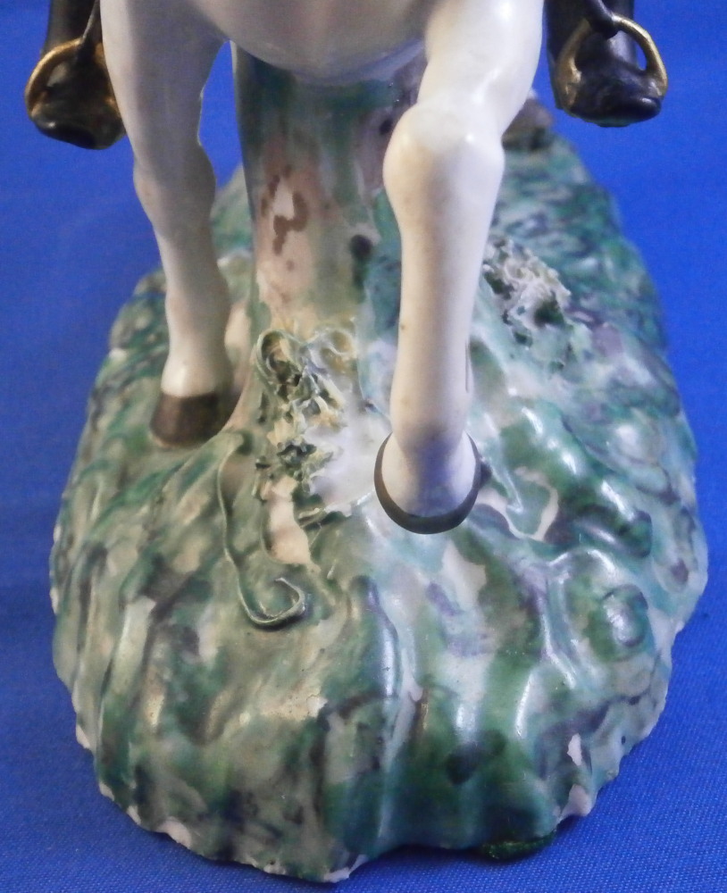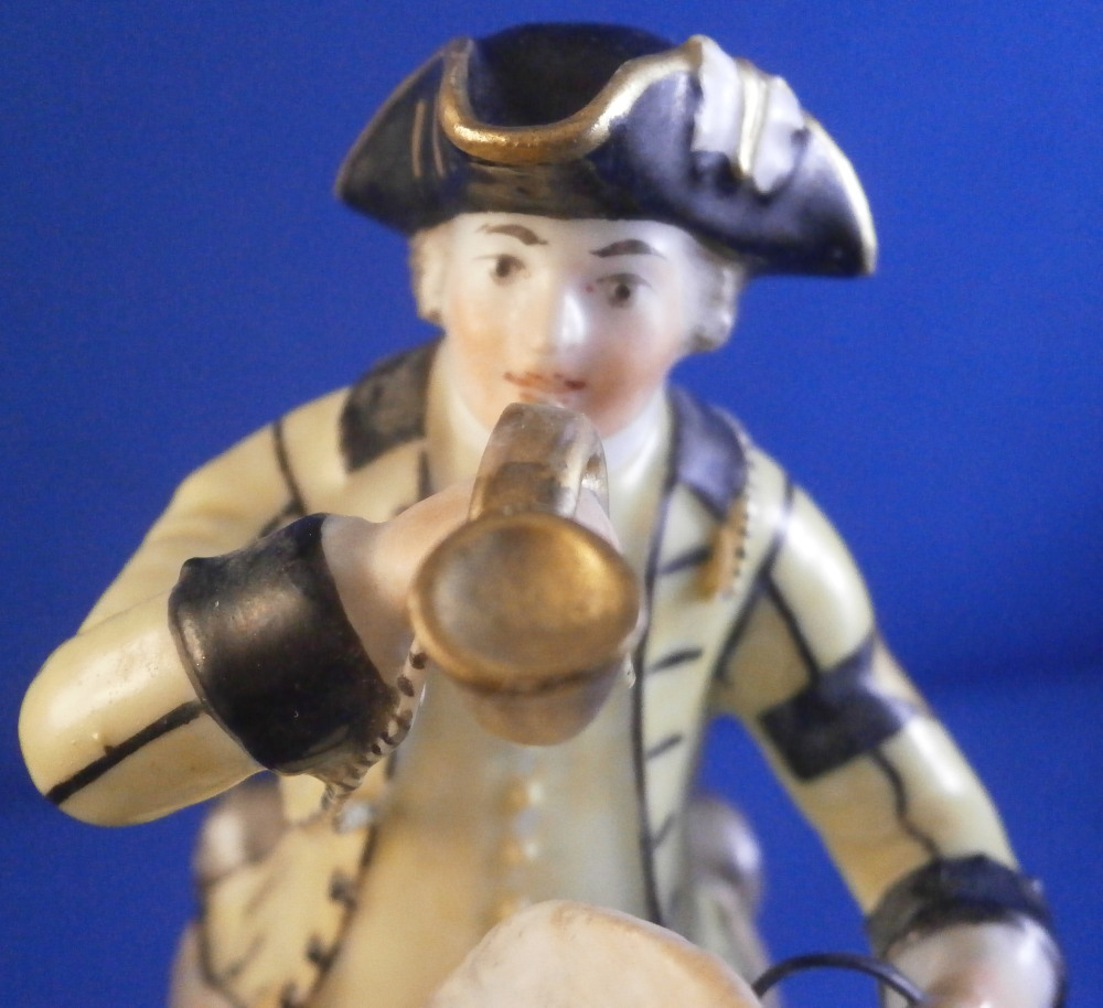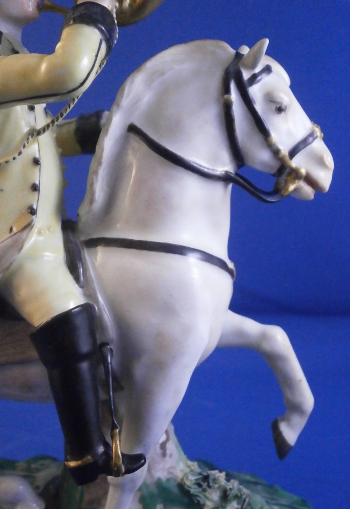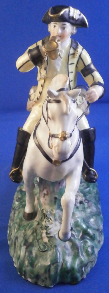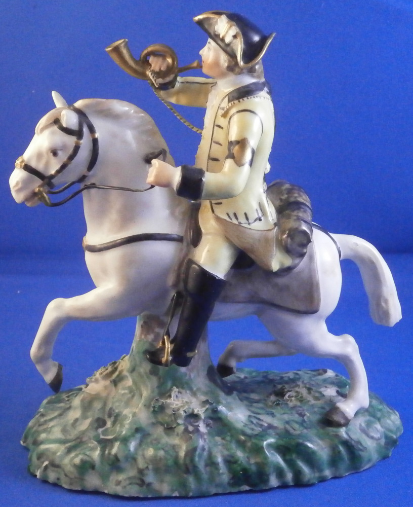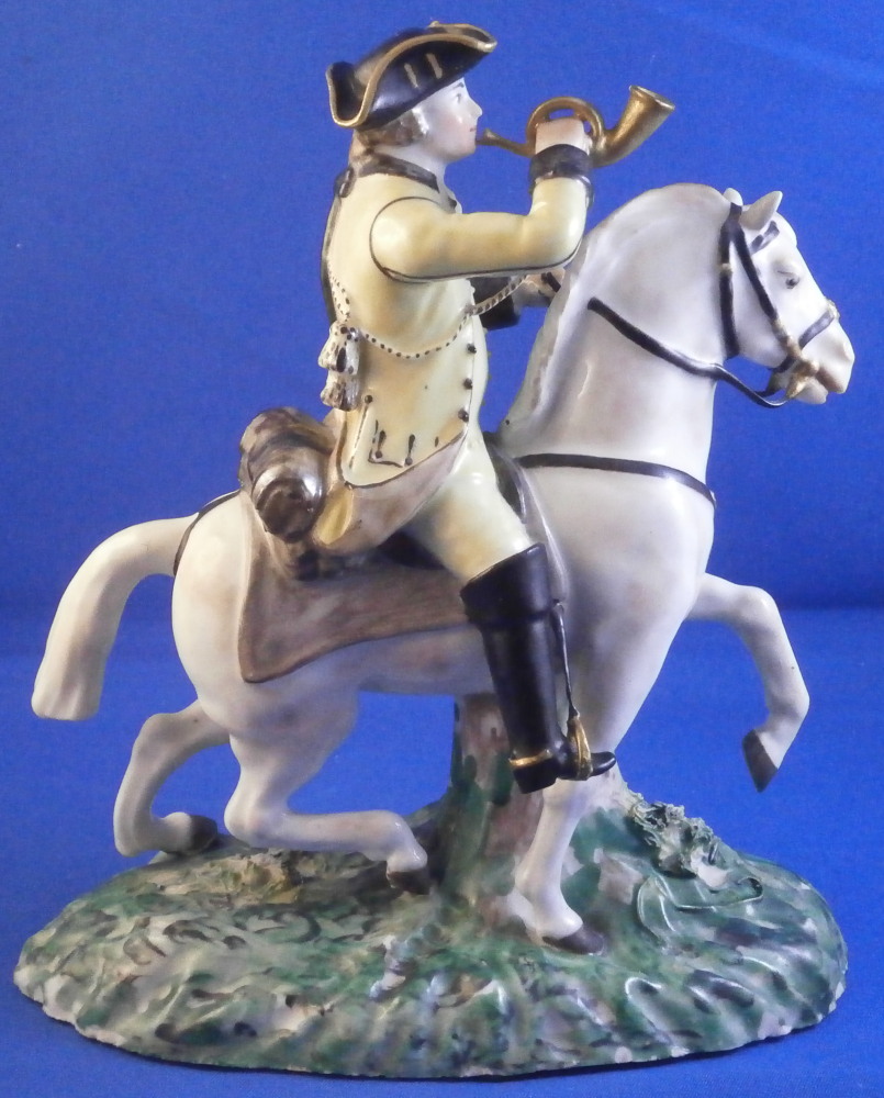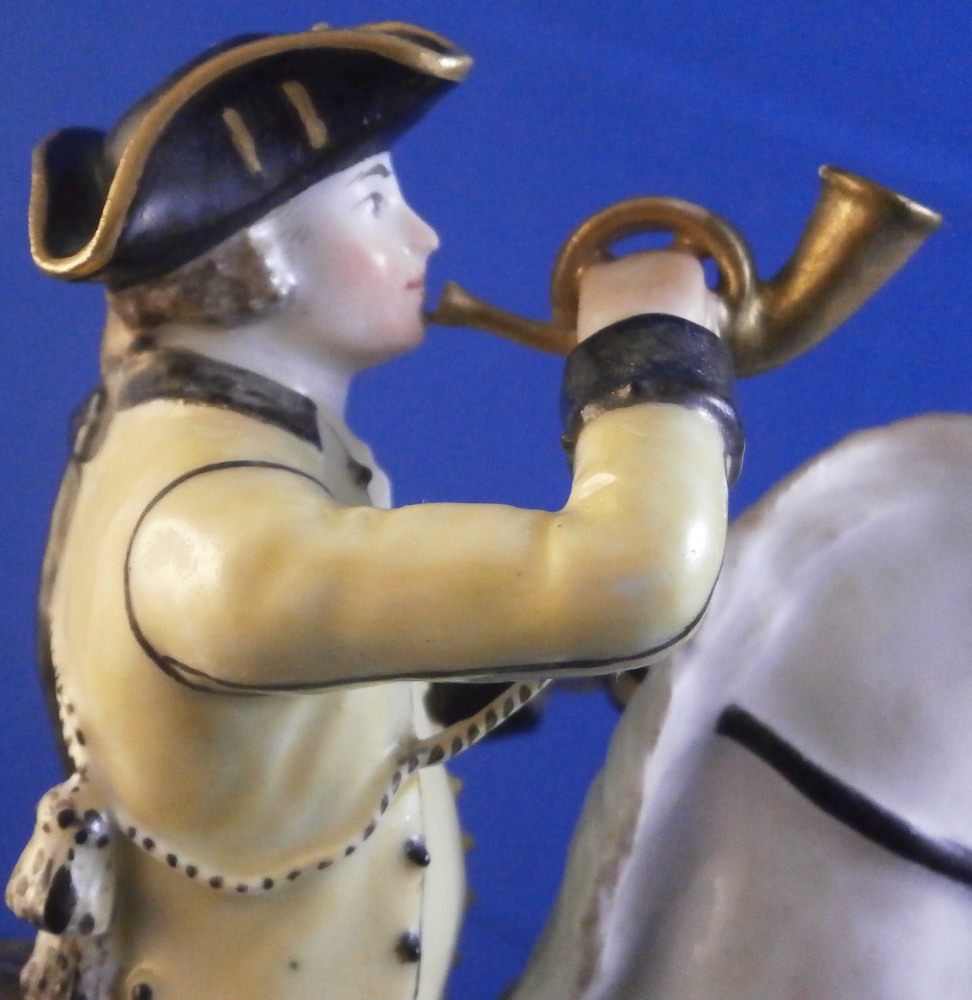 This is a really nice figurine made either at Strasbourg or during the early days at Frankenthal in the 18th century. The figure is of a hunter riding his horse while blowing a hunting horn. Reminiscent of the copies of older Frankenthal models made at Nymphenburg today but I cannot find this model here anywhere. The piece is superbly modeled with a ton of fragiel details and hand painted to perfection. The hunter is wearing a nice outfit that is mostly yellow with black details, tall black boots and a tricorn hat with some gold trim to it. His left hand is holding the reigns while his right is holding the horn. The horse is relaly nicely modeled with one leg up in the front as if in motion. It is supported by a tree trunk in the center - a typical feature on early figurines. The base is rather rough with some green painted on it and grasses attached to it which is quite typical for Frankenthal! The piece is 6.3755 inches tall, 3 inches wide and 5.75 inches long. The figure is marked with an impressed H as shown. Nothing else. The figurine displays superbly but has had some restorations done to it that were extremely well done. I will try to mention what I see but it is not easy to spot at all. So here goes - the tail seems to have been off as was that front leg that is up in the air. The stirups have had work done to them as did the horn. The string connecting the horn to the hunter is missing a piece. One ear on the horse has been worked on as did the reigns ( I have never seen any in all my years restored so well they are so thin and perfect looking!) Some of the applied grasses are missing on the base and there are some nibbles to the edge of the base. Having said all that the piece looks amazing and is a rare early survivor! It's a stunning figurine! Please email me for more information or other pictures.
