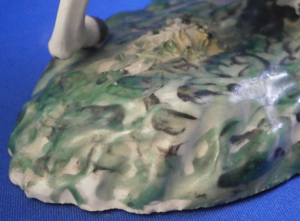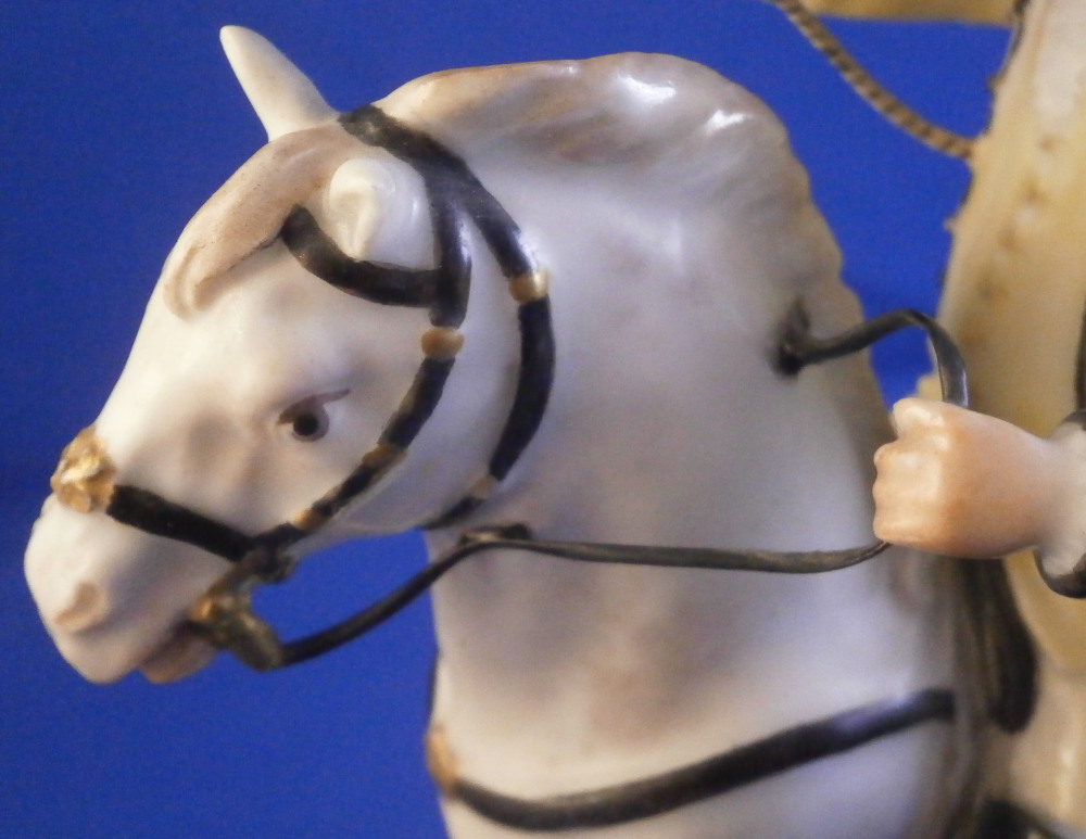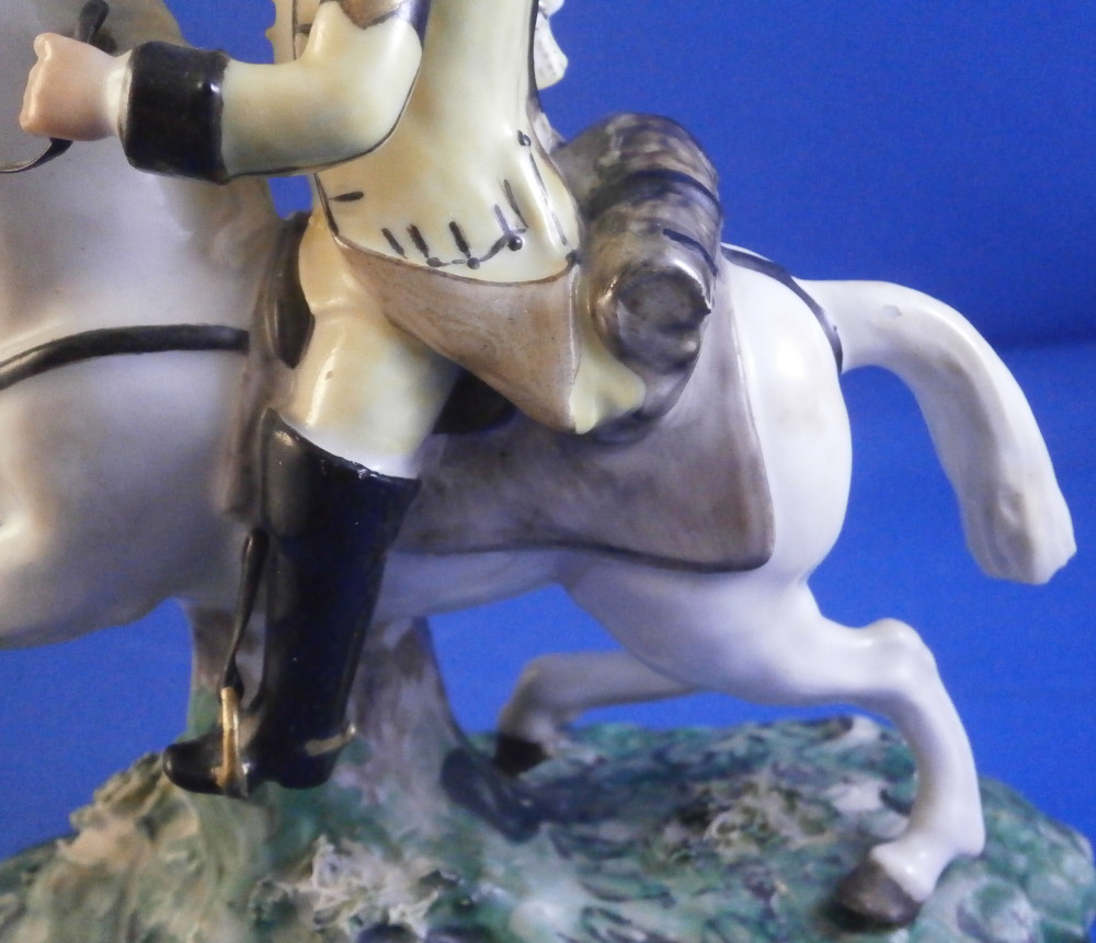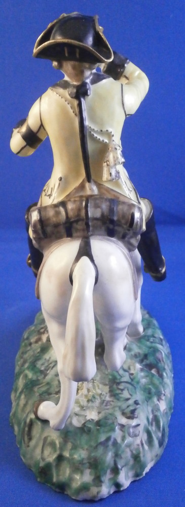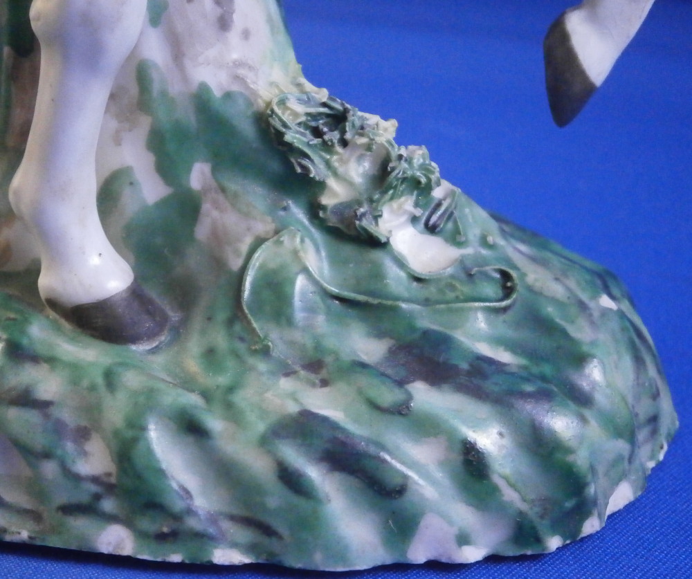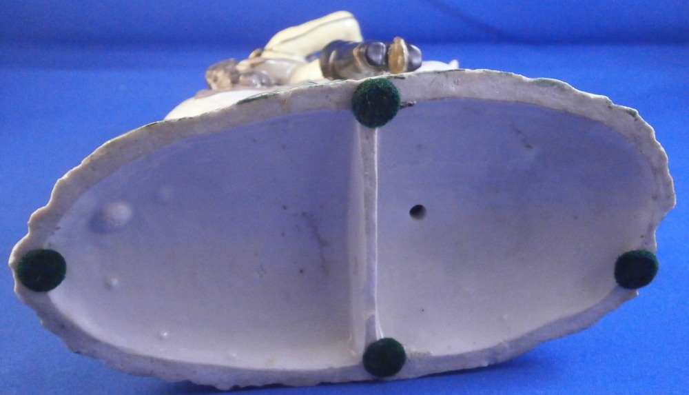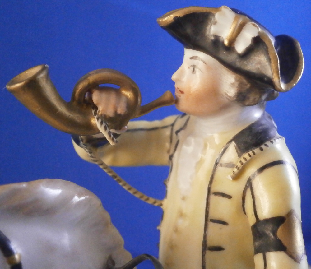 This is a really nice figurine made either at Strasbourg or during the early days at Frankenthal in the 18th century. The figure is of a hunter riding his horse while blowing a hunting horn. Reminiscent of the copies of older Frankenthal models made at Nymphenburg today but I cannot find this model here anywhere. The piece is superbly modeled with a ton of fragiel details and hand painted to perfection. The hunter is wearing a nice outfit that is mostly yellow with black details, tall black boots and a tricorn hat with some gold trim to it. His left hand is holding the reigns while his right is holding the horn. The horse is relaly nicely modeled with one leg up in the front as if in motion. It is supported by a tree trunk in the center - a typical feature on early figurines. The base is rather rough with some green painted on it and grasses attached to it which is quite typical for Frankenthal! The piece is 6.3755 inches tall, 3 inches wide and 5.75 inches long. The figure is marked with an impressed H as shown. Nothing else. The figurine displays superbly but has had some restorations done to it that were extremely well done. I will try to mention what I see but it is not easy to spot at all. So here goes - the tail seems to have been off as was that front leg that is up in the air. The stirups have had work done to them as did the horn. The string connecting the horn to the hunter is missing a piece. One ear on the horse has been worked on as did the reigns ( I have never seen any in all my years restored so well they are so thin and perfect looking!) Some of the applied grasses are missing on the base and there are some nibbles to the edge of the base. Having said all that the piece looks amazing and is a rare early survivor! It's a stunning figurine! Please email me for more information or other pictures.