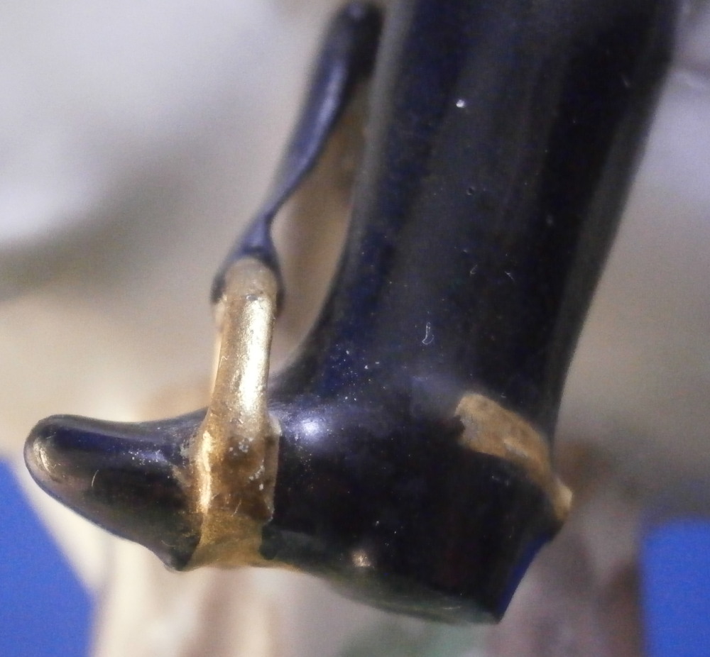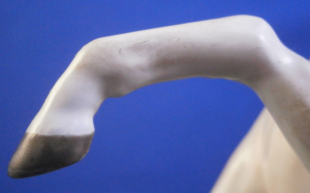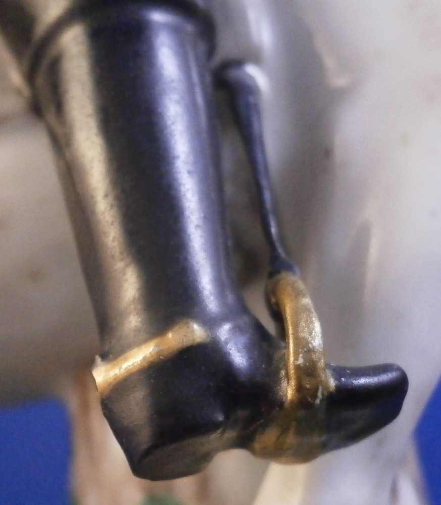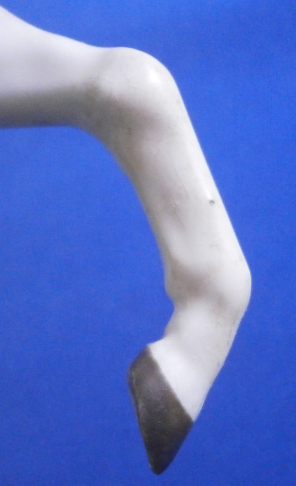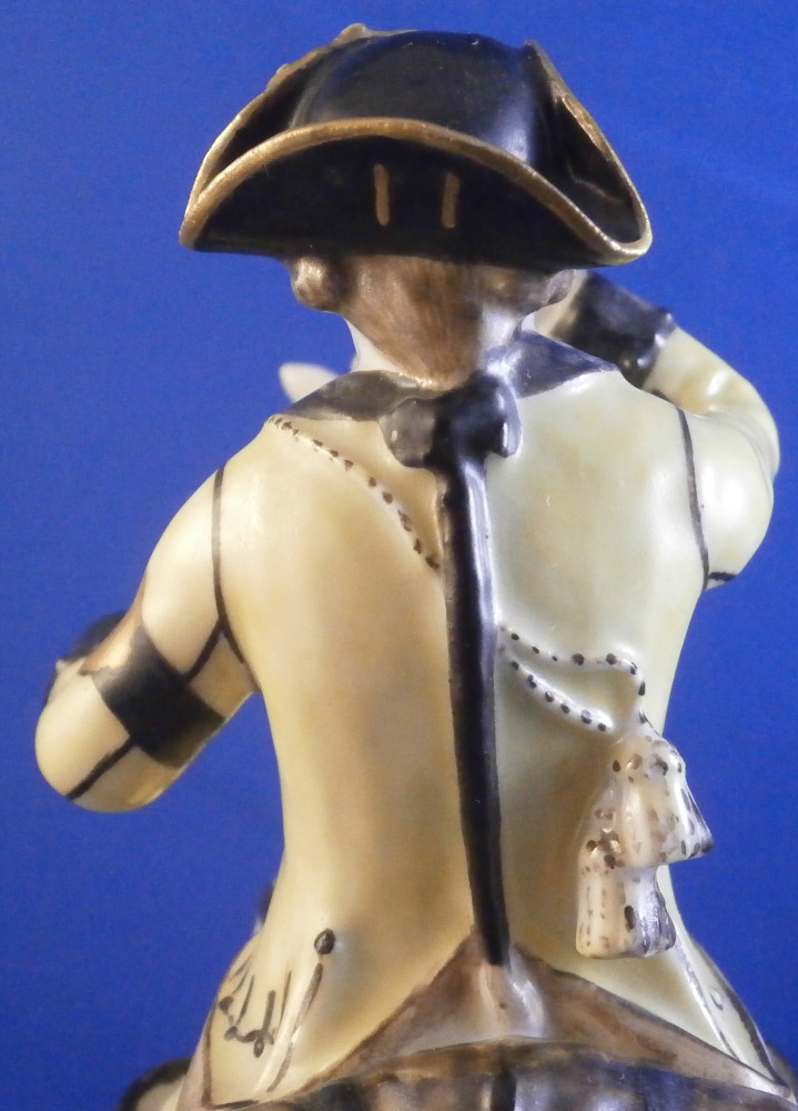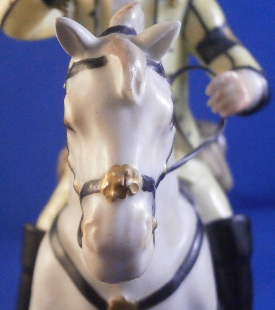 This is a really nice figurine made either at Strasbourg or during the early days at Frankenthal in the 18th century. The figure is of a hunter riding his horse while blowing a hunting horn. Reminiscent of the copies of older Frankenthal models made at Nymphenburg today but I cannot find this model here anywhere. The piece is superbly modeled with a ton of fragiel details and hand painted to perfection. The hunter is wearing a nice outfit that is mostly yellow with black details, tall black boots and a tricorn hat with some gold trim to it. His left hand is holding the reigns while his right is holding the horn. The horse is relaly nicely modeled with one leg up in the front as if in motion. It is supported by a tree trunk in the center - a typical feature on early figurines. The base is rather rough with some green painted on it and grasses attached to it which is quite typical for Frankenthal! The piece is 6.3755 inches tall, 3 inches wide and 5.75 inches long. The figure is marked with an impressed H as shown. Nothing else. The figurine displays superbly but has had some restorations done to it that were extremely well done. I will try to mention what I see but it is not easy to spot at all. So here goes - the tail seems to have been off as was that front leg that is up in the air. The stirups have had work done to them as did the horn. The string connecting the horn to the hunter is missing a piece. One ear on the horse has been worked on as did the reigns ( I have never seen any in all my years restored so well they are so thin and perfect looking!) Some of the applied grasses are missing on the base and there are some nibbles to the edge of the base. Having said all that the piece looks amazing and is a rare early survivor! It's a stunning figurine! Please email me for more information or other pictures.