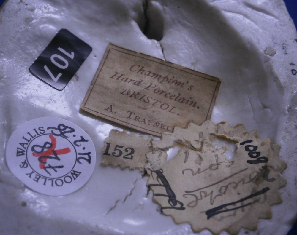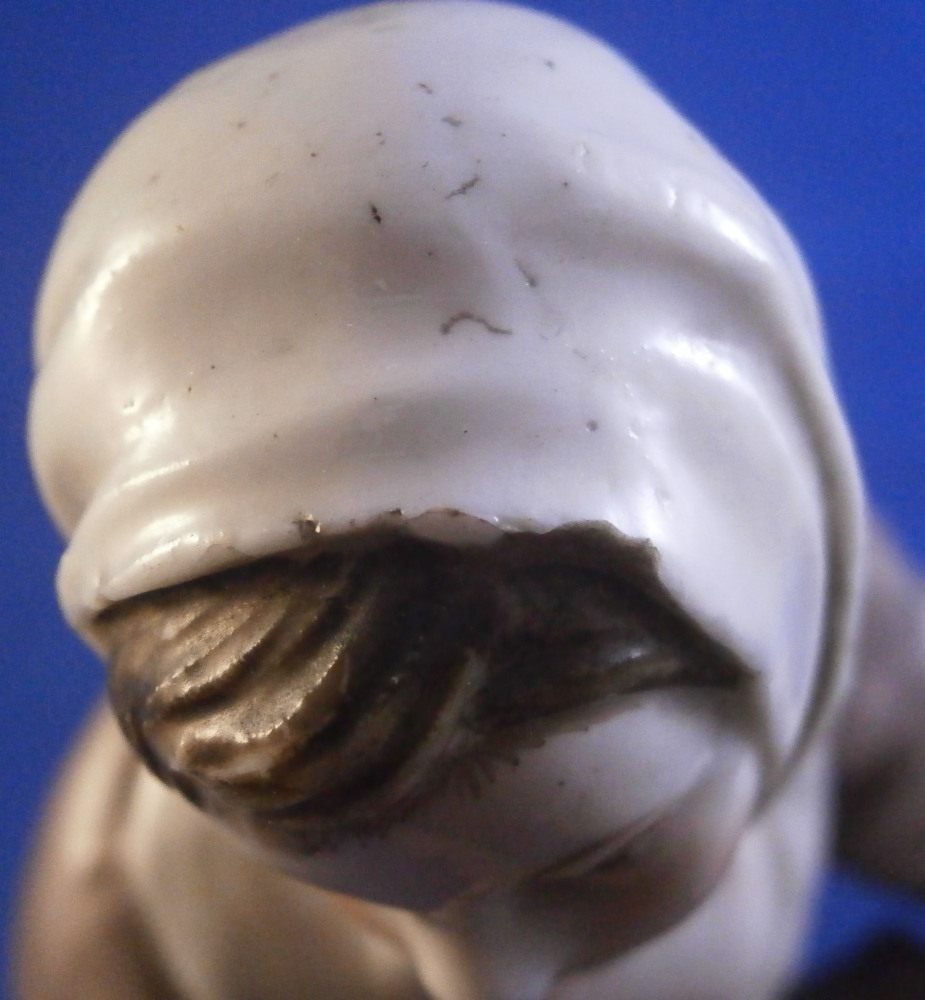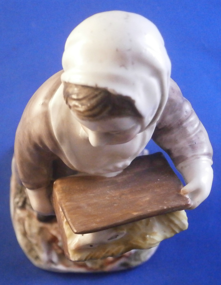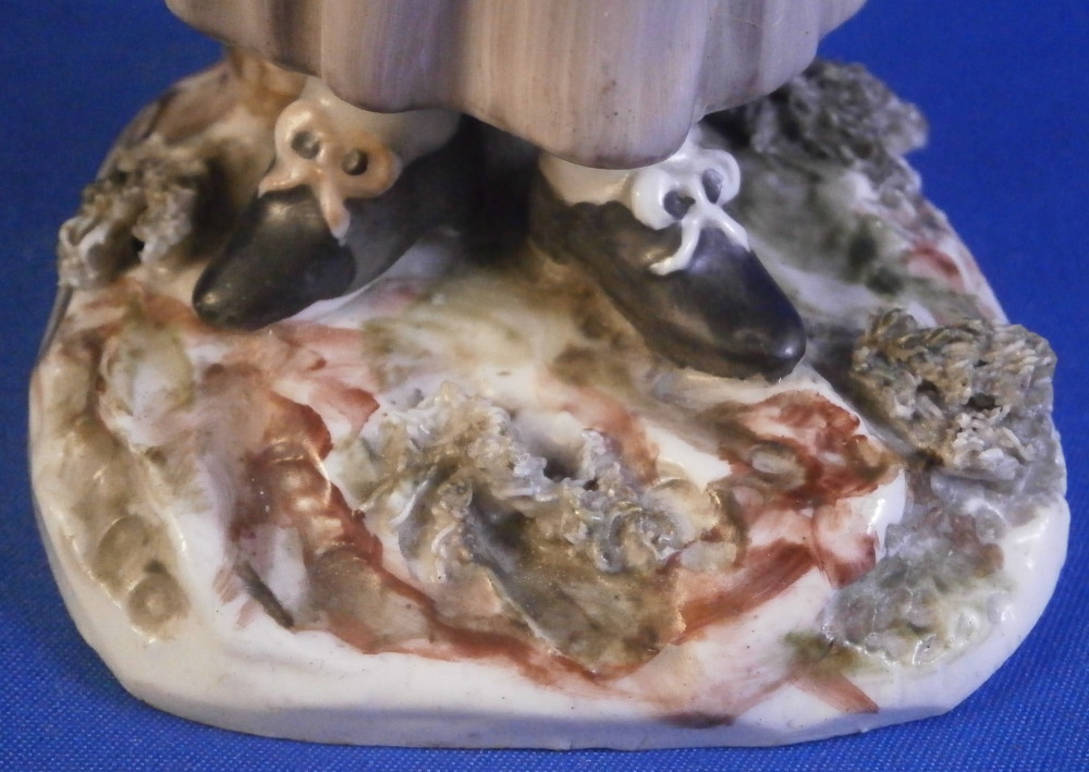 This is a very rare figurine made by Strassburg around 1775 during the period of Joseph Hannong . It is of a lady wearing a light brown outfit, a white head scarf and holding a box with an animal covered in straw in front of her. I think it is a rabbit but it's hard to tell. The figurine is nicely modeled and hand painted. She stands on a base painted with typical colors for this maker as well as fake grass bunches. The figure is no marked underneath but has a lot of old labels. Believed to be a Bristol piece which does not fit at all. The figurine is in great condition with two chips along the edge of the base as shown - one in the back and one to the left side when looking at her. The lid of the box has had the corner restored perfectly. The piece displays perfectly! It is 6.5 inches tall, 2.625 inches wide and 2.625 inches deep. Please email me for more information or other pictures.