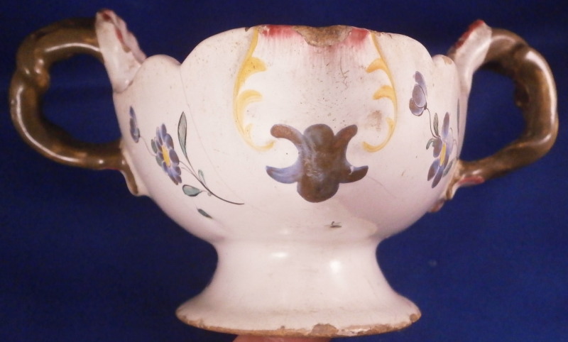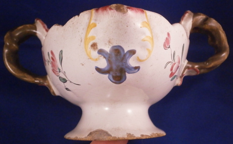 This is a superb faience / majolica sauce boat dish made by Hannong of Strassburg (aka Strasbourg ) in France in the 18th century. It has a nice shape to it and is hand painted with a superb flower arrangement in the center of the inside as well as lots of smaller single flowers scattered around. The twisted branch handles are quite interesting and the outside spouts have a colorful design in blue yellow and puce. These types of dishes are very hard to find since faience is even more fragile than porcelain . The dish is in decent condition with lots of glaze flakes and chips along the edges most of which are small and shallow. There is a large chip to the foot as shown and lots of nibbling all around. Some glaze lines all around which is a common issue on these early pieces. These are not cracks just in the glaze! One of these looks like a glaze crack but is in fact a hairline crack to the side of the spout. It still displays nicely and is not something one can find easily. Worth adding to the collection as is or getting restored back to perfection. The sauce dish is 3.5 inches tall including the handles, 8.125 inches long and 6.5 inches wide including the handles. It is marked underneath with the H with a dot above it and the number 483 with a line below as shown. Please email me for more information or other pictures.