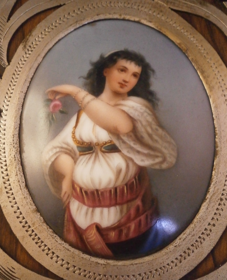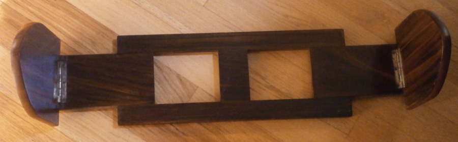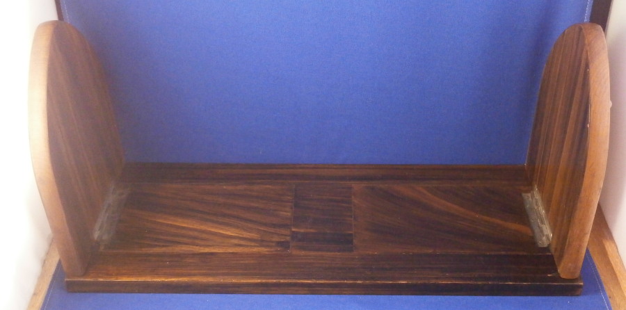 This is a really nice book slide with a porcelain plaque on either end. No idea where it was made but it is likely from the mid to late 19th century. The wood looks to be Coromandel / Calamander or at least something that looks like that. Either hinged end has a nice porcelain plaque to it - the one of the girl portrait looks to be fully hand painted while the one of the lady dancer has the outlines and the rest is hand painted. Each plaque is framed with some sort of silverish metal. It is a great looking piece for sure. Victorian era luxury items like this combined the newest inventions with the best artistic trends of the period to make some really fun items like this! The piece is in great condition with some wear from use but nothing that makes you cringe by any means :) It displays very well and is quite useful. In fact it will hold books in my office for now! The piece is 14 inches long, 5.5 inches deep and 6.625 inches tall when open. It can be extended to 22 inches. The underside has a bunch of glue residue so it likely had some velvet under it originally. Please email me for more information or other pictures.