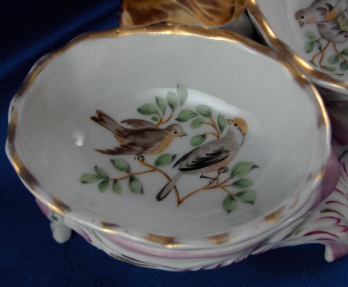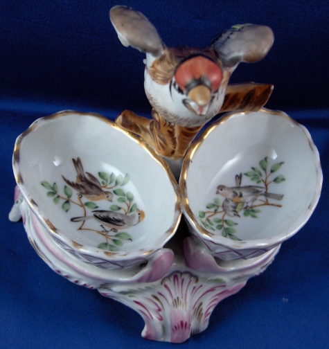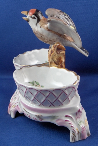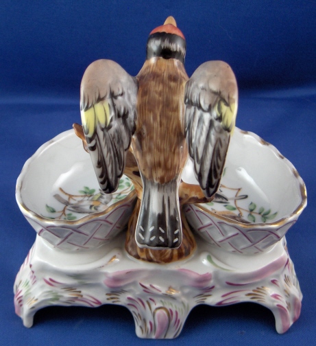 This is a spice dish made by Tata in the 19th century. This factory in Tata was only a decorating studio that painted Herend blanks and some Czech blanks as well. It was founded by Desider Fischer. The dish is nicely modeled with a bird in the center and a basket on either side with three feet as the base. It is handpainted very well and even has a bird scene on the bottom inside of each basket. The dish is marked underneath with Herend-like shield mark with the letter T underneath and an incised 11A. The dish is in great condition with one basket having a chip on the front that never actually came out. The entire piece is 4.75 inches tall, 5.25 inches wide and 3.75 inches deep. Please email me for more information or other pictures.