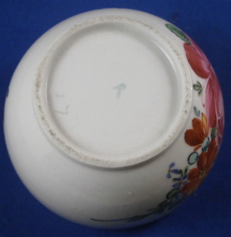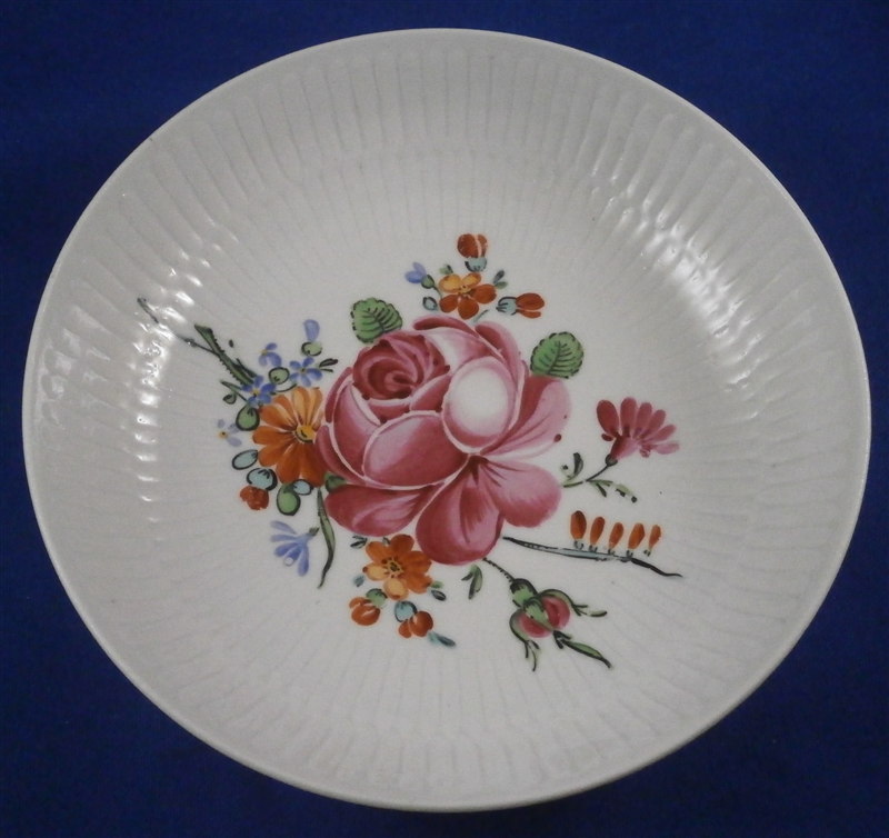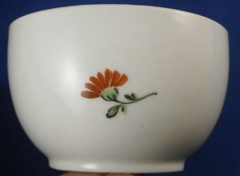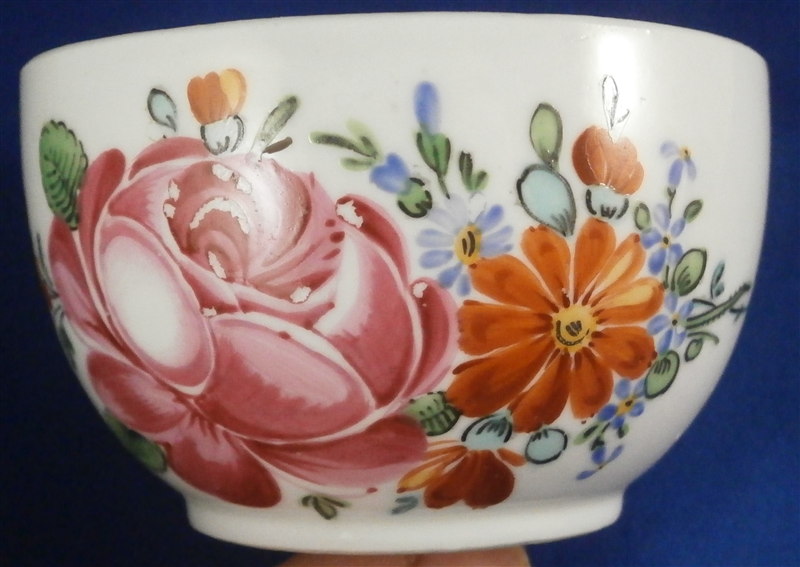 This is a teabowl and saucer made by Tettau in the 18th century. Tettau was founded by Wilhelm Heinrich Immanuel Greiner with Christian Friedemann Greiner (yes another bunch of the Greiner family!) with the help of the businessman Johann Friedrich Paul in 1794. They are still around today! This cup and saucer is handpainted with a large flower arrangement similar in style and quality to early Wallendorf or Rauenstein pieces and they have the ribbed design to the paste so typical of all the Thuringia makers. The cup is marked with an overglaze green T mark and the saucer with a black T mark. Both have an incised number 13 underneath as well. The set is in great condition with a bit of flaking to the pink color of the rose on the cup. The cup is 1.75 inches tall and 3 inches in diameter and the saucer is 1.25 inches tall and 5.125 inches in diameter. Please e-mail me for more information or photos.