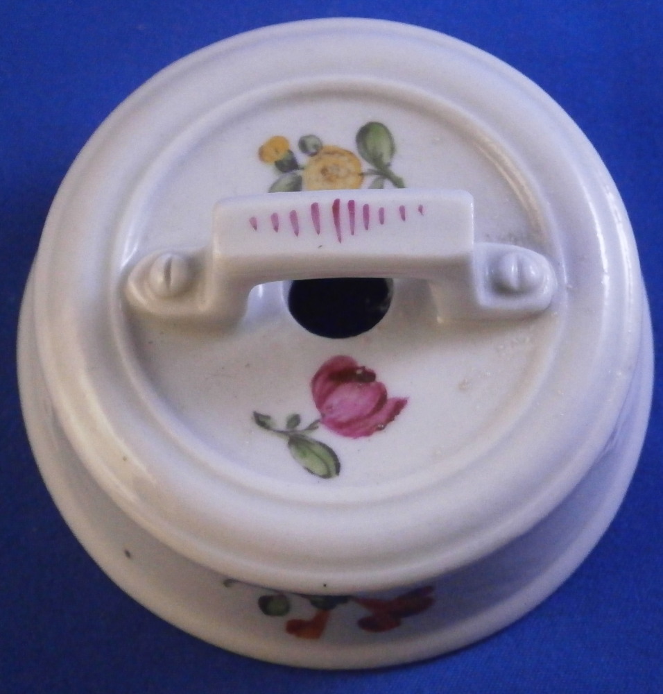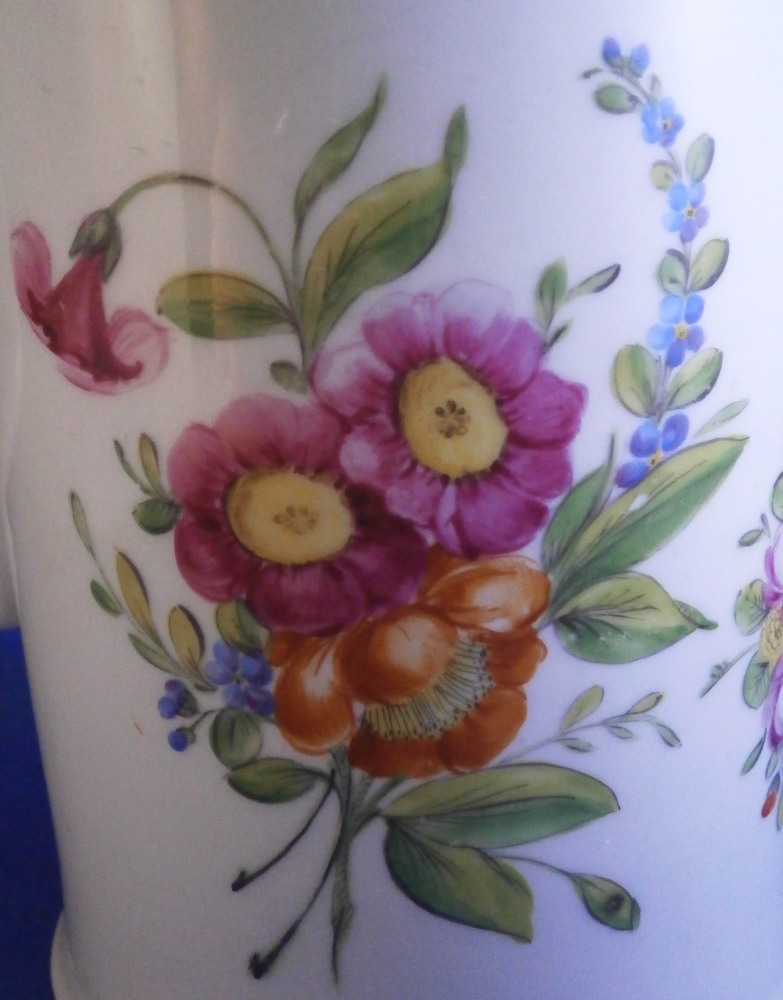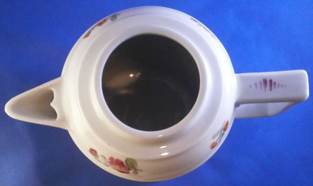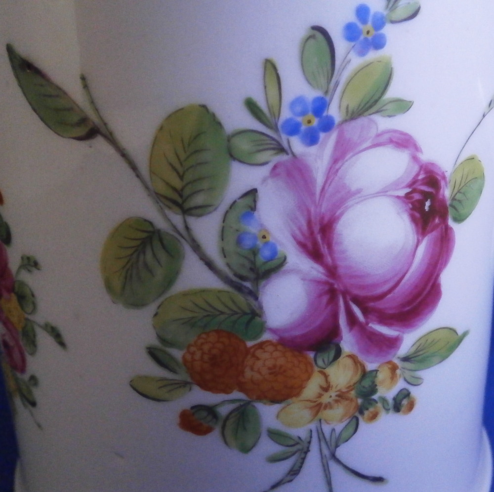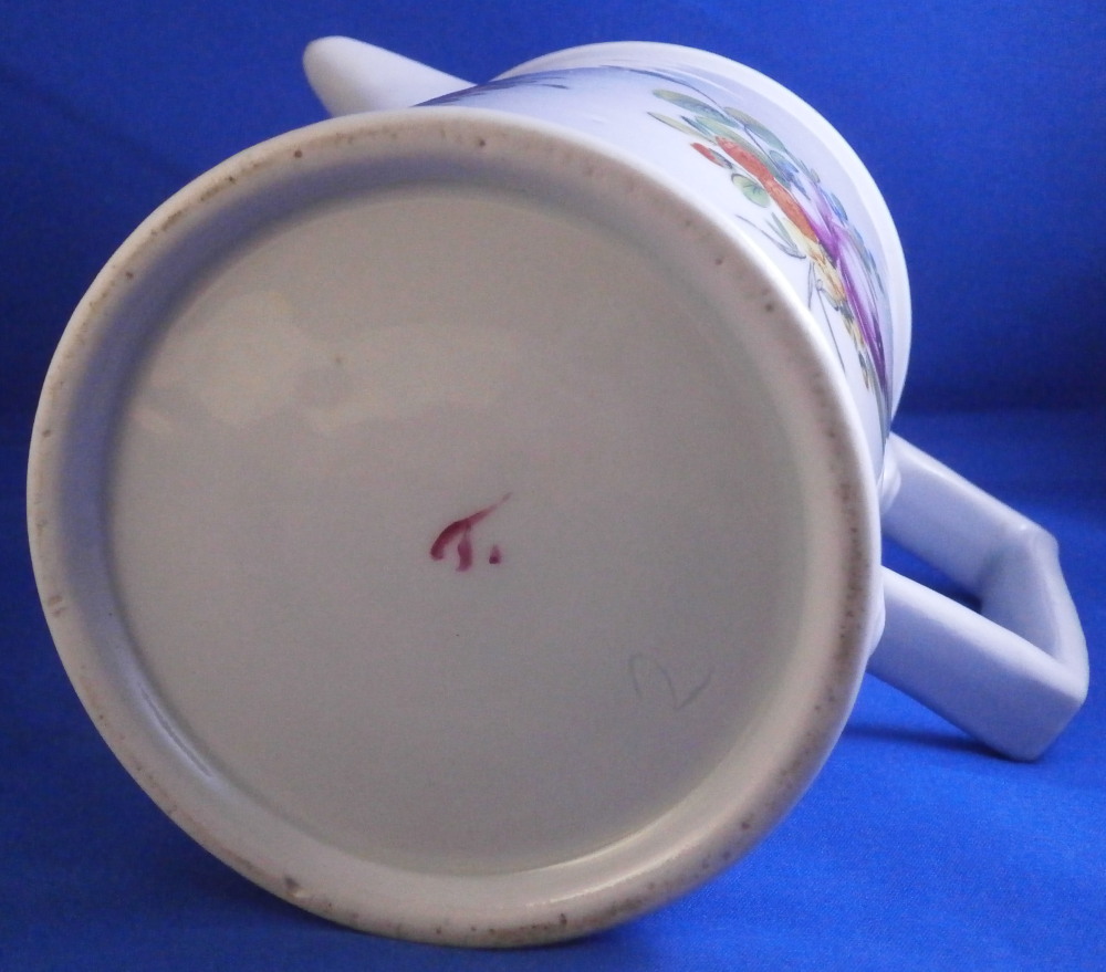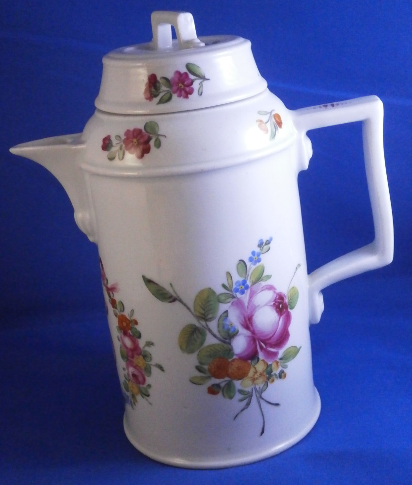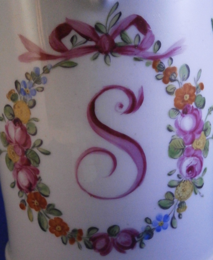 This is a really nice coffee pot made by Tettau in the 18th century. Tettau was founded in the Thuringis region around 1794 by two Greiner family members who also founded Kloster Veilsdorf. The company was granted a license for 15 years from the King of Prussia. They are still around today as far as I know which is an amazing feat. The style of the pot is in the typical classicism style of this period. One of my personal favorites with the fake screws holding the handles in place. The pot is hand painted with a large letter S in puce surrounded by a floral wreath held together at the top with a puce bow. Each side has a large floral arrangement to it with four small flowers along the top edge. Nice spout shape and a bit of puce trim to the handle. The lid has three flowers along the edge and two more on top plus a touch of puce trim to the handle. It's a nice piece for this maker and larger than any I ahve come across over the years. A great example! The pot and lid are in perfect condition with the usual minor firing flaws. It is marked underneath with the puce letter T. and an incised number 2. The pot and lid are 7.75 inches tall, 6.5 inches from handle to spout and 4 inches in diameter. Please email me for more information or photos.