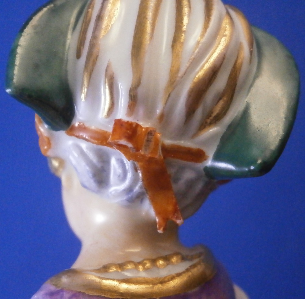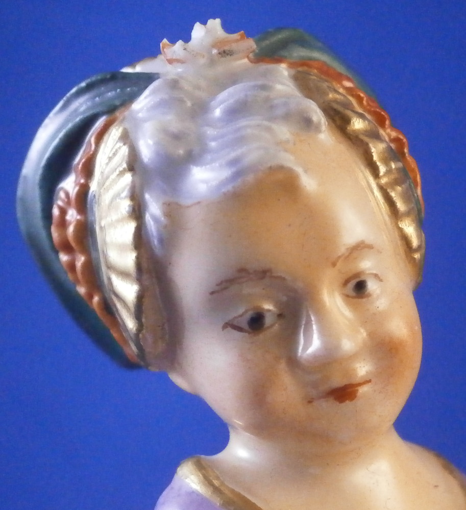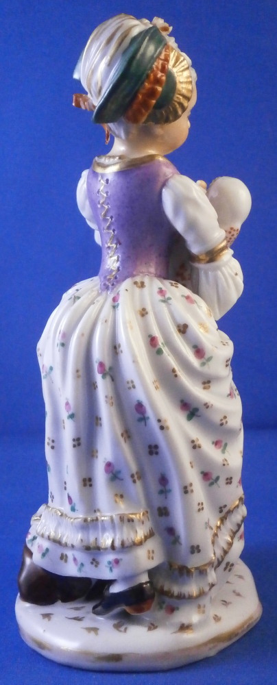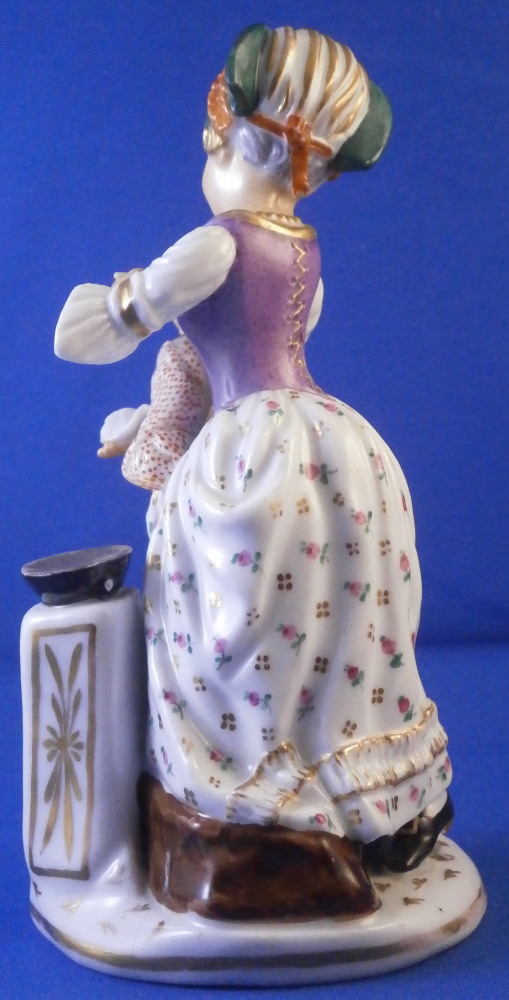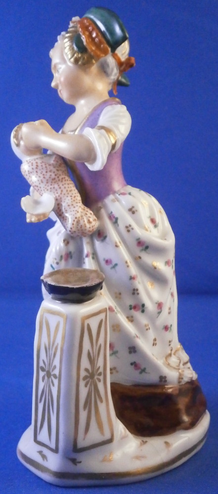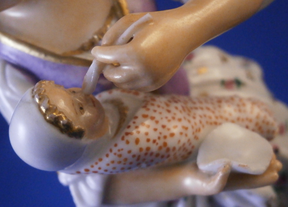 This is a really nice figurine made by Klösterle / Thun in the mid 19th century. The mark was used from 1839 until 1870. The company was started in 1794 by the order of Count F.J. Thun by Nicolaus Weber and the arcanist Sonntag. It changed hands a few times and is actually still around today. The figurine is unlike any other I could find in terms of quality and the fact that it is glazed. It's a really nice figure of a mother / lady feeding her baby. The lady is waering a fancy outfit - an interesting hat as well as a dress with the baby being wrapped in a ncie blanket. The spoon is easily identifiable though I am not sure what the white thing is in her other hand - possibly a tissue or wipe. There is a bowl standing on a column and the base is simple and flat with gold sprigs painted on it. A great looking figurine and not something you'll find again anytime soon by this maker! The figurine is 5.5 inches tall, 2.875 inches wide and 2.25 inches deep. It is in good condition with a touch of wear to the gilding, damage to the bow on top of her head and in the back of her head as well as a chip to the bowl on the column as shown. None of these are distracting and the piece displays very well! Marked with the impressed TK mark as well as the number 77 and an O or a zero as shown. Please email me for more information or photos.
