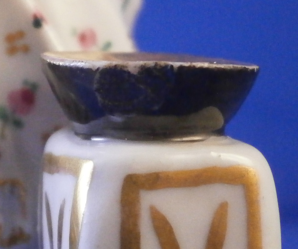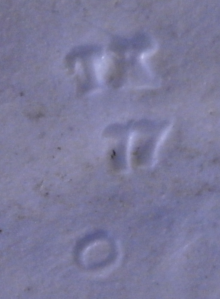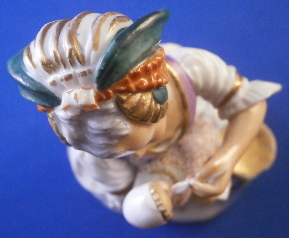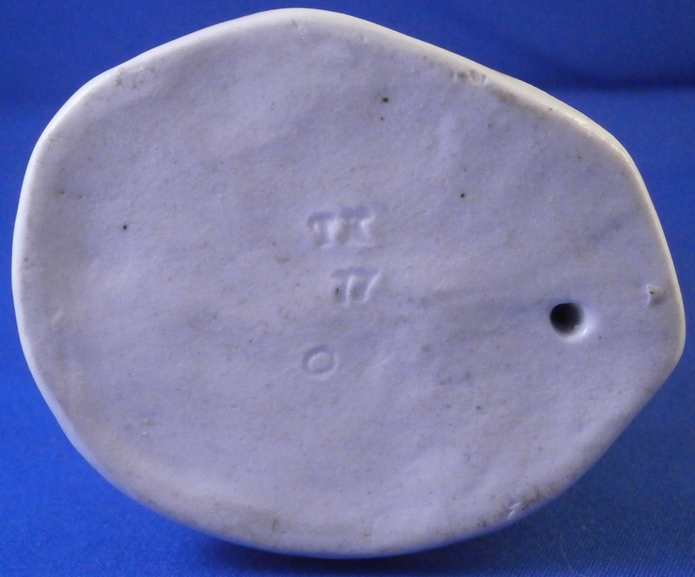 This is a really nice figurine made by Klösterle / Thun in the mid 19th century. The mark was used from 1839 until 1870. The company was started in 1794 by the order of Count F.J. Thun by Nicolaus Weber and the arcanist Sonntag. It changed hands a few times and is actually still around today. The figurine is unlike any other I could find in terms of quality and the fact that it is glazed. It's a really nice figure of a mother / lady feeding her baby. The lady is waering a fancy outfit - an interesting hat as well as a dress with the baby being wrapped in a ncie blanket. The spoon is easily identifiable though I am not sure what the white thing is in her other hand - possibly a tissue or wipe. There is a bowl standing on a column and the base is simple and flat with gold sprigs painted on it. A great looking figurine and not something you'll find again anytime soon by this maker! The figurine is 5.5 inches tall, 2.875 inches wide and 2.25 inches deep. It is in good condition with a touch of wear to the gilding, damage to the bow on top of her head and in the back of her head as well as a chip to the bowl on the column as shown. None of these are distracting and the piece displays very well! Marked with the impressed TK mark as well as the number 77 and an O or a zero as shown. Please email me for more information or photos.