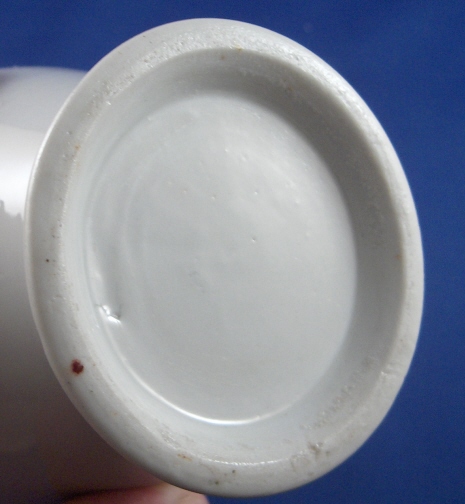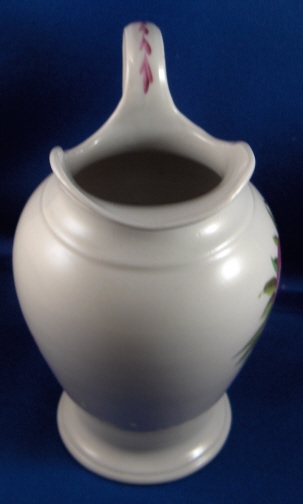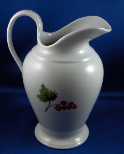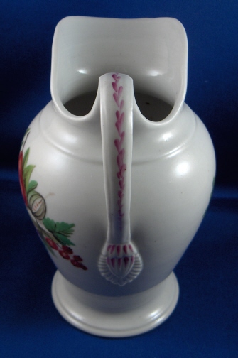 This is a porcelain pitcher made by one of the Thuringia makers in the late 18th century. I am thinking Limbach myself. The paste is very grey which is typical for this region and the handpainted design of fruit and veggies is a bit primitive. Lots of charm to these pieces and they are highly collectible. The one side has a red current painted on it and the other a large design of currents, asparagus, a peach?, pear, gooseberry and some radishes. The handle has a nice design to the bottom and is painted with in puce. The piece is in perfect condision with a few small scratches to the pear and peach but nothing that takes away from the piece. It is 6.5 inches tall and 3.75 inches in diameter. Sadly it is unmarked but certainly 18th century and from the Thuringia region! Please email me for more information or photos.