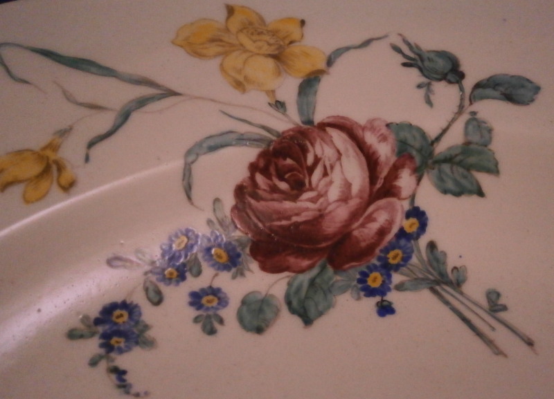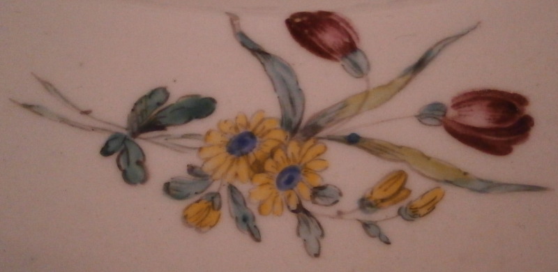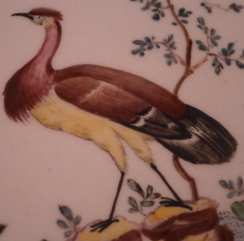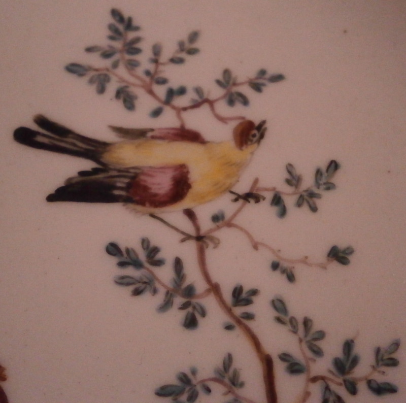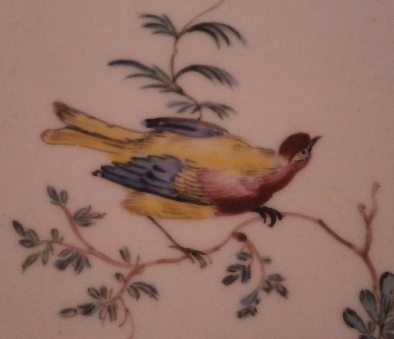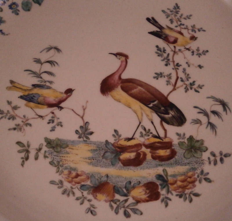 This is a really nice plate made made by Tournai ( Tournay ) in the 18th century. It is hand painted with a superb polychrome bird scene in the center including three birds in a landscape surrounding as well as a nice floral arrangement on the side of the well onto the rim, a smaller arrangement on the rim as well as a single flower. I ahve never seen the combination bird scene and floral arrangement by them and it is stunning! Brownish trim to the nicely shaped edge. The bird scenes are quite hard to find and very collectable especially when painted by the famous Henri-Joseph Duvivier which I don't think this piece here was though I am not an expert on that sort of thing. The piece is made of soft paste porcelain and a beautiful creamy white color with a greenish translucency typical for this maker. The plate is in as nice a condition as one could hope for. Just stunning! It is marked underneath with their factory mark of two swords with four plus signs all around as shown. The piece is 1.25 inches tall and 9.5 inches in diameter. Please email me for more information or other pictures.