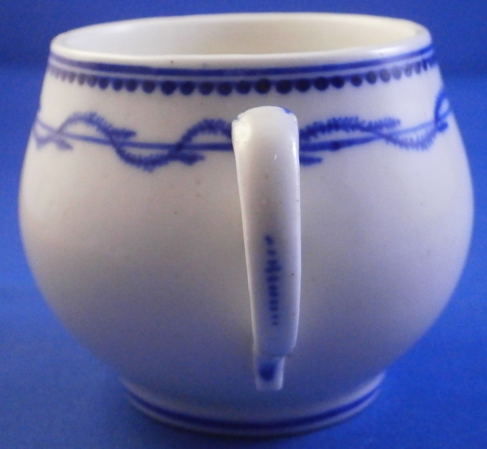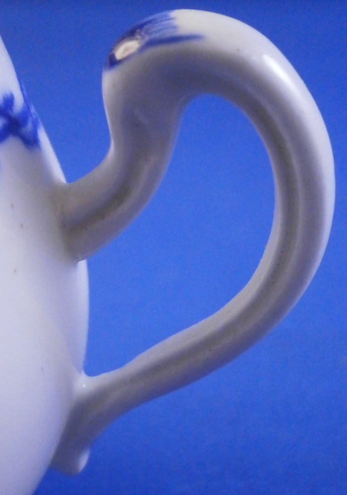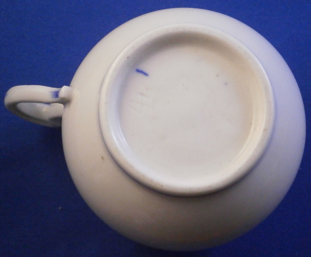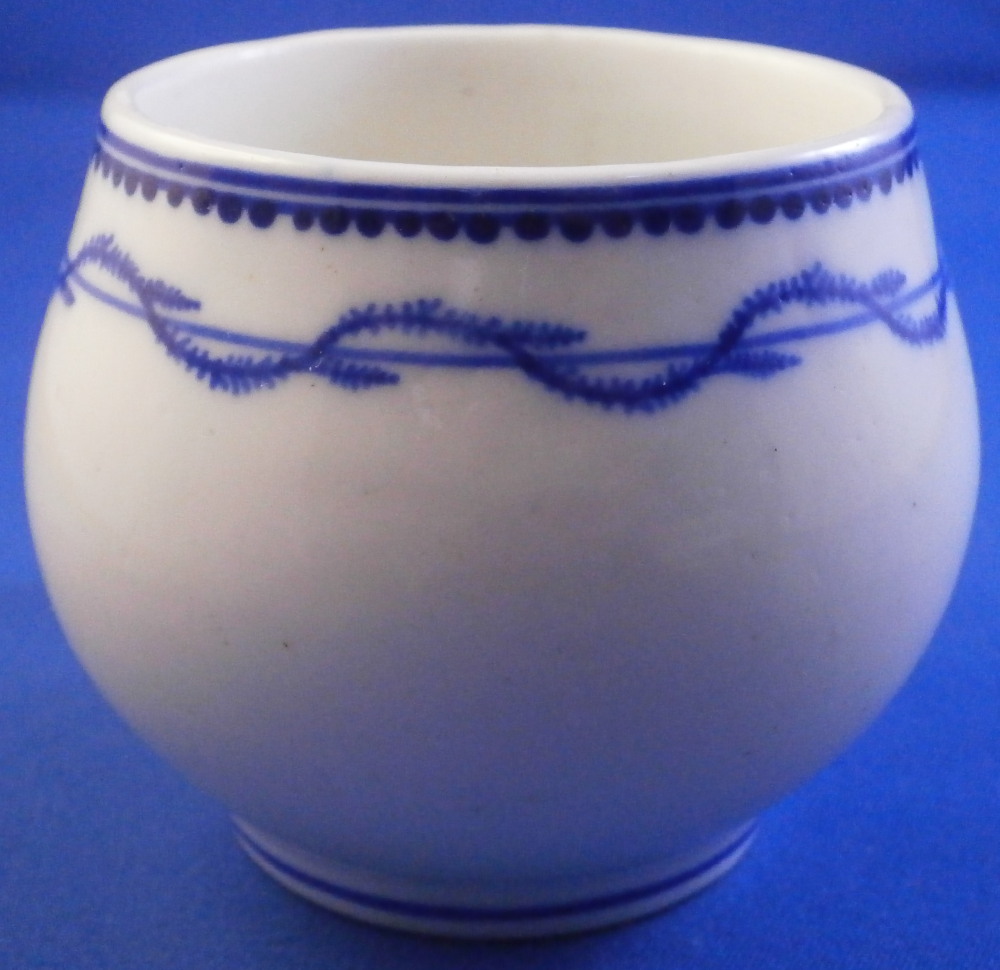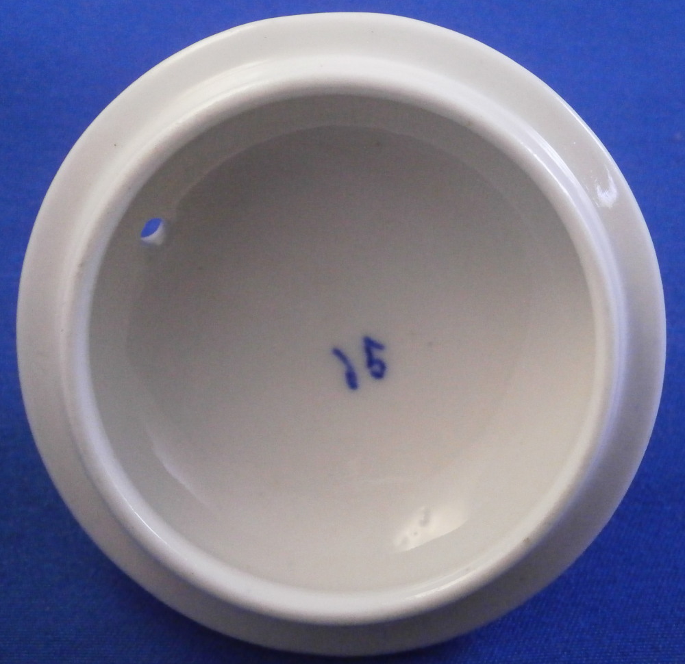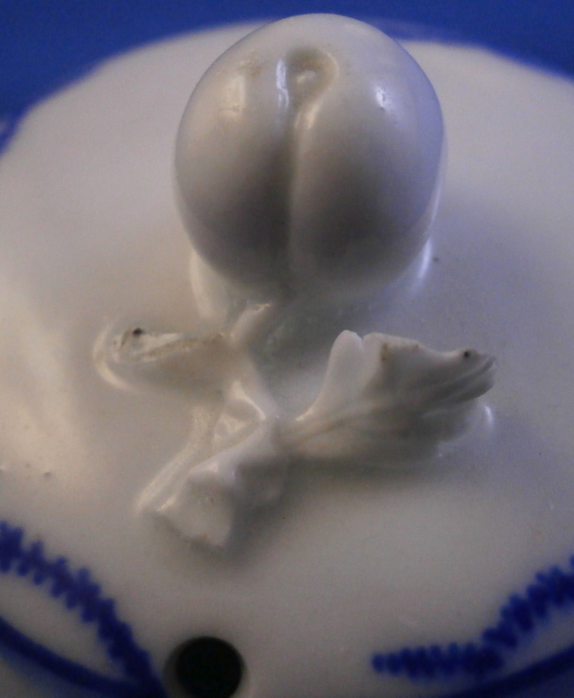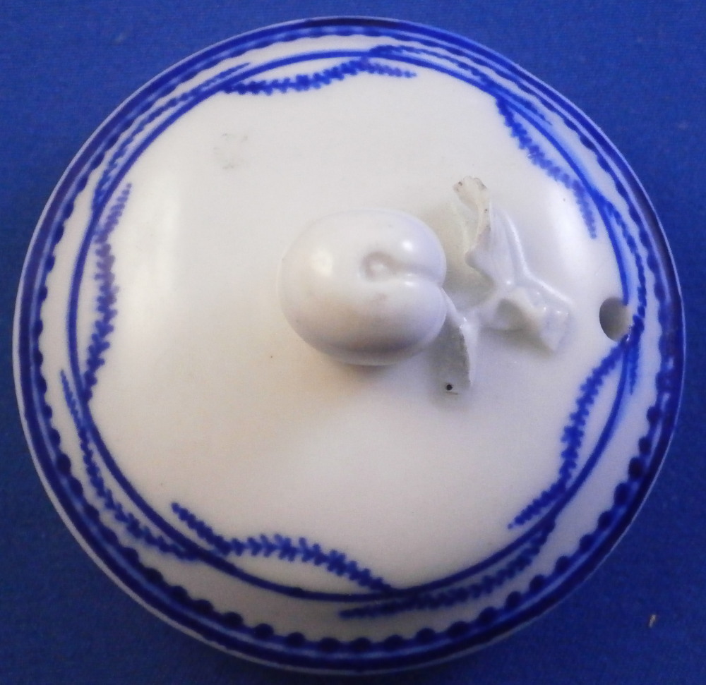 This is a great pot de creme ( lidded chocolate cup ) or pot au jus or lidded custard cup made by Tournai in the late 18th century. It is made of soft paste porcelain and was hand painted with a very nice and quite typical blue design all around the top of the main body and the lid with a blue line trim to the bottom of the piece and a bit of blue trim to the handle wich has their typical shape. The lid has a nice fruit finial to it and a little hole in it for venting steam. This pot and lid are in good condition with the leaves of the finial being damaged. One is pretty much gone and the other one is chipped. Still looks great. Both pieces are marked underneath with some blue numbers as shown. A 15 under the lid and 1 and an incised 4 under the main body. The cup and lid are about 3.25 inches tall and 2.5 inches in diameter with the handle sticking out about 0.75 inches. These pieces are becoming very hard to find these days! Please email me for more information or other pictures.
