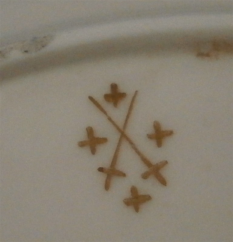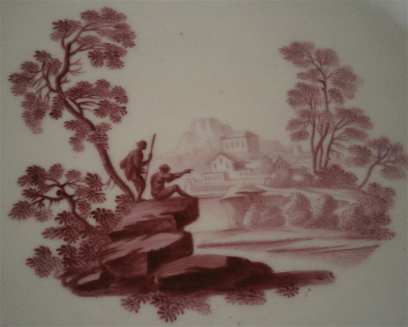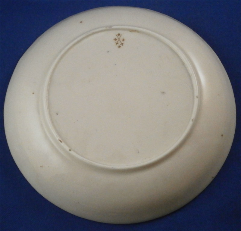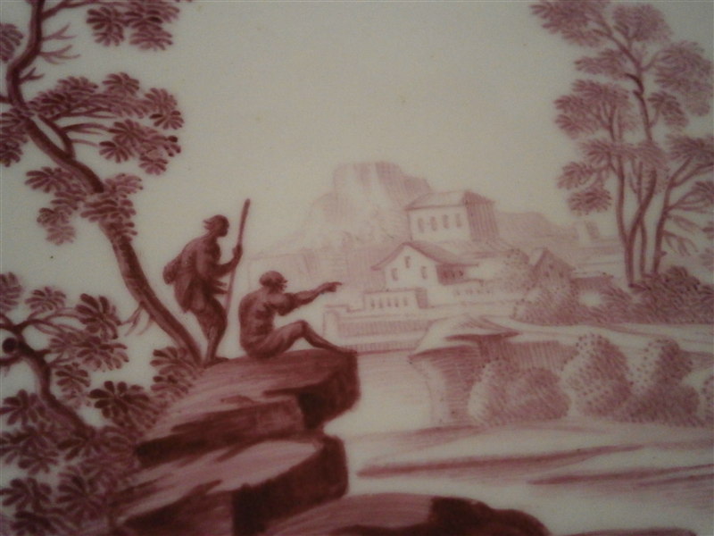 This is a superb saucer made made by Tournai ( Tournay ) in the 18th century. It is hand painted with a puce scene including two people, a building, some trees and rocks and so on with a gold trim to the edge. This piece was most likely painted by the famous Henri-Joseph Duvivier (during 1763-71) who is very well known for his puce scenic pieces and fits his painting style perfectly. The underplate is made of soft paste porcelain and a beautiful creamy white color. It is in perfect condition which is rare with barely an signs of use. The saucer is marked underneath with the gold crossed swords mark with the little crosses all around as well as some incised marks by the foot ring. It is 0.875 inches tall and 5.25 inches in diameter. Please email me for more information or other pictures.