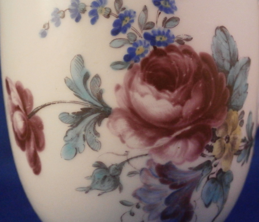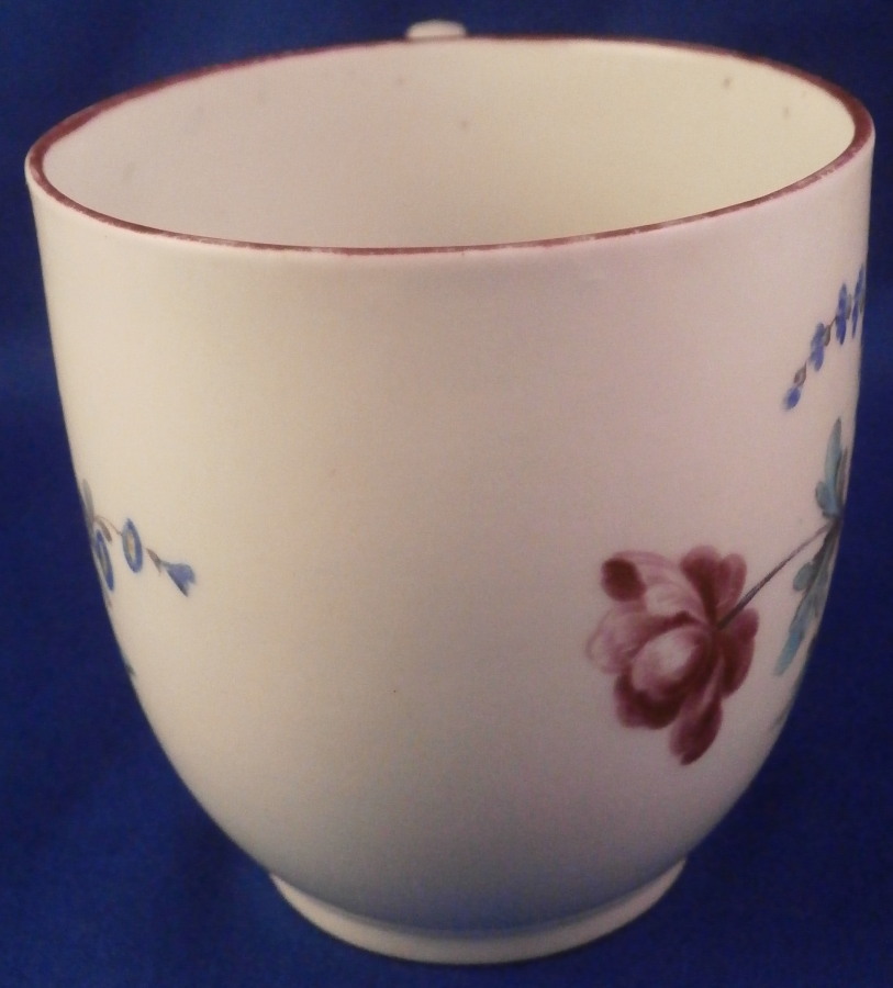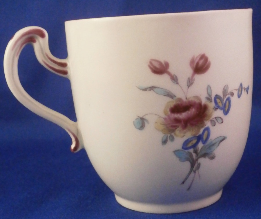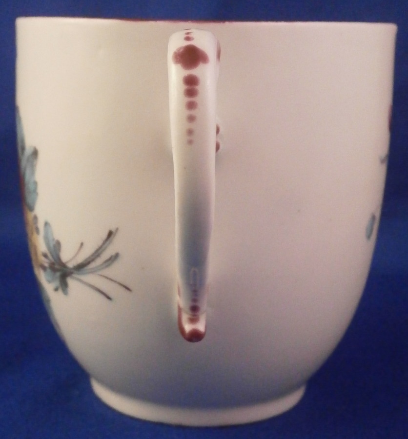 This is a superb floral cup made by Tournai in the 18th century. Made of soft paste porcelain and hand painted with a their best quality flowers using their polychrome enamels which look amazing. A large arrangement to on side and a smaller one to the other plus a bit of puce trim to the edge and handle which is in their typical shape. Softpaste porcelain and the painting done on it is stunning. Much nicer than the hard paste porcelain from most other makers. Sadly it was harder to deal with and it did not make commercial sense to keep going and thus hard paste porcelain won. Thus a soft paste piece is a must have for any collector :) Sadly just a single cup but still very rare and I am sure one could find a matching saucer! The cup is in good condition with some wear to the glaze comon to soft paste peices and a crack across the bottom handle terminal - an issue that is quite common on all 18th century cups. Not sure why that is. The piece is not marked underneath which is common to Tournay pieces of this period but has the typical green translucency and moons, etc. The cup is 2.875 inches tall and 2.75 inches in diameter. Please email me for more information or other pictures.