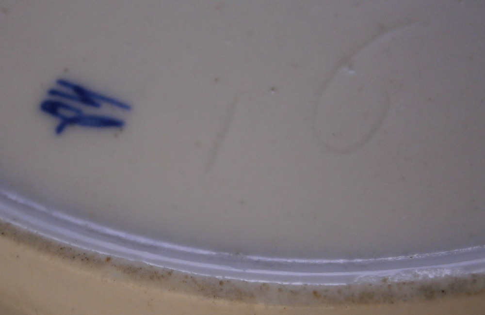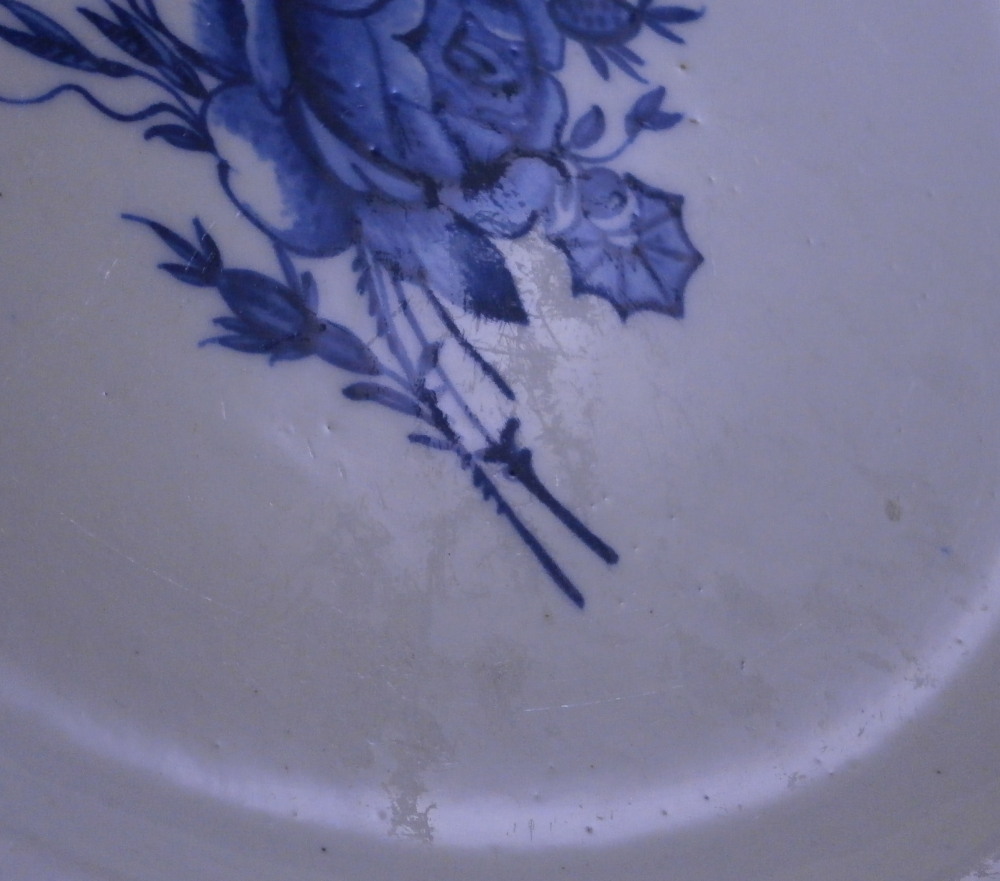 This is a superb plate made by either Arras or Tournai in the 18th century. Made of soft paste porcelain it does have the usual green translucency common to these two makers. It is hand painted with a nice floral arrangement in the center two two flowers and three bugs along the nicelyIt is a nicely done piece! The plate is in good condition with a some wear to the glaze common to soft paste porcelain but since the blue is under glaze it displays perfectly. Some minor manufacturing flaws normal to early porcelain but none that take away from the piece. The piece is marked underneath with a blue mark that could be a script hd but it's hard to make out plus and incised number 16 as shown. The plate is1.25 inches tall and just over 10 inches in diameter. Please email me for more information or other pictures.