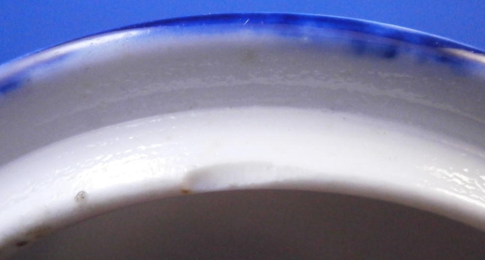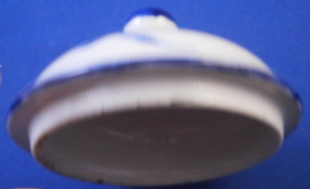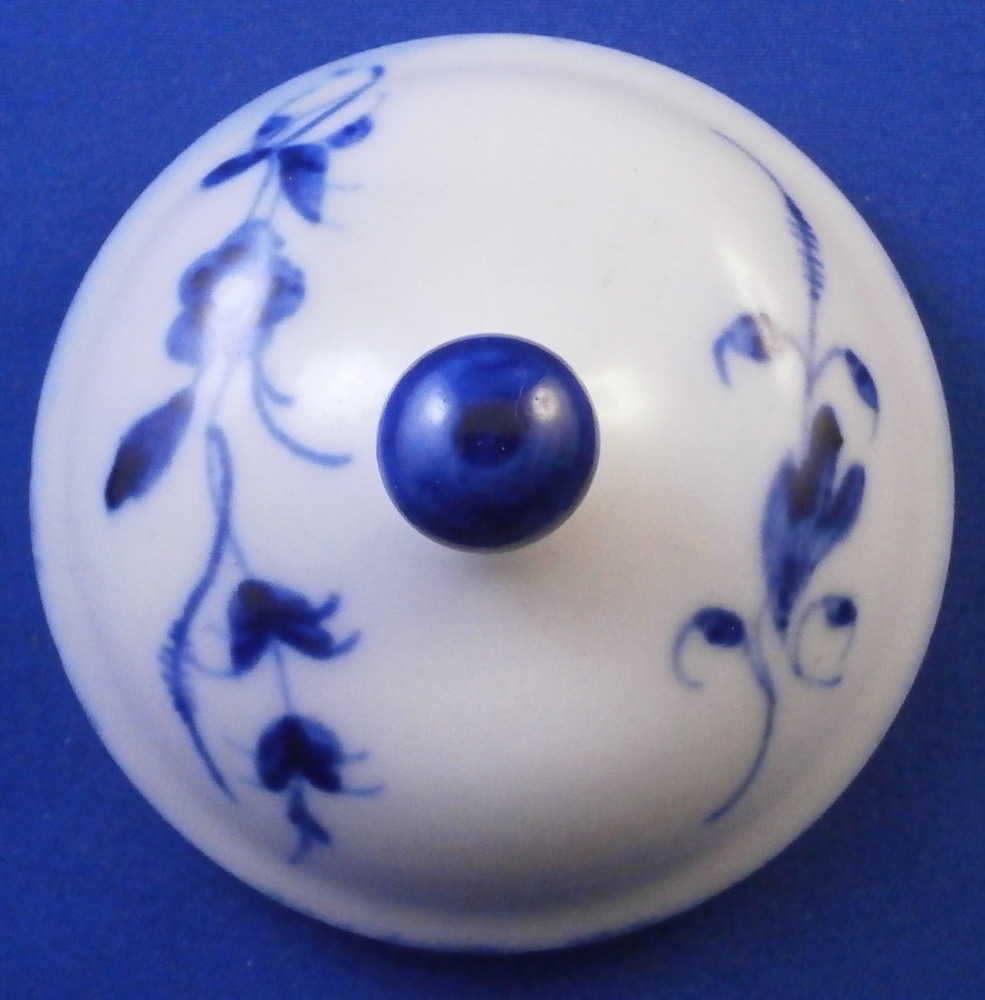 This is a pot de creme ( hot chocolate cup) lid made of soft paste porcelain in France in the 18th century. I originally thought it might be for a Tournai or Arras piece but their finials are usually in the shape of a fruit so now I think it is more likely for a Mennecy or Chantilly cup. It could be another maker but not that many made soft paste porcelain. Definitely from the late 18th century. It is hand painted with blue flowers in a pattern called brindilles bleue or just brindille . It is a fairly common pattern among French makers of the 18th century. The lid has two floral designs to it, a bit of blue to the top of the finial and a blue trim along the edge. It is in perfect condition with just some roughness to the ring that would sit inside the cup from when it was made. The lid is 1.125 inches tall without the ridge that sits inside the lid and has a diameter of 2.5 inches. The outer diamter of the ring that would sit inside the cup is just a tiny bit over 2.125 inches. Unmarked which is normal but makes it hard to ID. It would fit any maker of this period of this pattern quite nicely!Please email me for more information or other pictures.
