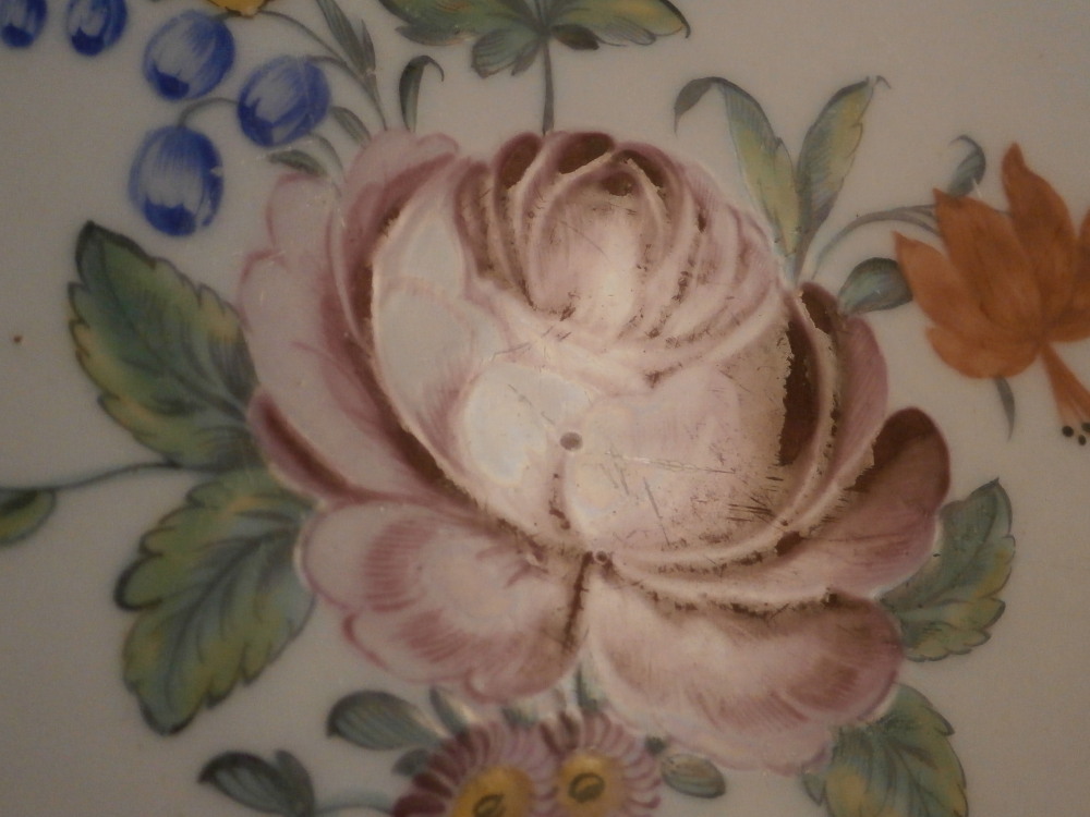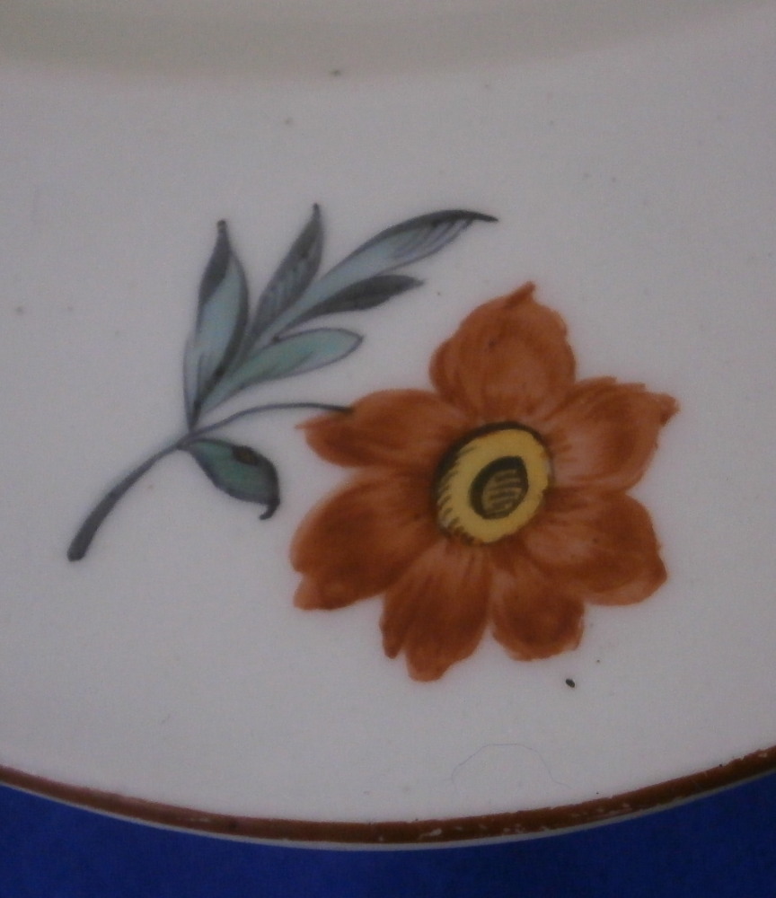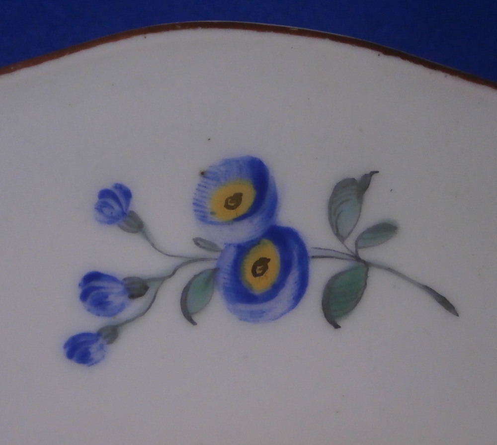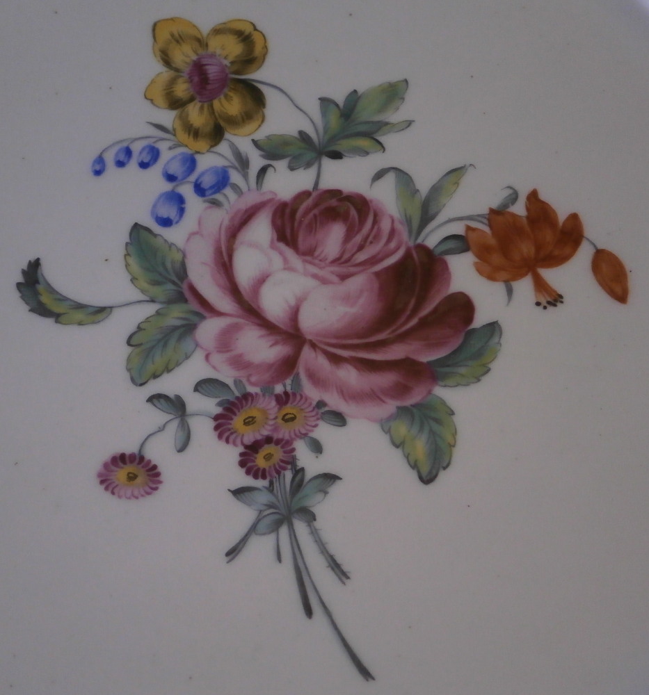 This is a really nice plate made by Tournai in the 18th century. It is made of soft paste porcelain and hand painted with a nice polychrome floral arrangement in the center as well as four single flowers along the rim. Nicely shaped edge with a reddish brown trim to the edge. I think Tournay flowers are among the very nicest of the porcelain world. They are amazing and the soft paste porcelain and its enamels are just perfect. Very hard to find. Soft paste porcelain is so much nicer than the more modern hard paste. The plate is in great condition without any chip, repairs, etc. with some minor use marks common to soft paste. It displays perfectly. The piece is not marked underneath except for an incised O as shown which is fairly normal on Tournay pieces of this period but has the typical green translucency and so called moons. The plate is 1 inch tall and 9.25 inches in diameter. Please email me for more information or other pictures.